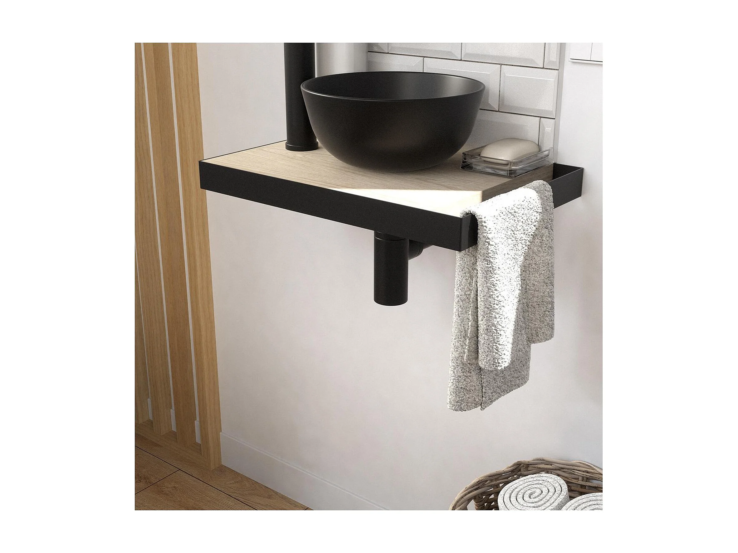 Meuble lave-mains plan fin porte-serviettes côté + vasque noire + robinet + miroir