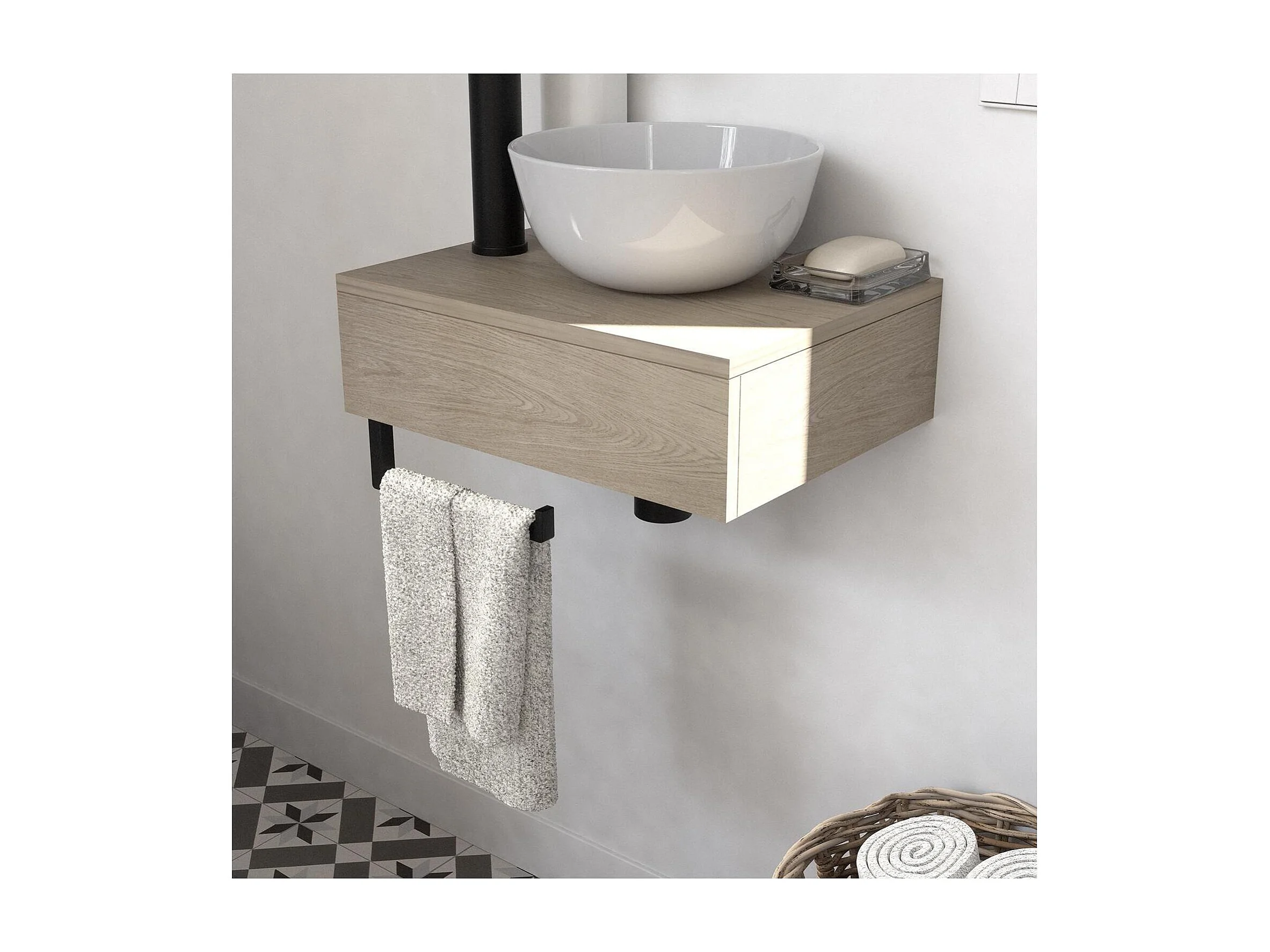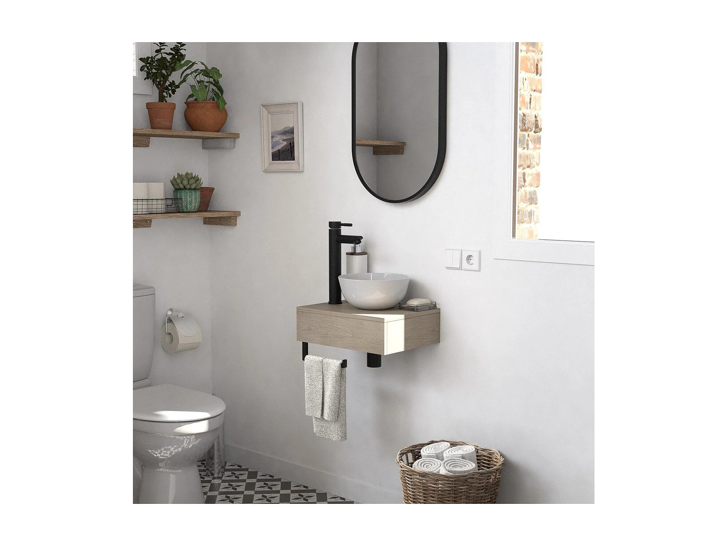Meuble lave-mains plan fin porte-serviettes dessous + vasque blanche + robinet