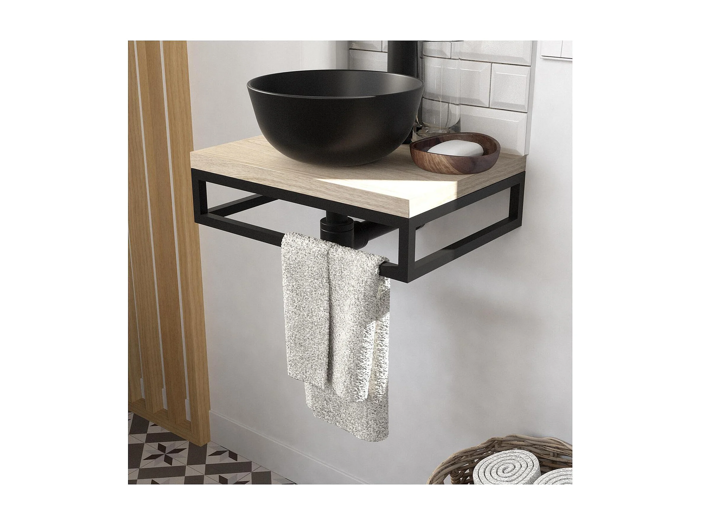 Meuble lave-mains plan fin porte-serviettes dessous + vasque noire + robinet + miroir