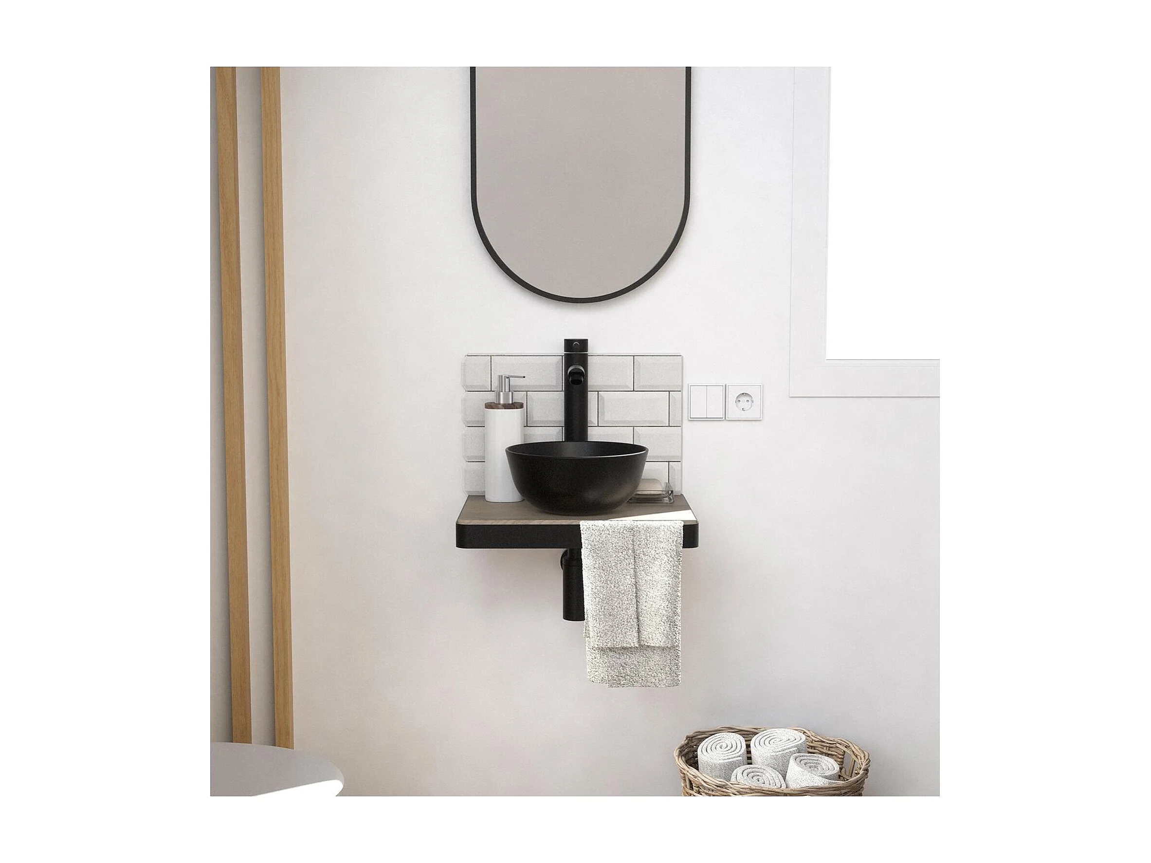 Meuble lave-mains plan fin porte-serviettes face + vasque noire + robinet + miroir