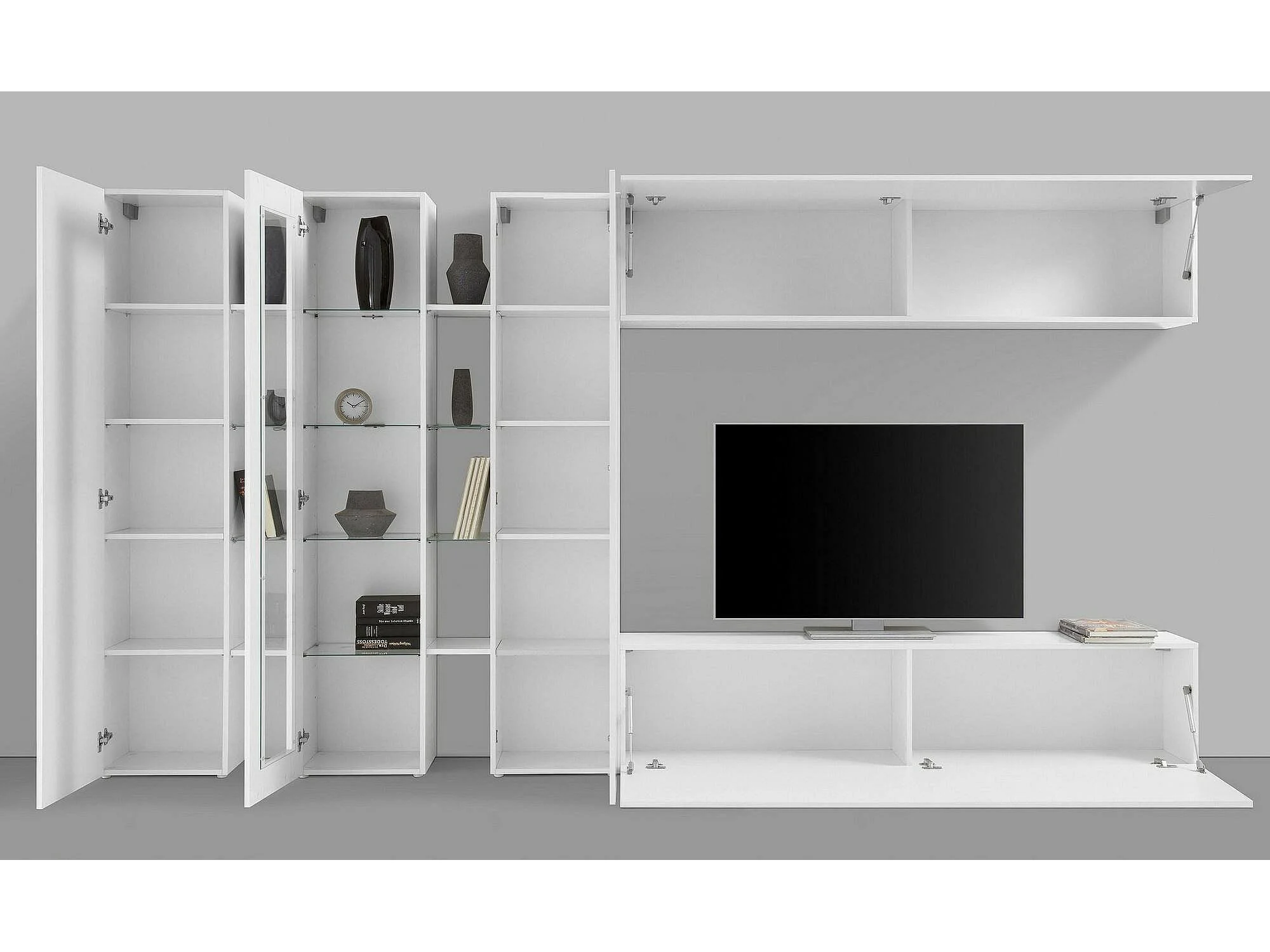 Élément mural Darcadi, meuble TV 3 portes, Meuble de salon polyvalent avec lumière LED, 100% Made in Italy, 340x30h180 cm, Blanc brillant