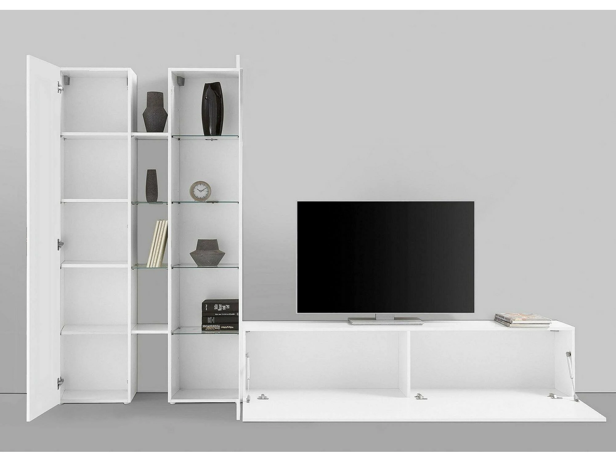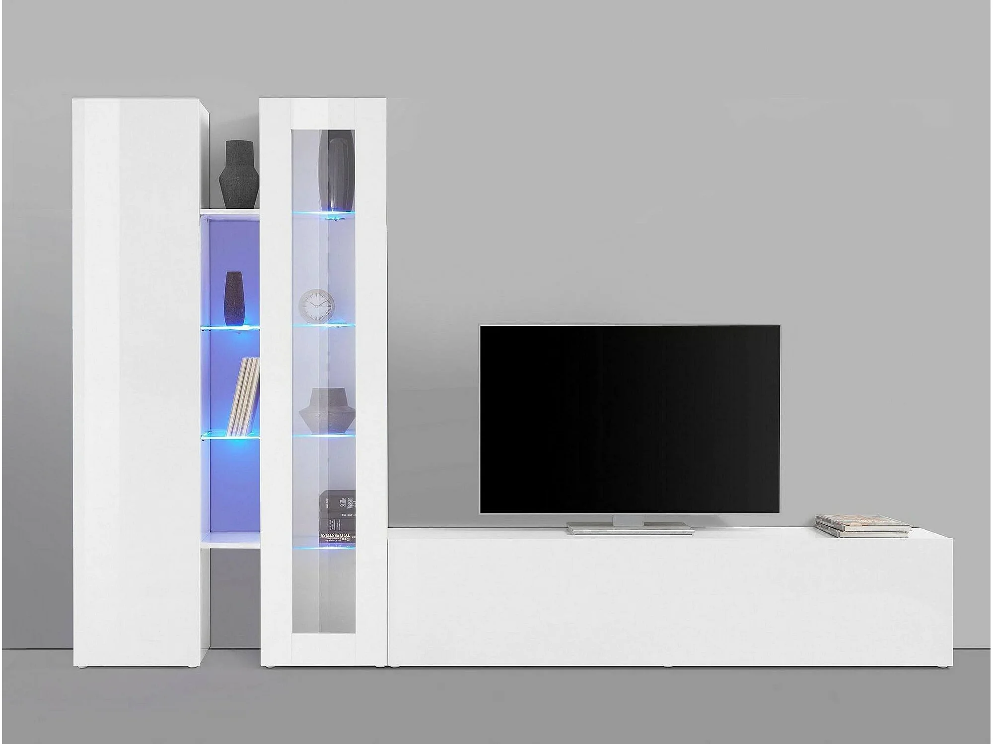 Élément mural Dcau, meuble TV 3 portes, Meuble de salon polyvalent avec vitrine et lumière LED, 100% Made in Italy, 280x30h180 cm, Blanc brillant