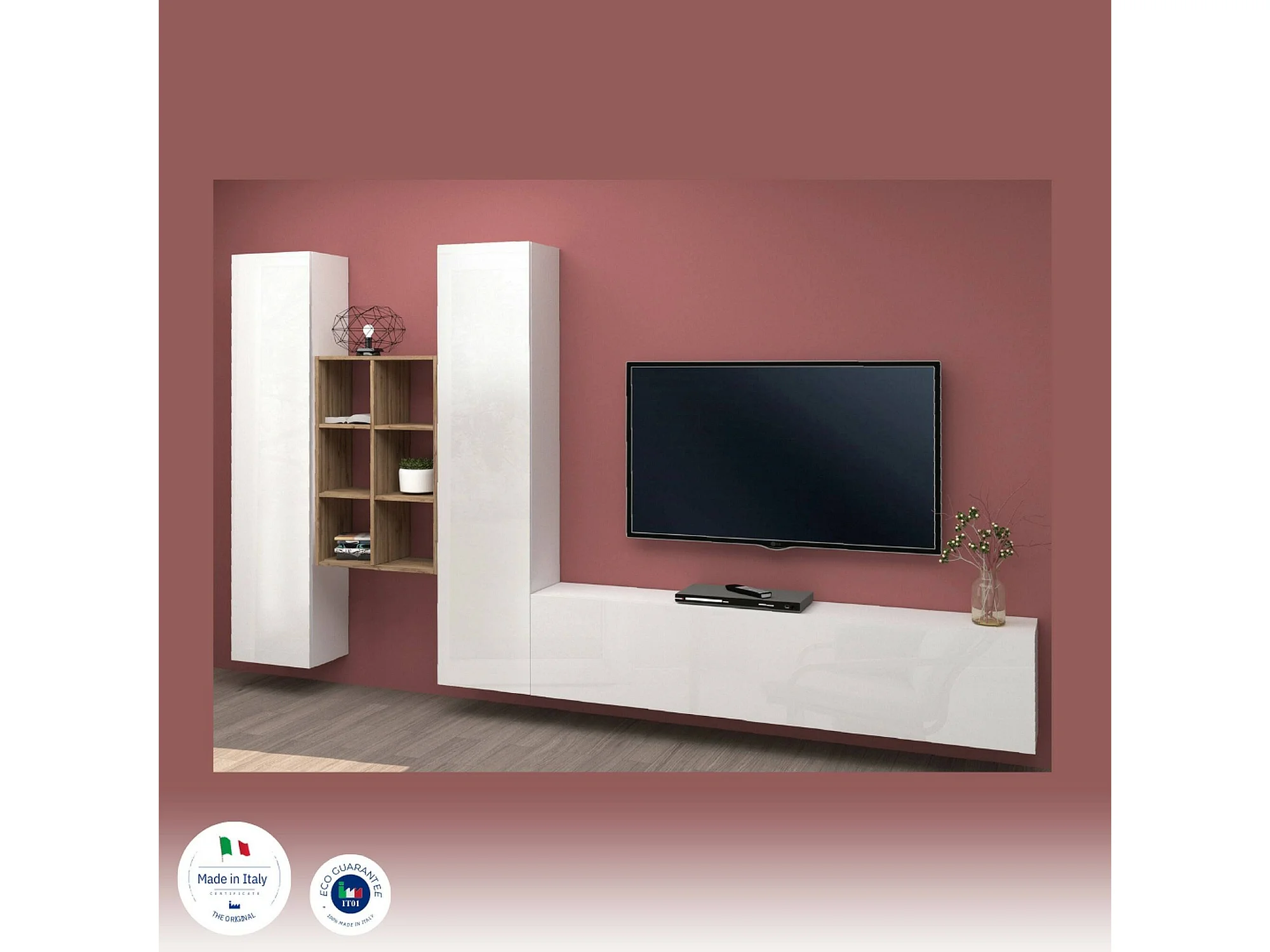 Élément mural Dcola, meuble TV 3 portes, Meuble de salon polyvalent, 100% Made in Italy, 320x30h180 cm, Blanc brillant et érable