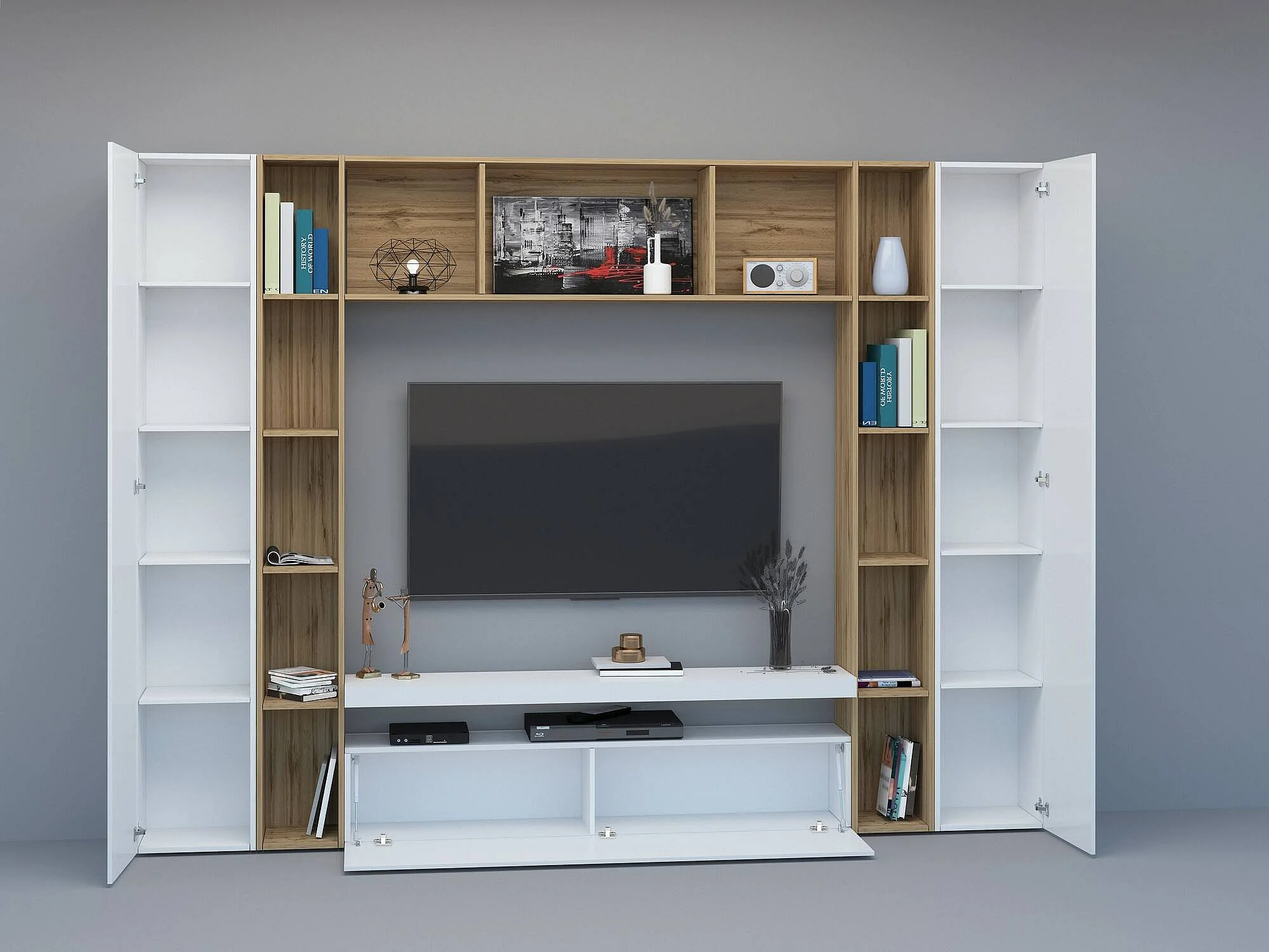 Élément mural Ddragon, meuble TV 3 portes, Meuble de salon polyvalent, 100% Made in Italy, 270x35h210 cm, Blanc brillant et chêne