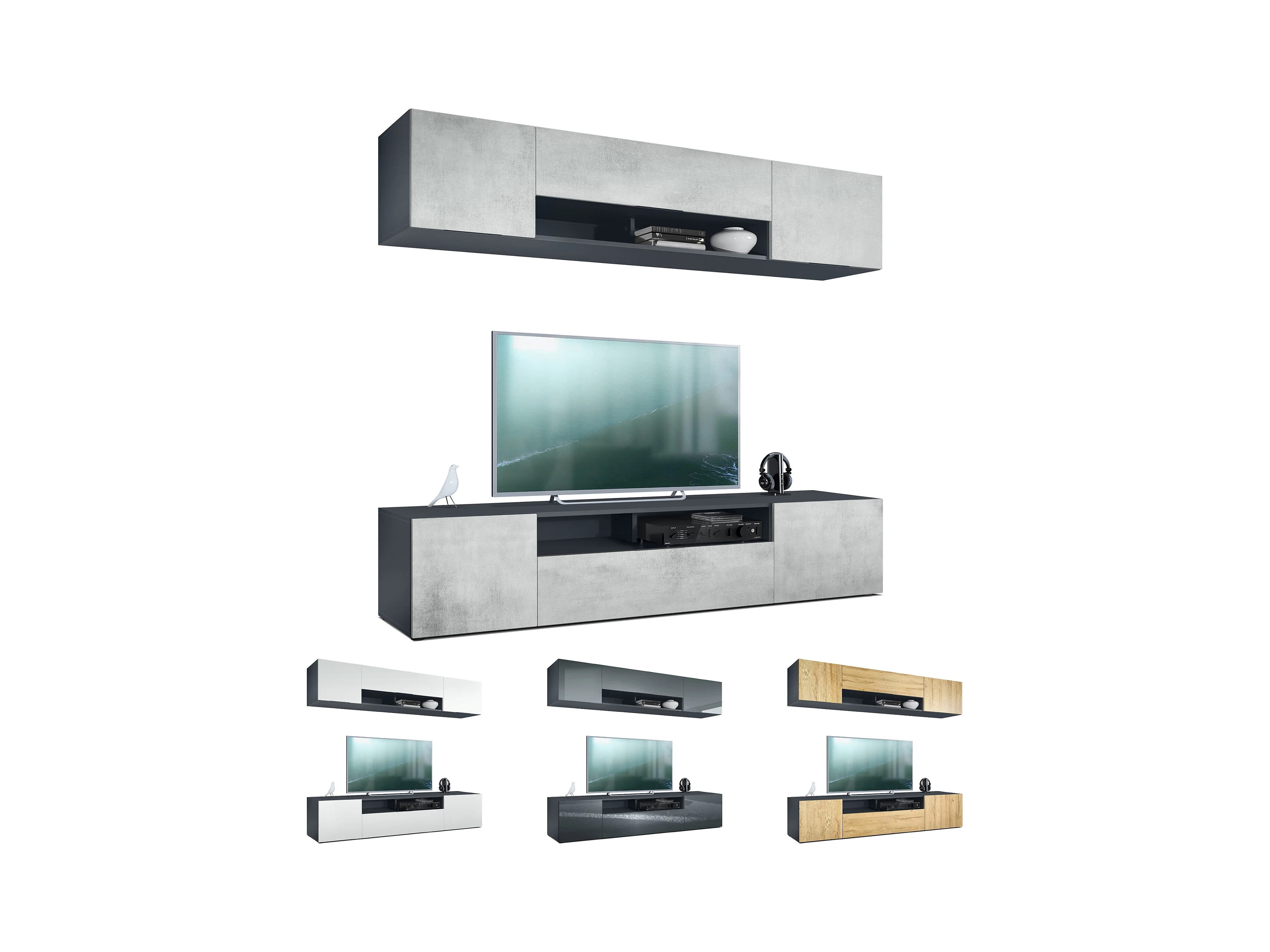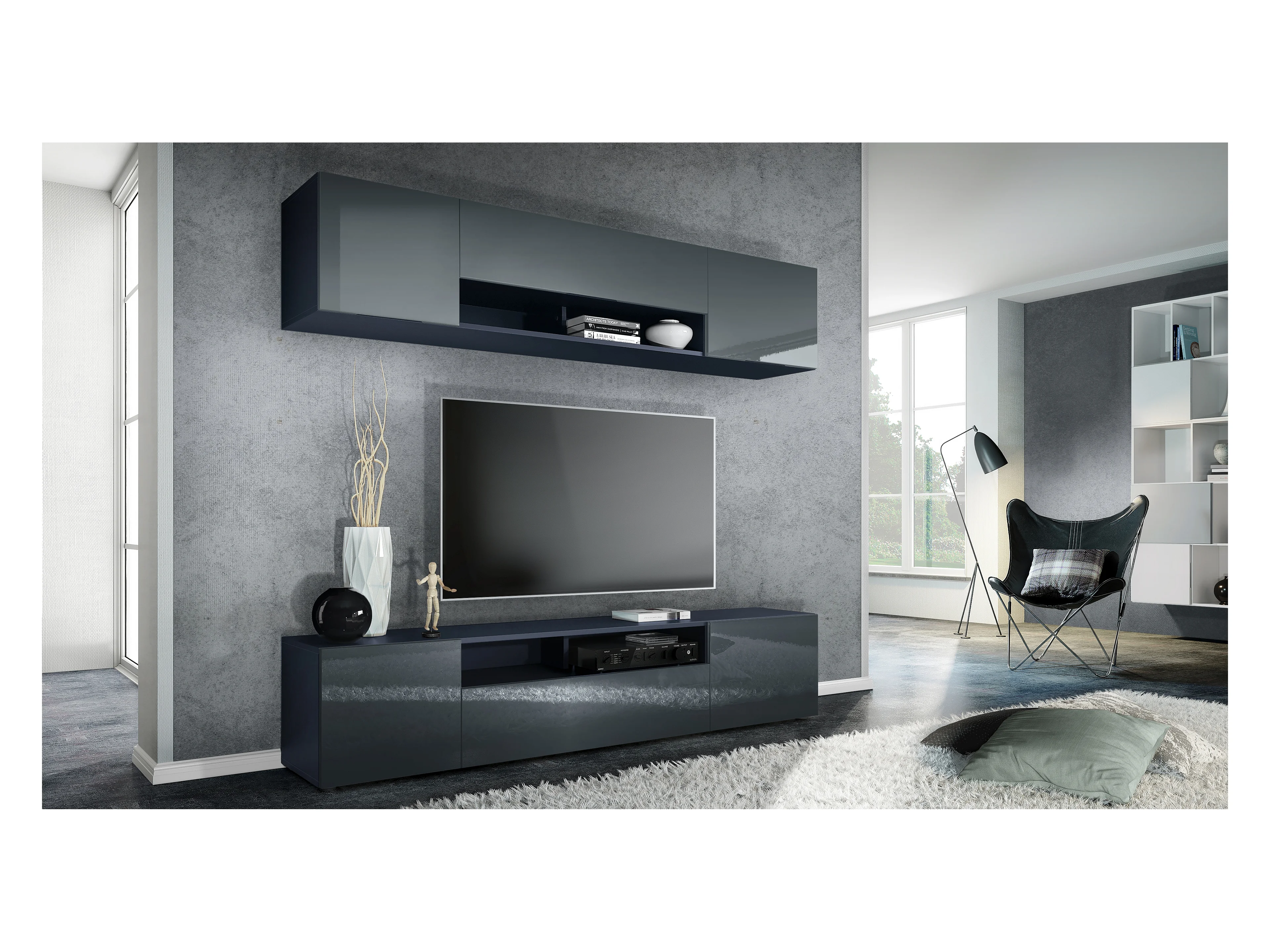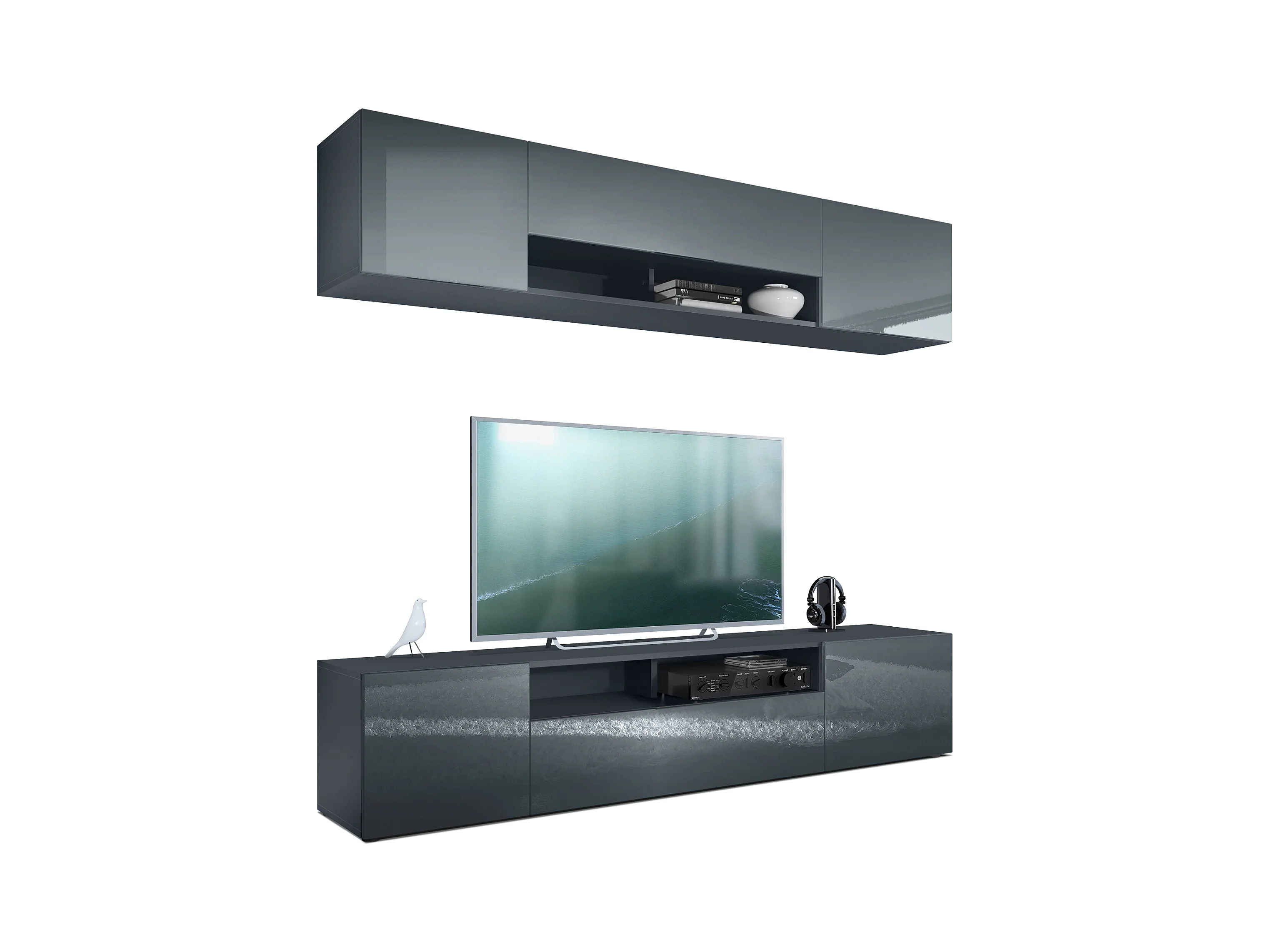 Meuble mural de salon Mogan avec deux éléments de 181x39x35 cm, meuble mural de salon suspendu avec 12 compartiments, Anthracite mat/Gris brillant