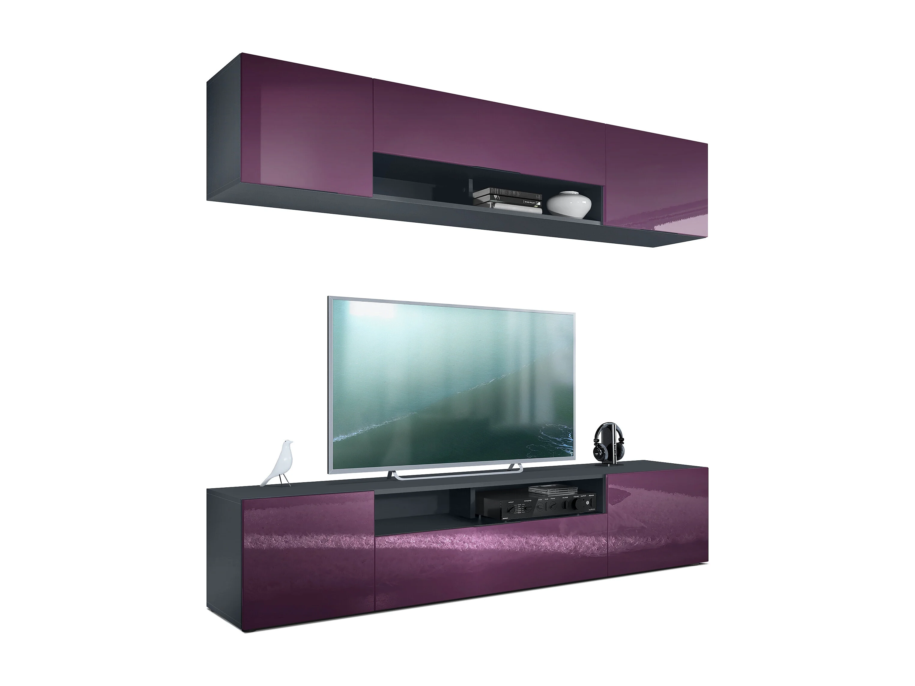 Meuble mural de salon Mogan avec deux éléments de 181x39x35 cm, meuble mural de salon suspendu avec 12 compartiments, Anthracite mat/Mûre brillant