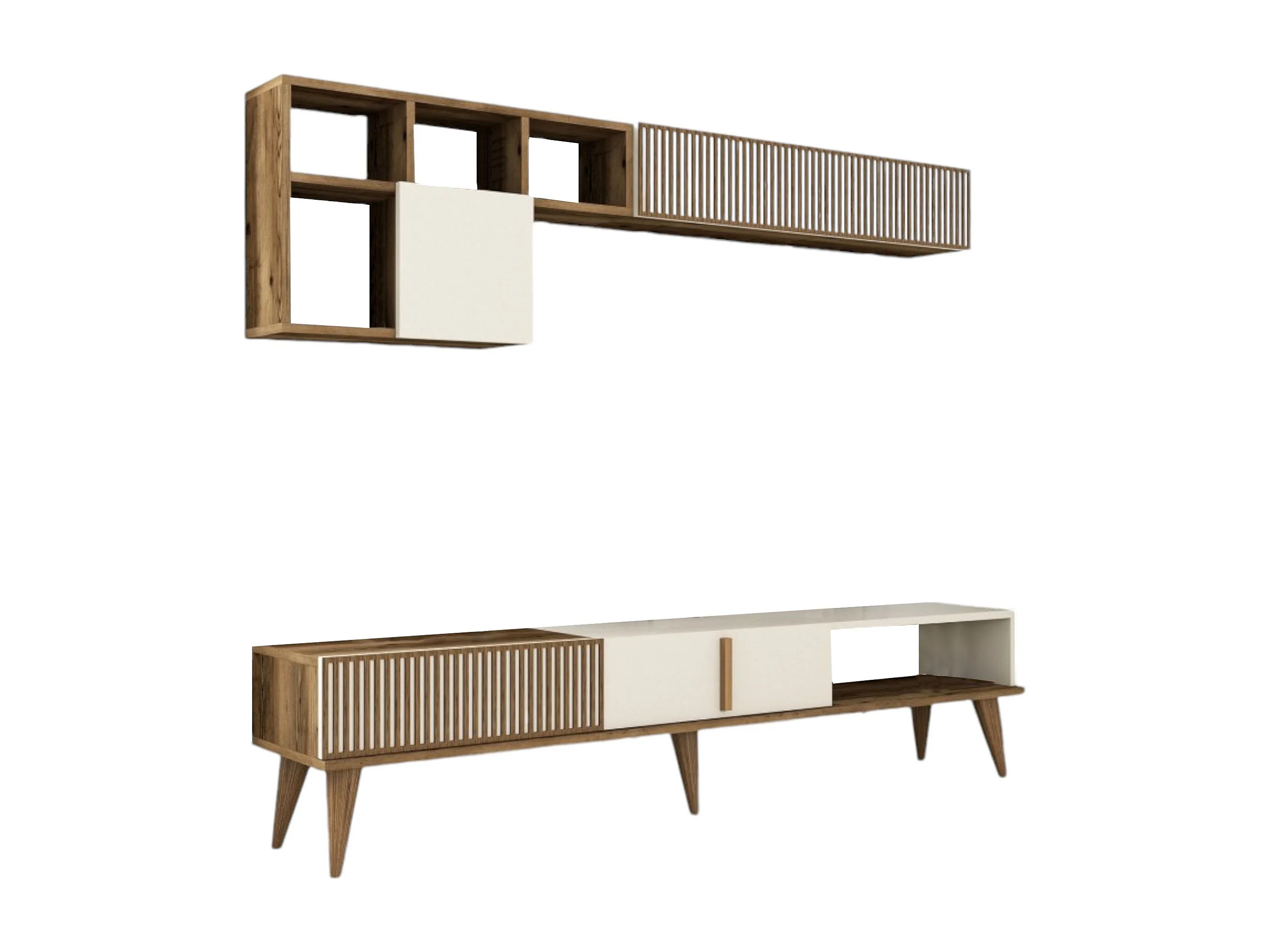 Meuble Mural Dpellicor, Composition du salon, Meubles de salon polyvalents, Meuble télé, 180x35 h40 cm, Noyer et Crème