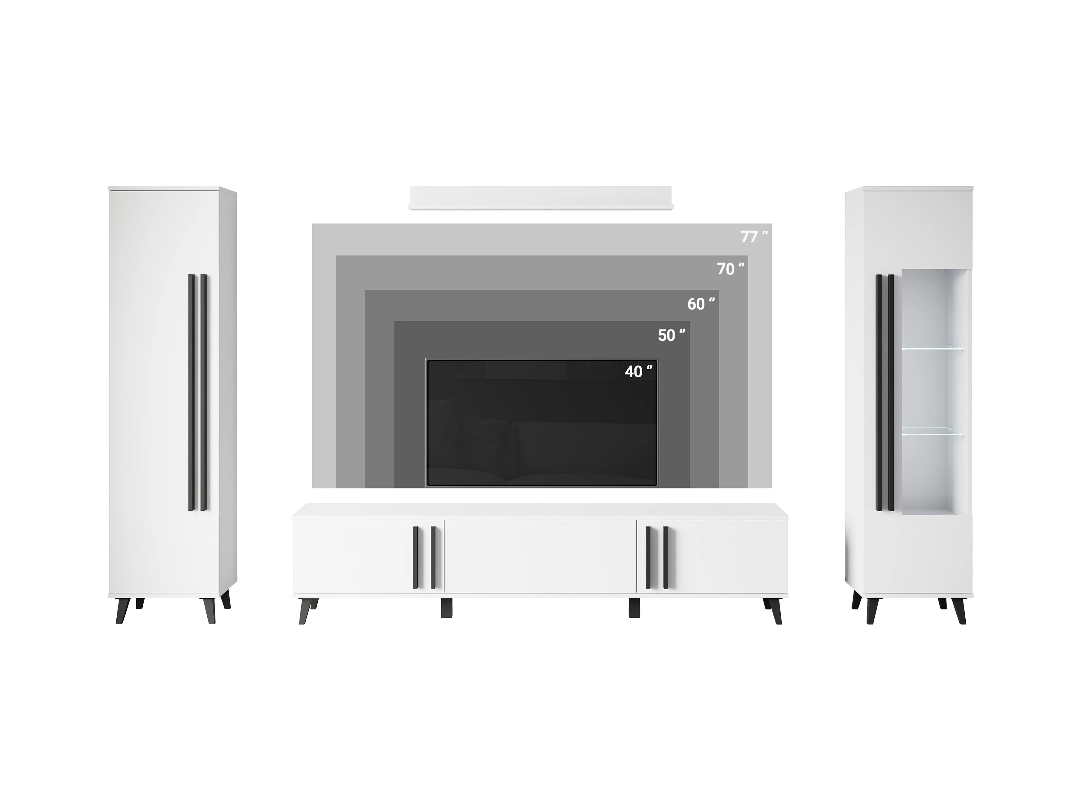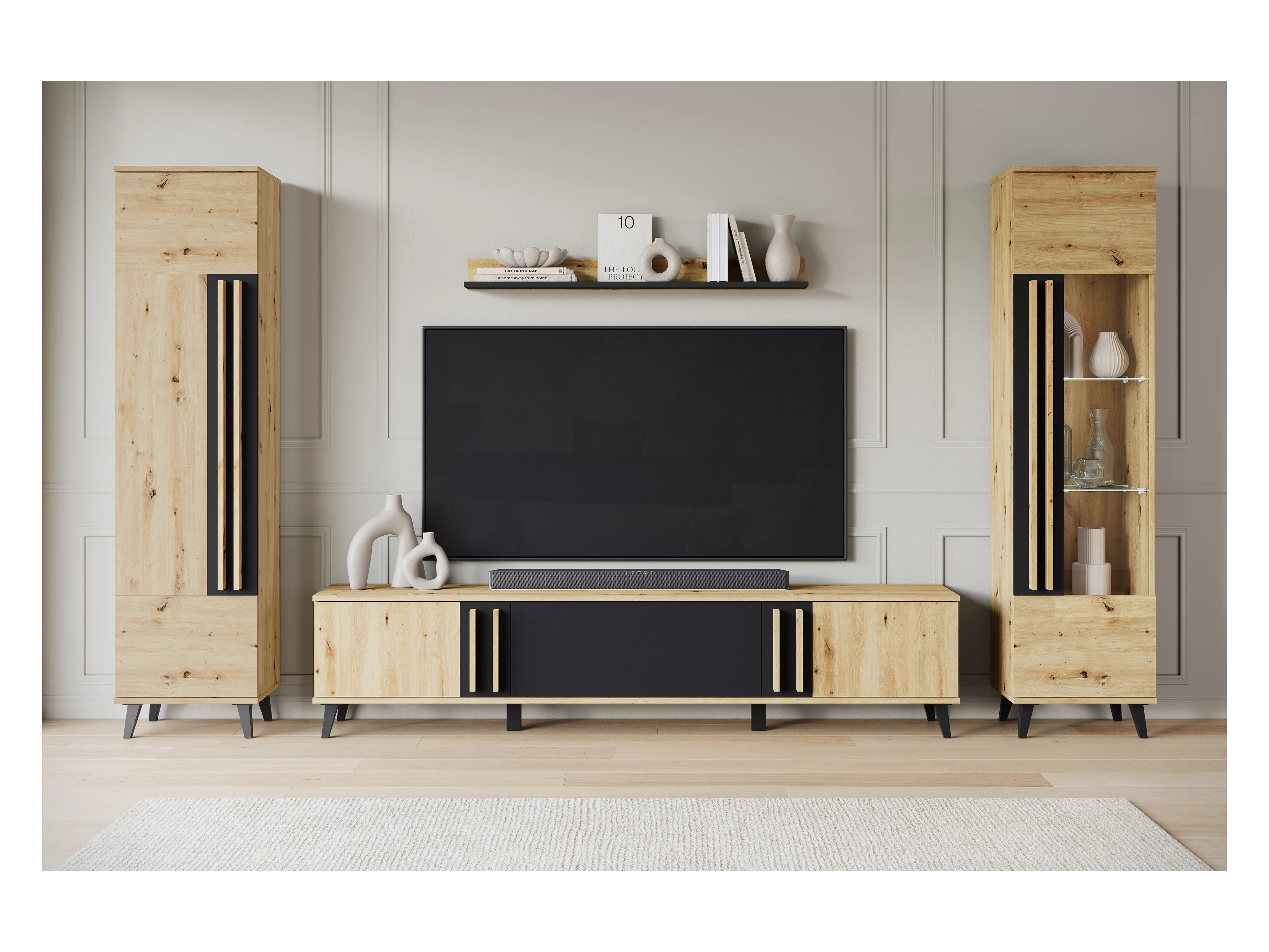 Ensemble mural de salon sur pieds – meuble TV 180 cm, vitrine, étagère et bibliothèque, chêne artisan, noir mat
