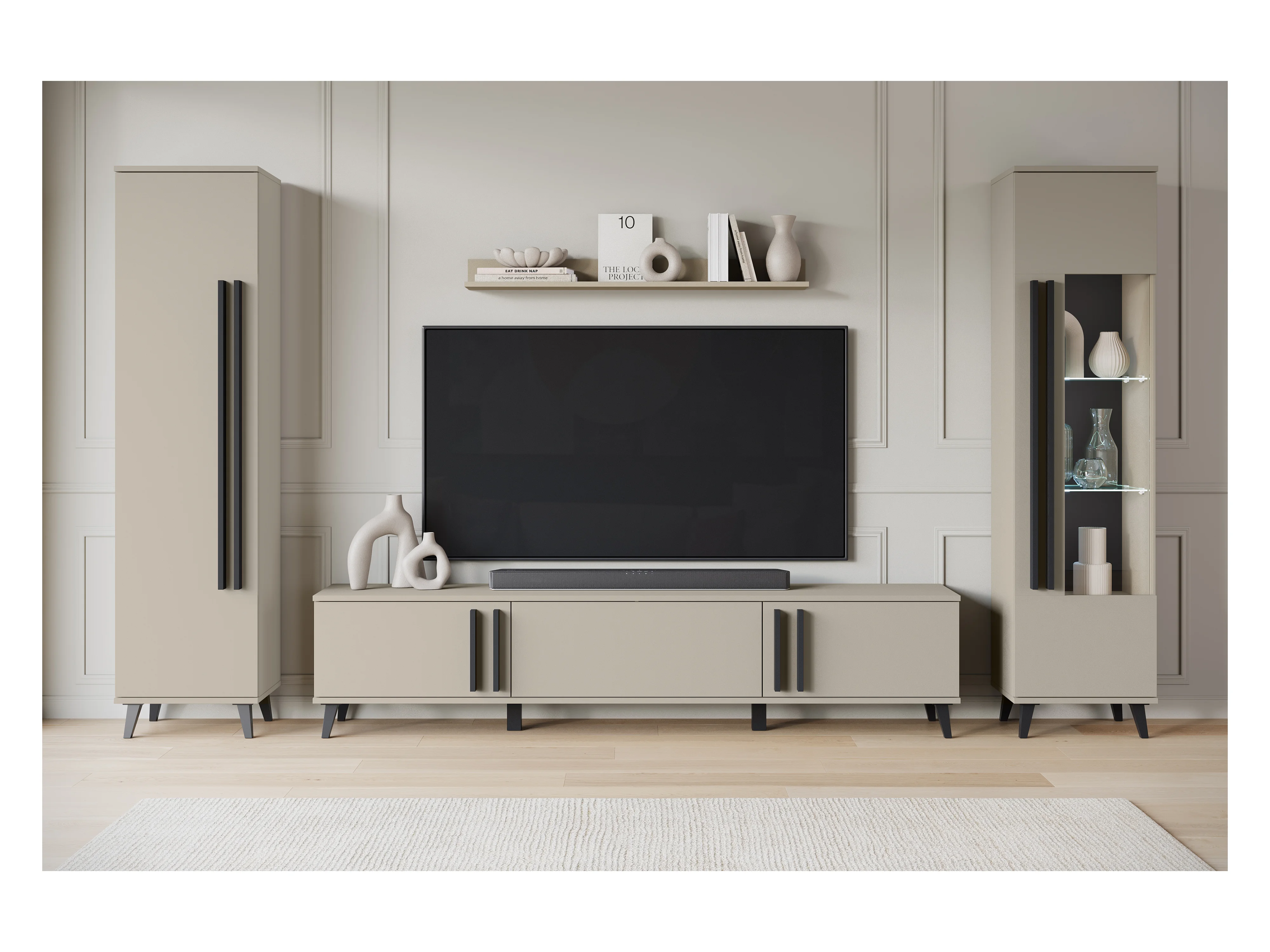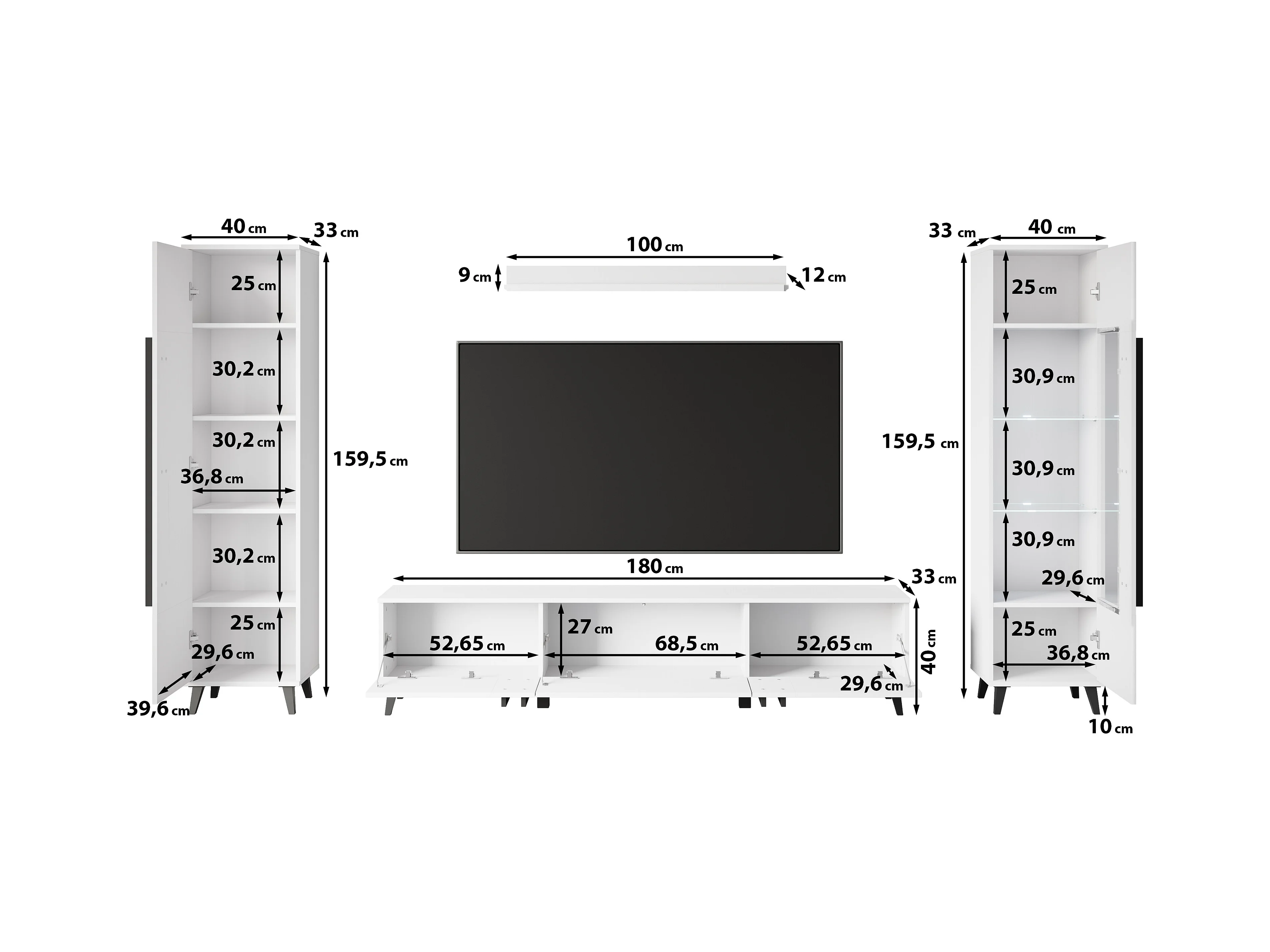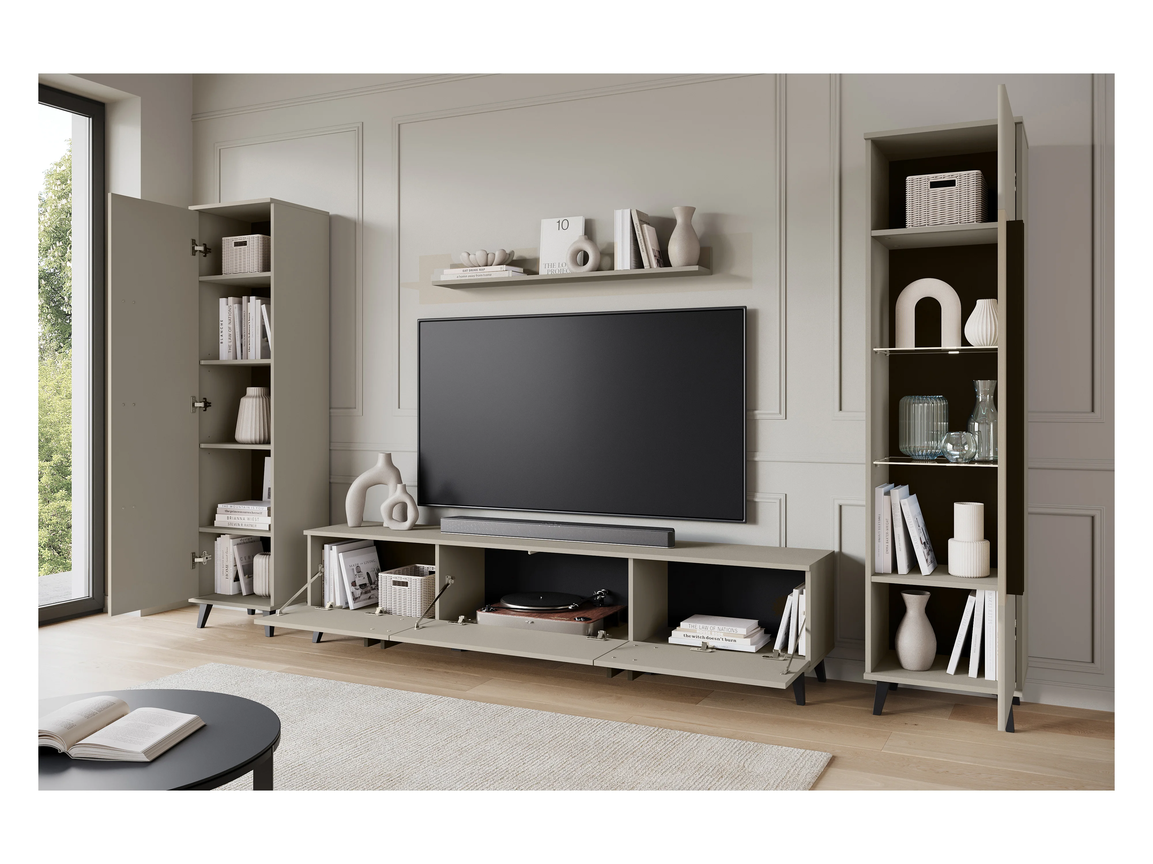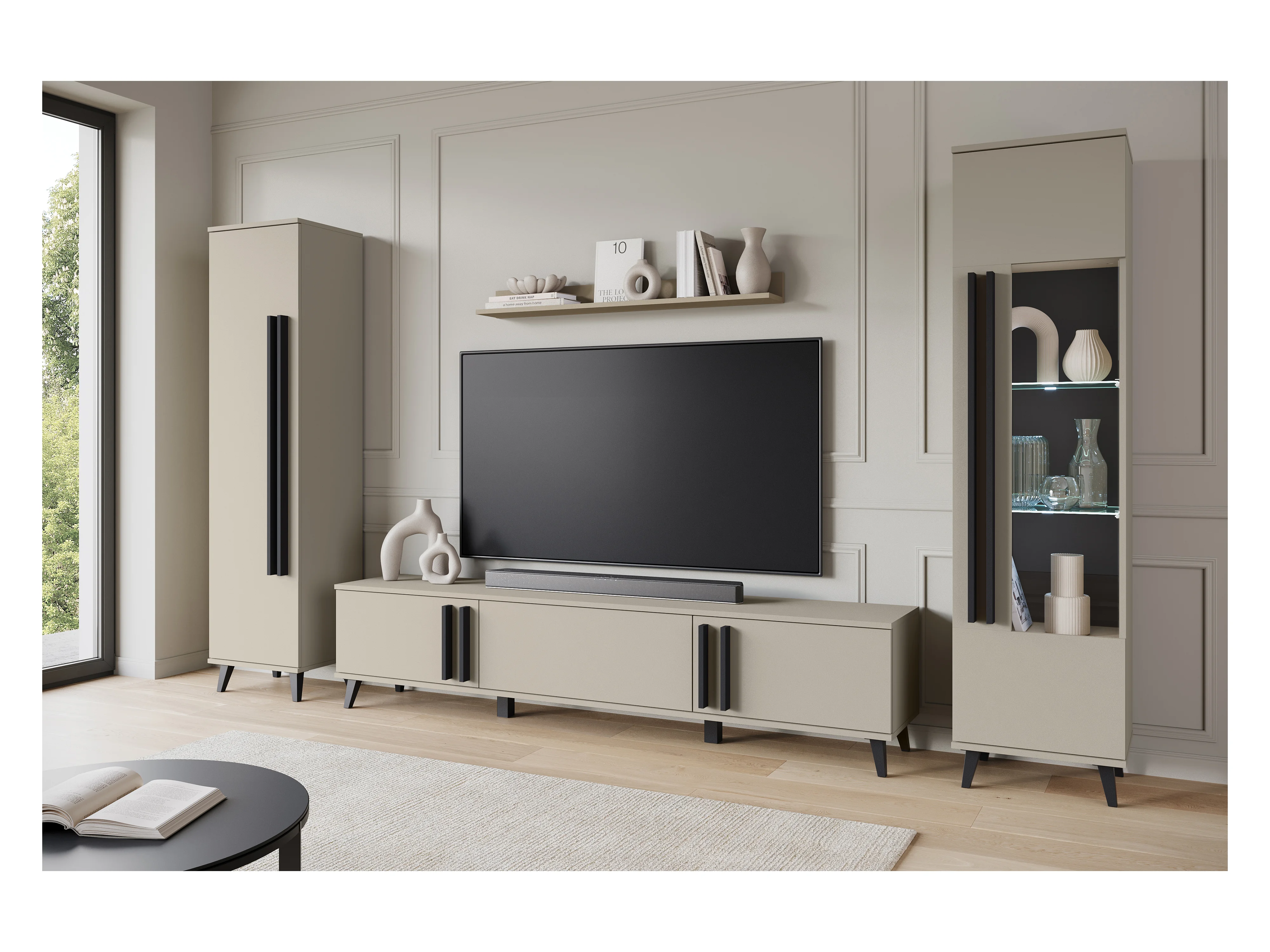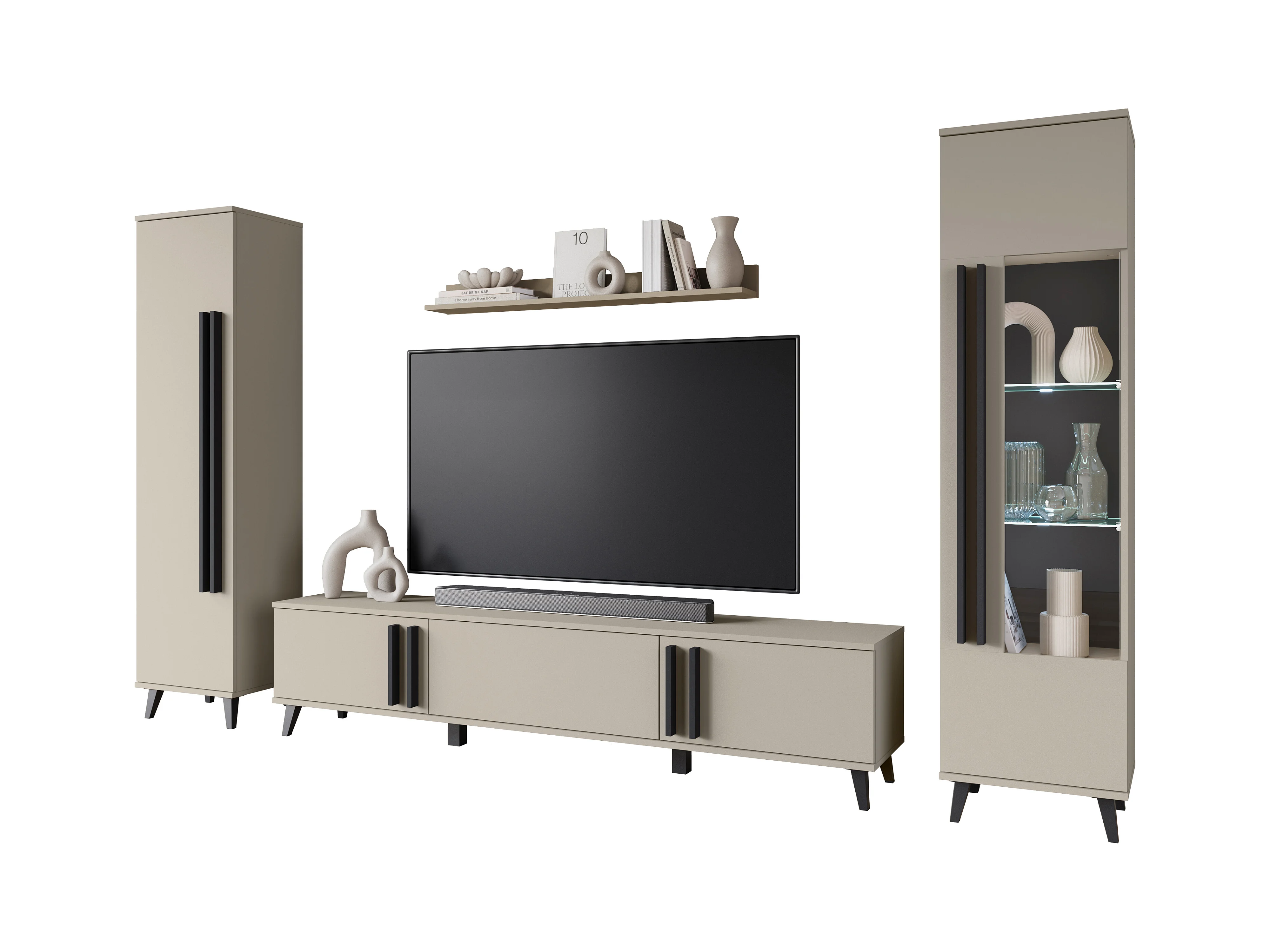 Ensemble mural de salon sur pieds – meuble TV 180 cm, vitrine, étagère et bibliothèque, congo, poignées noir mat