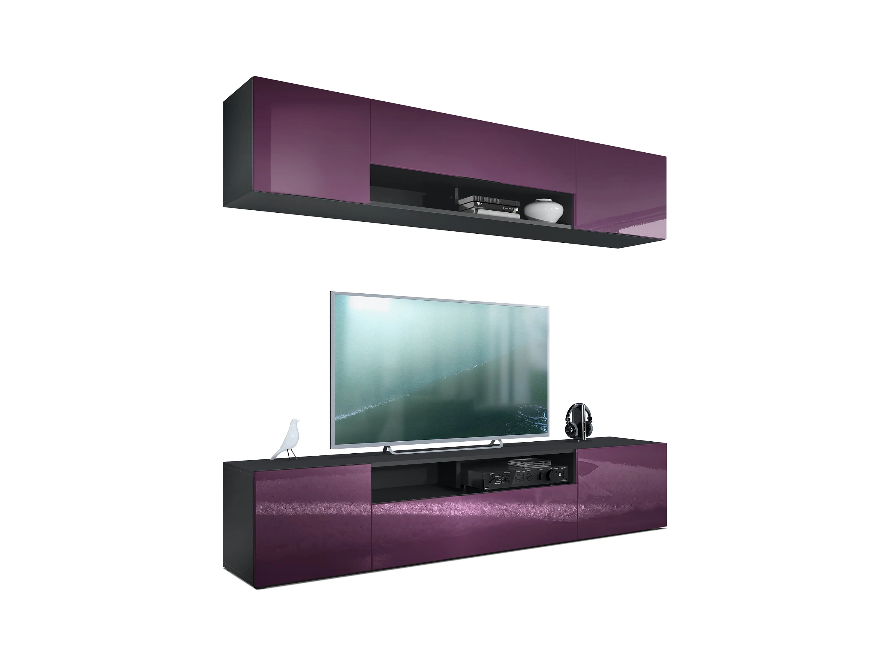 Meuble-paroi Mogan, noir mat/mûre haute brillance - Meuble mural moderne composé de 2 étagères TV (181 x 147 x 35 cm)