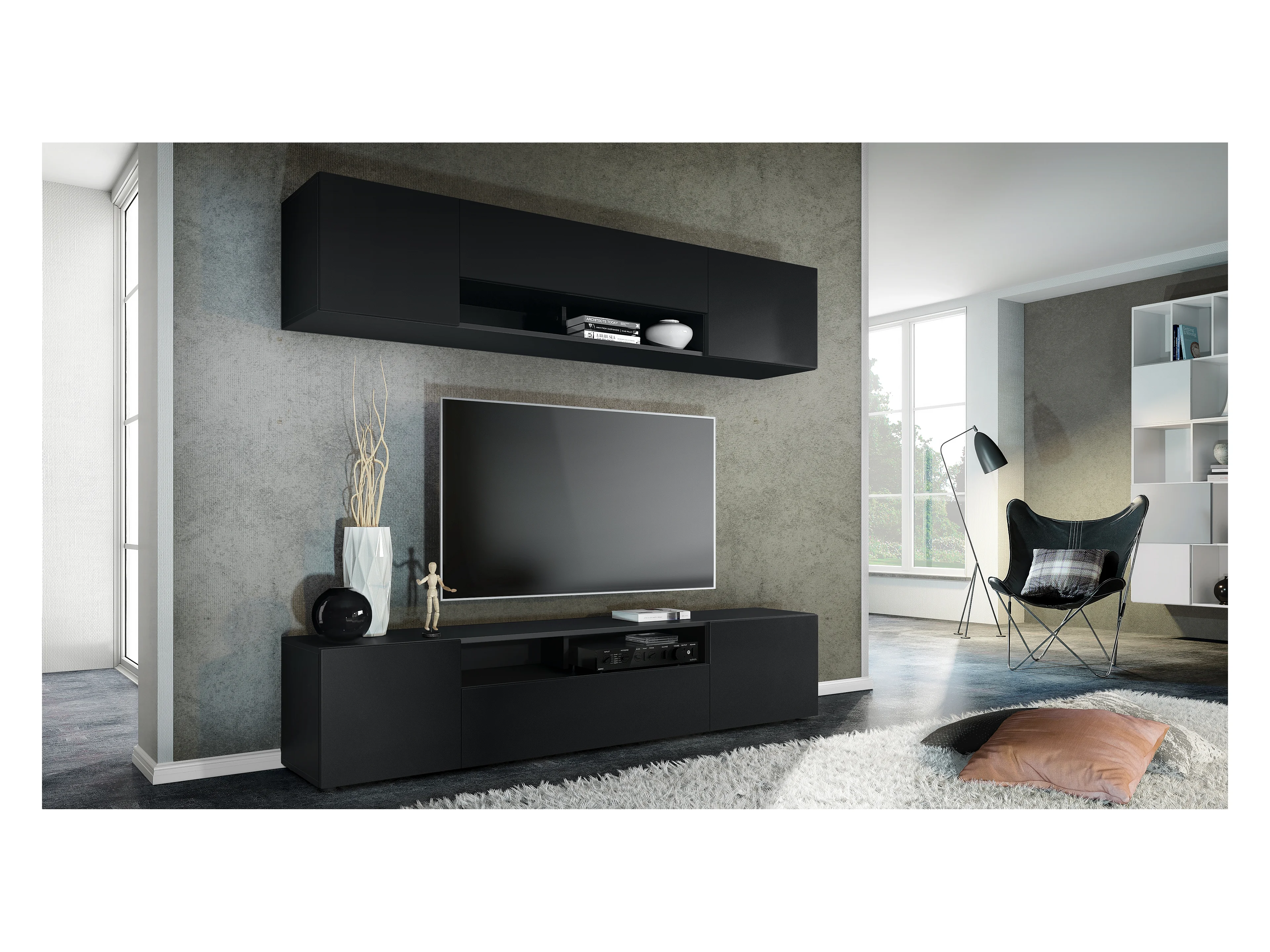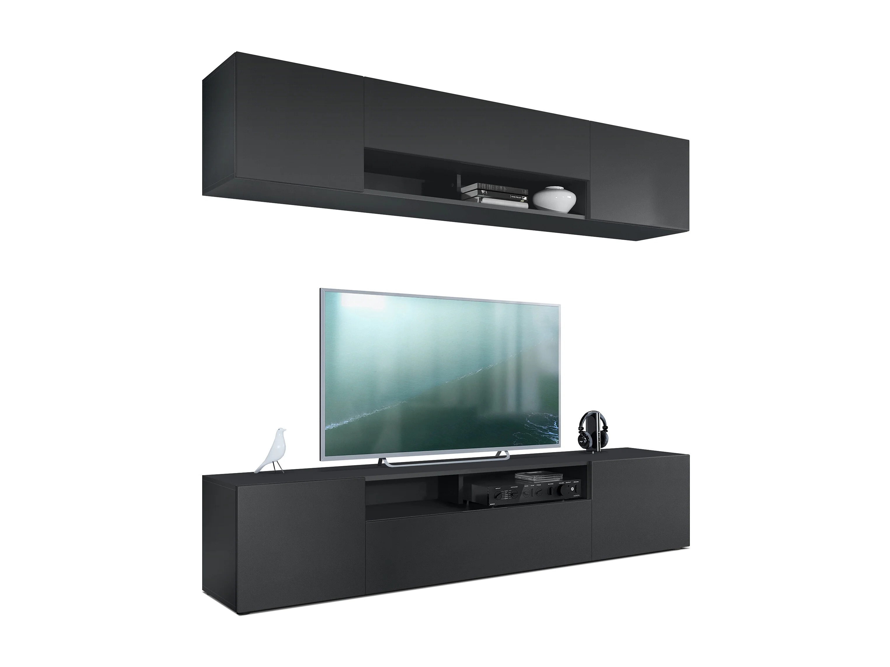 Meuble-paroi Mogan, noir mat/noir mat - Meuble mural moderne composé de 2 étagères TV (181 x 147 x 35 cm)