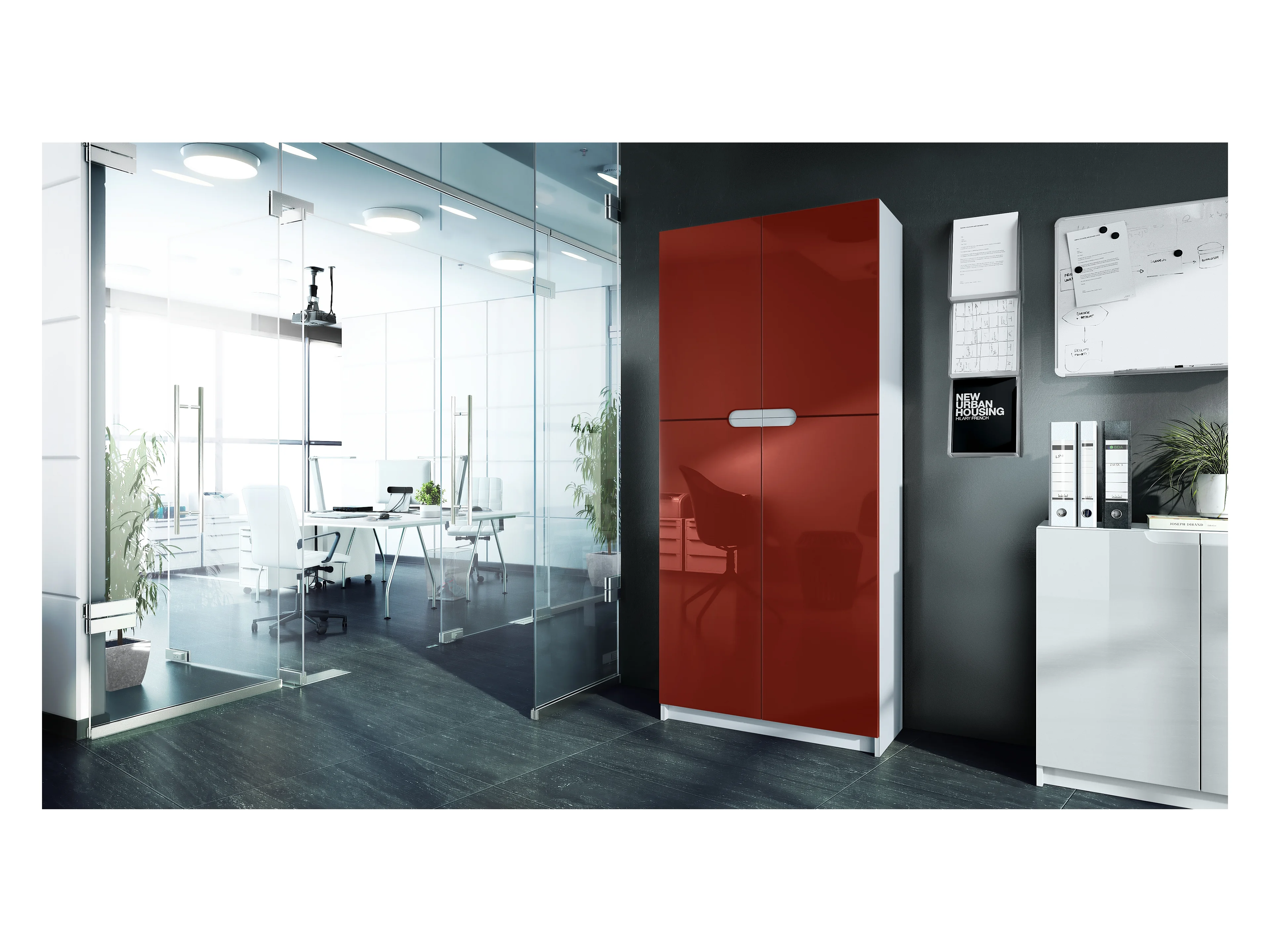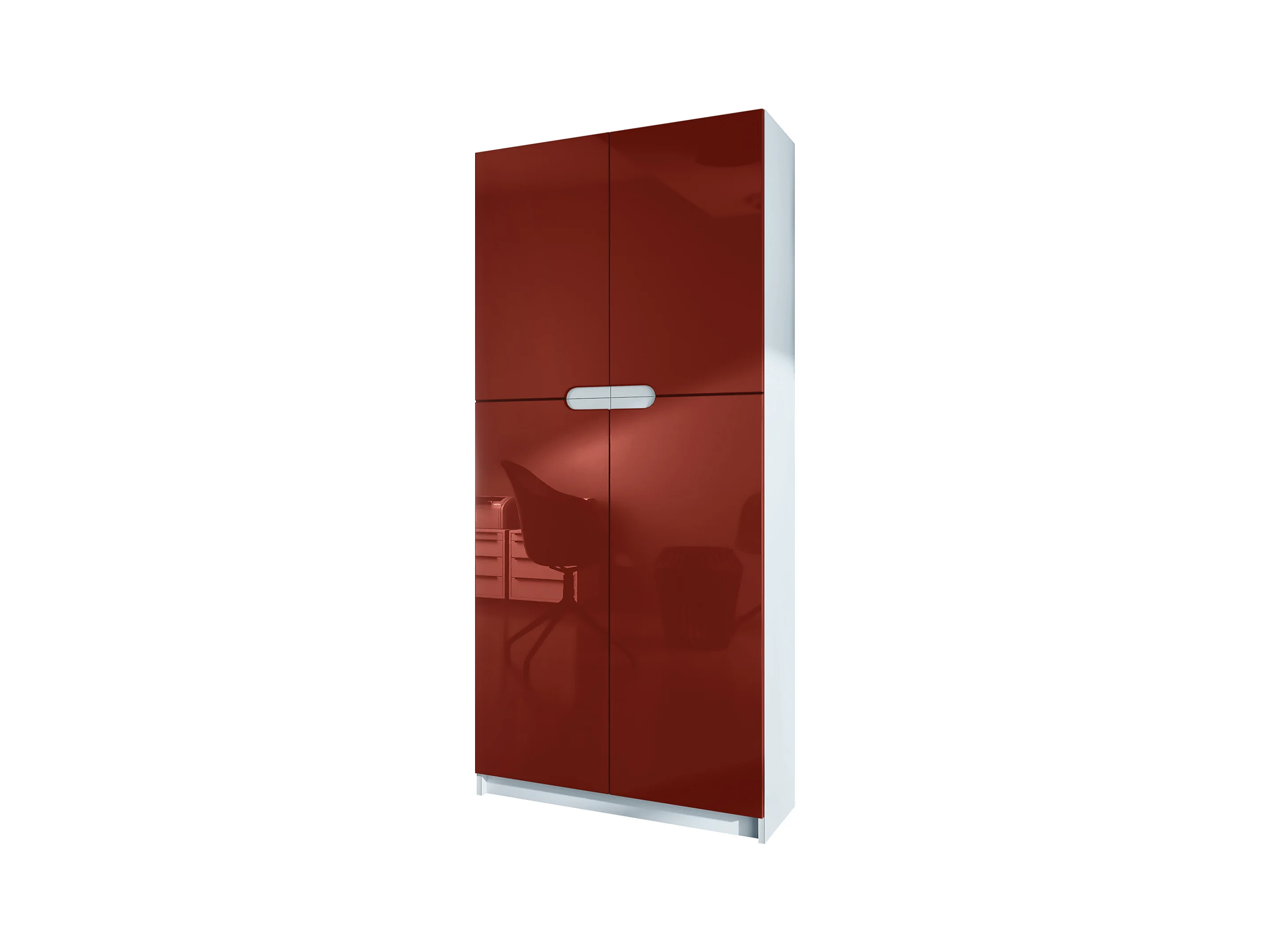 Meuble rangement bureau Logan V1, Armoire de bureau haute avec 5 compartiments et 4 portes, blanc mat/bordeaux haute brillance (82 x 185 x 37 cm)