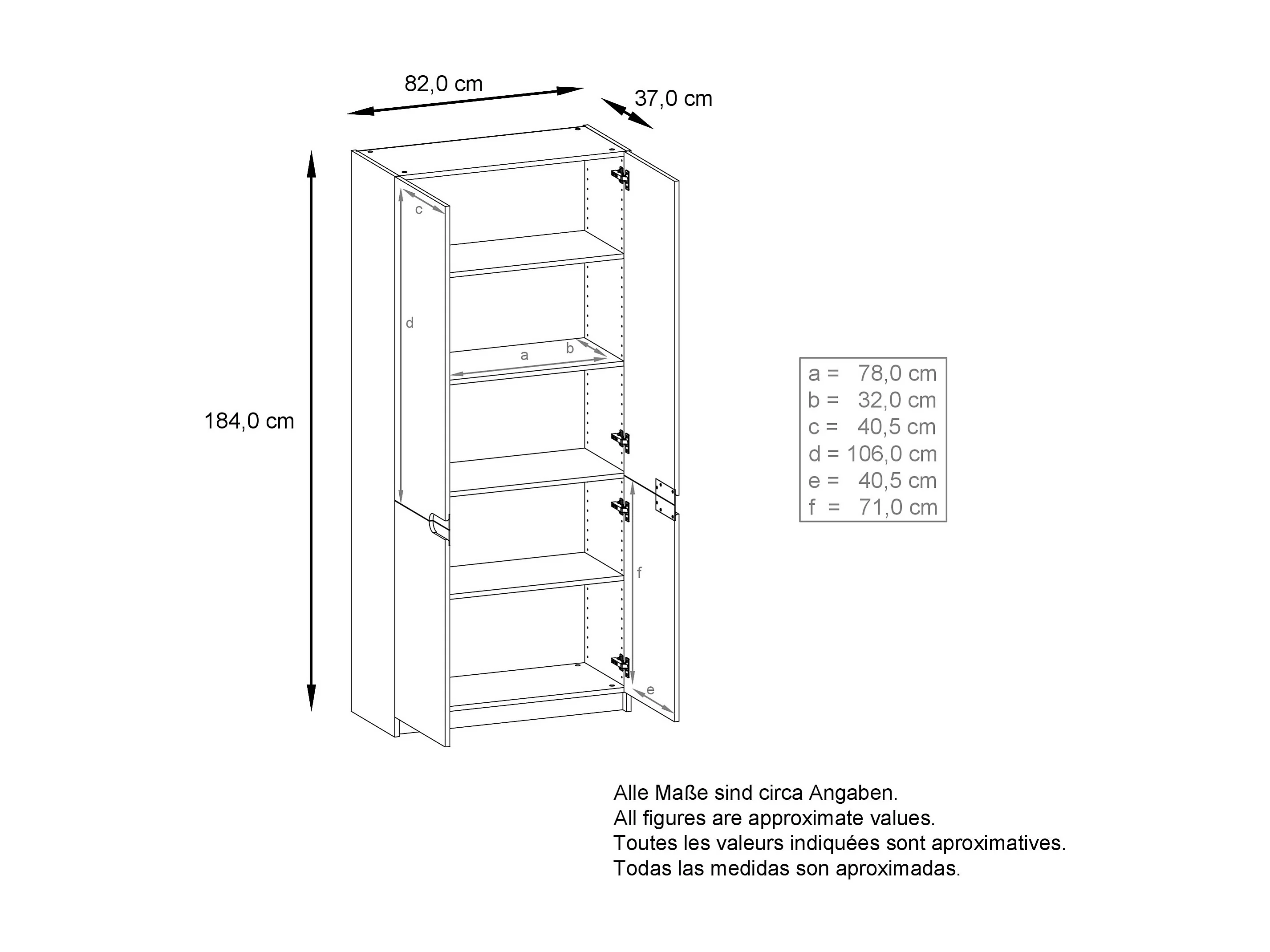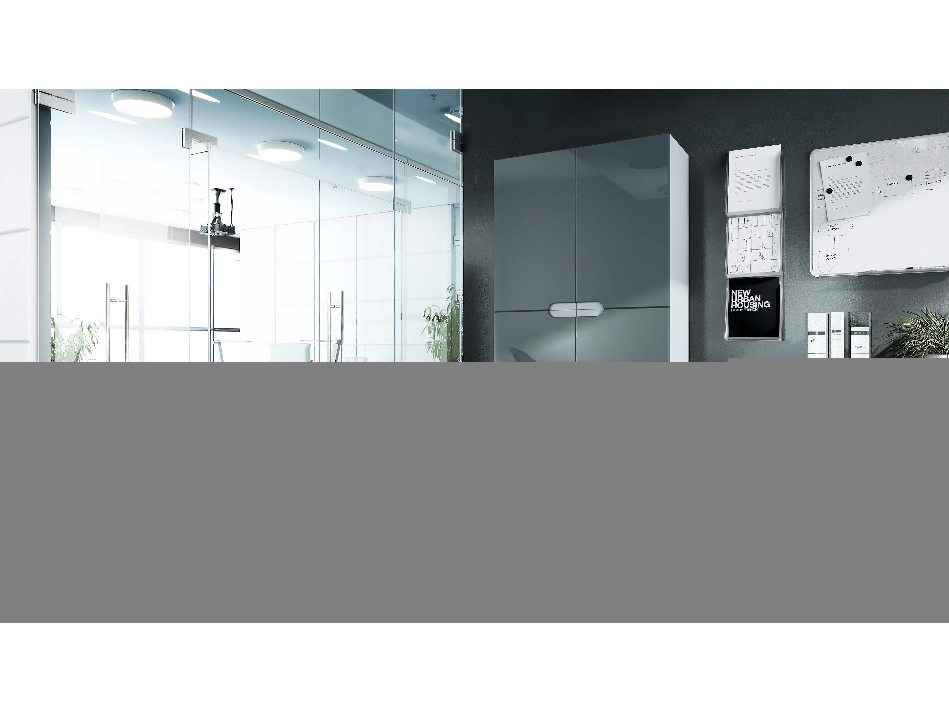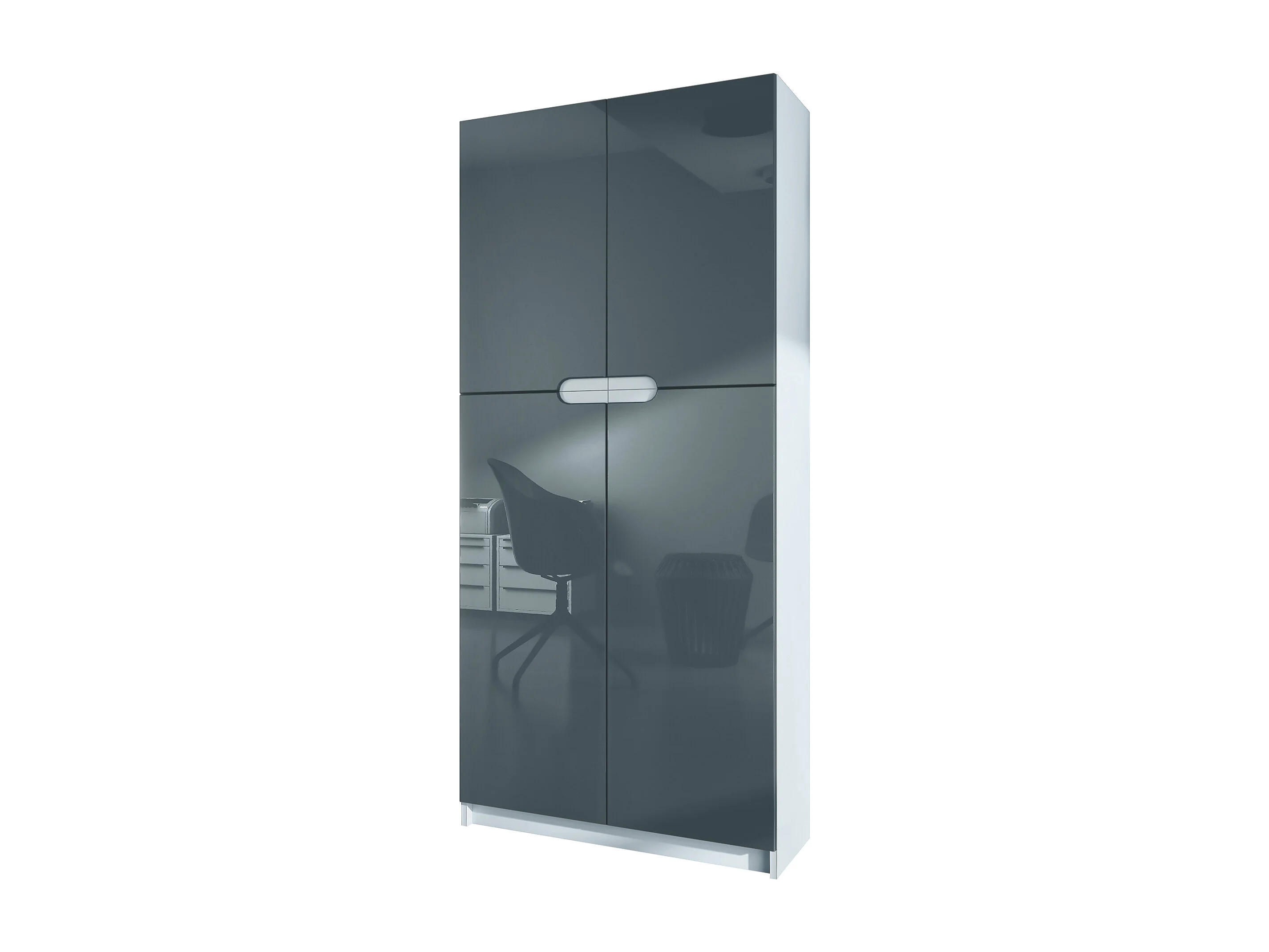 Meuble rangement bureau Logan V1, Armoire de bureau haute avec 5 compartiments et 4 portes, blanc mat/gris haute brillance (82 x 185 x 37 cm)