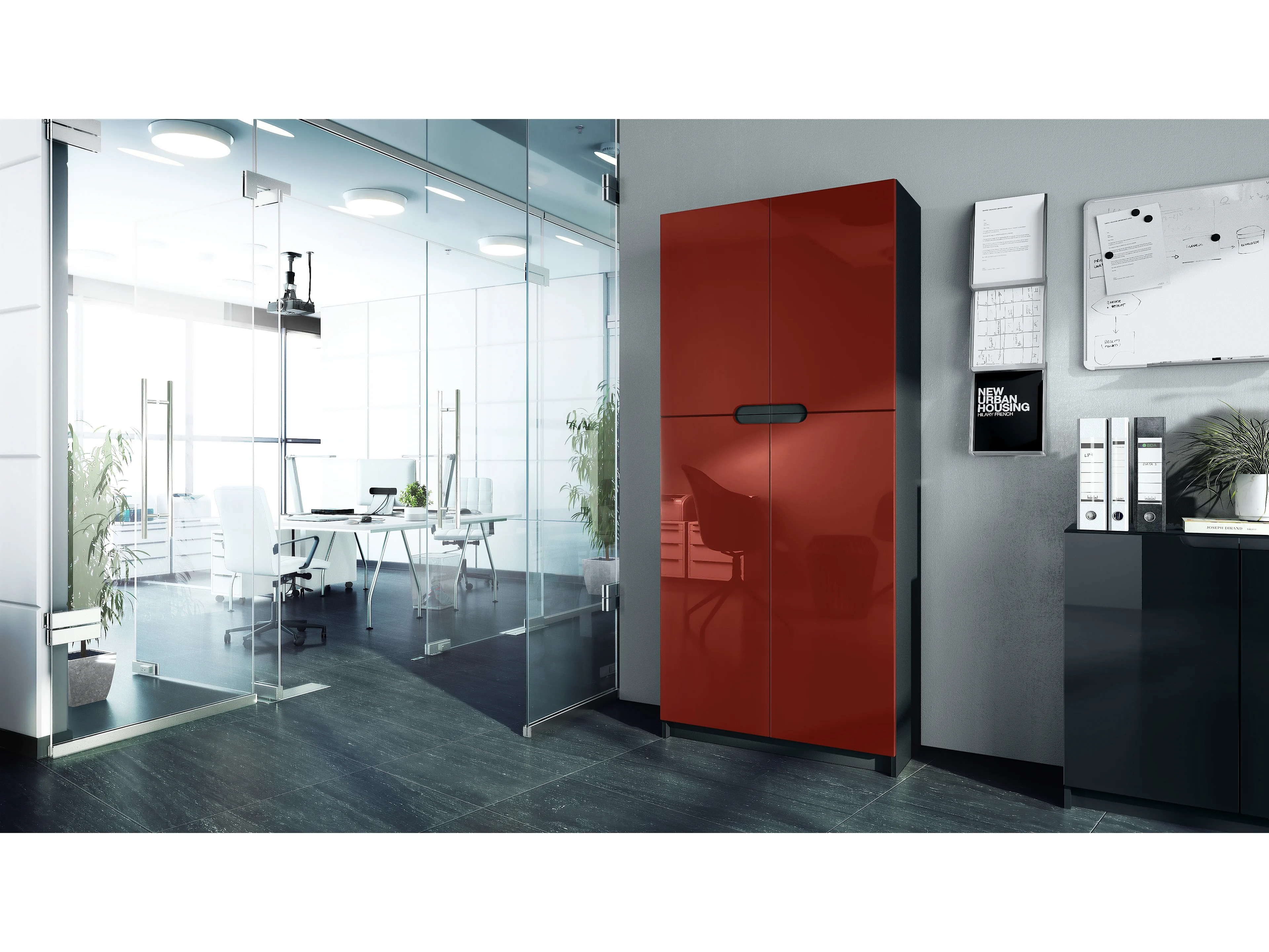 Meuble rangement bureau Logan V1, Armoire de bureau haute avec 5 compartiments et 4 portes, noir mat/bordeaux haute brillance (82 x 185 x 37 cm)