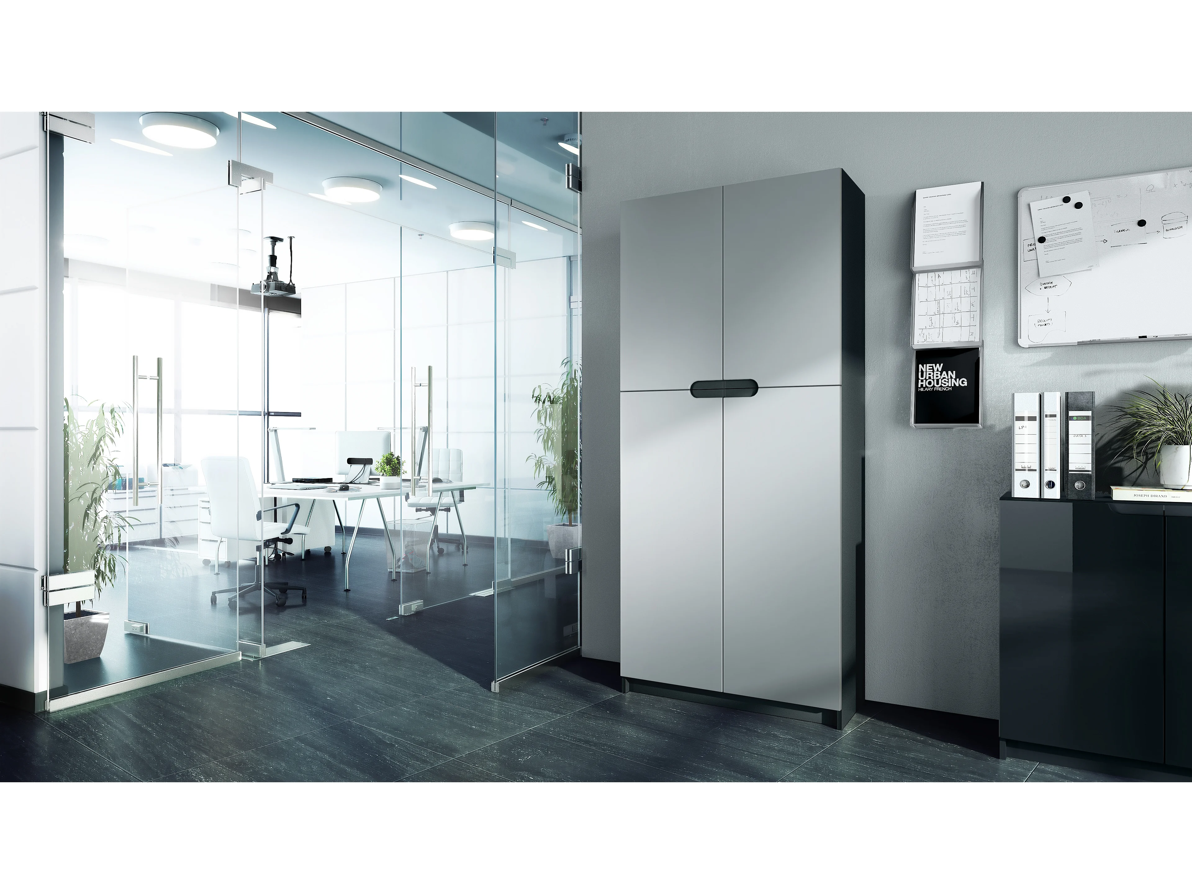 Meuble rangement bureau Logan V1, Armoire de bureau haute avec 5 compartiments et 4 portes, noir mat/gris clair satiné mat (82 x 185 x 37 cm)