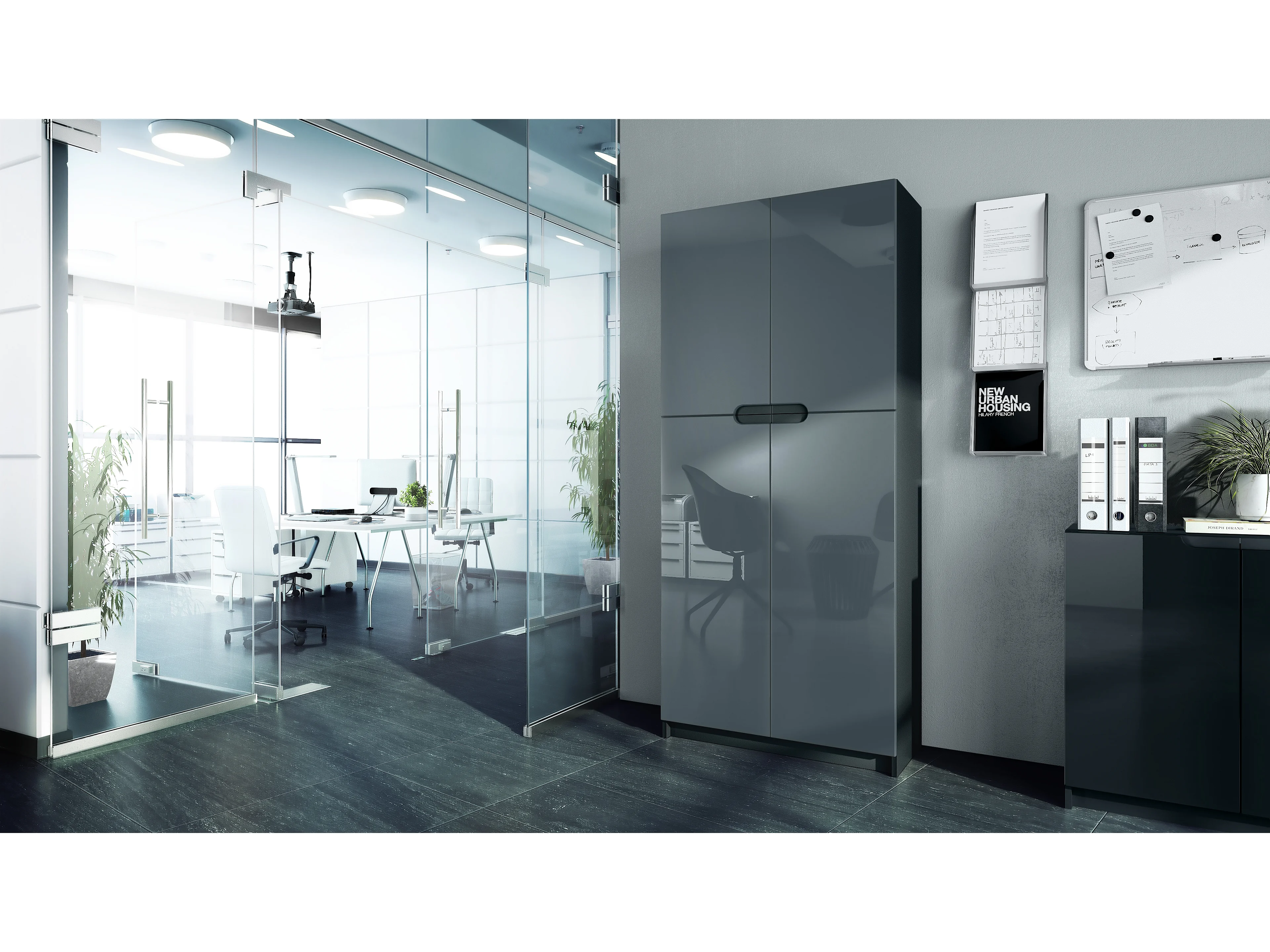 Meuble rangement bureau Logan V1, Armoire de bureau haute avec 5 compartiments et 4 portes, noir mat/gris haute brillance (82 x 185 x 37 cm)
