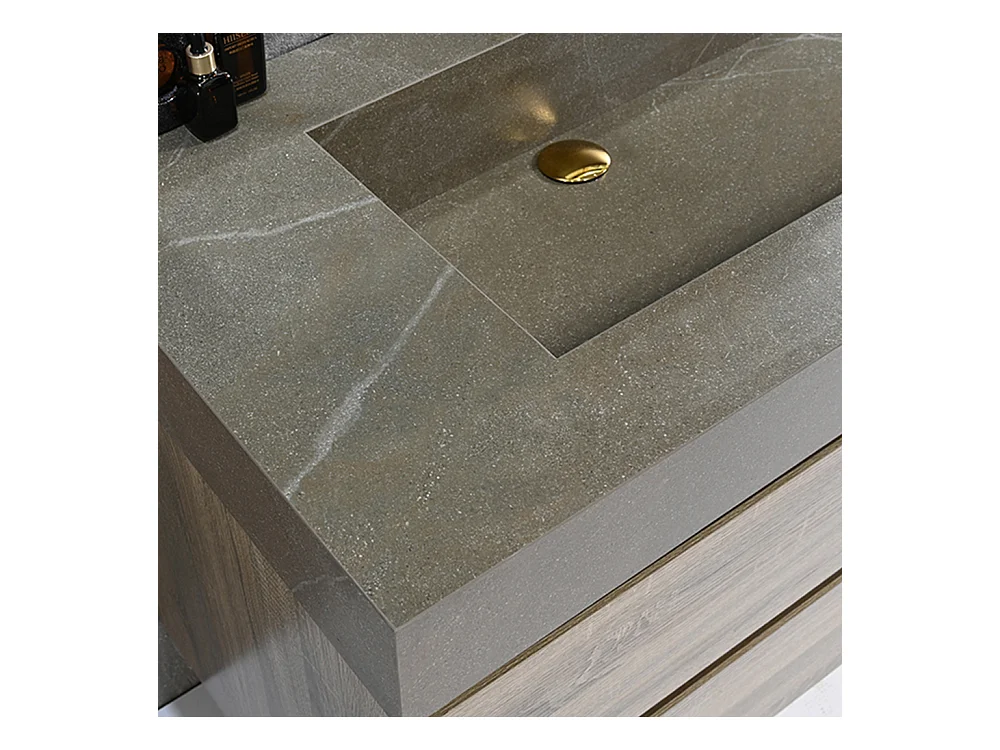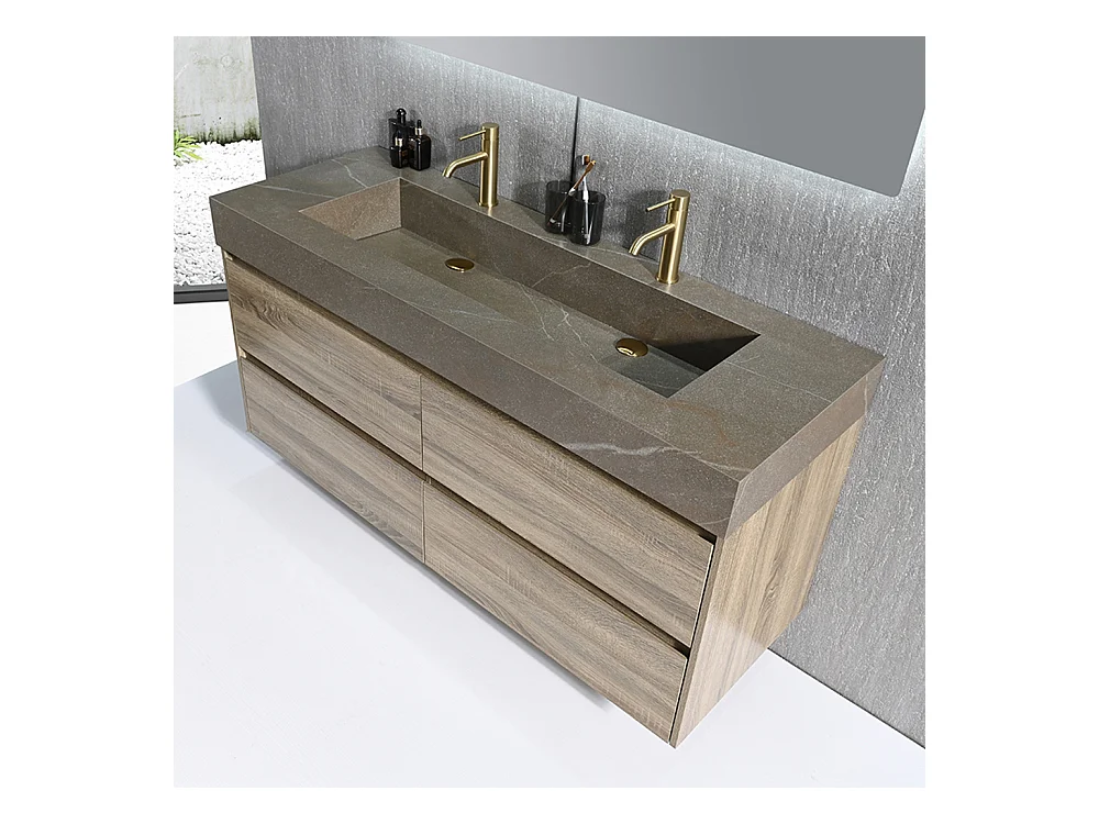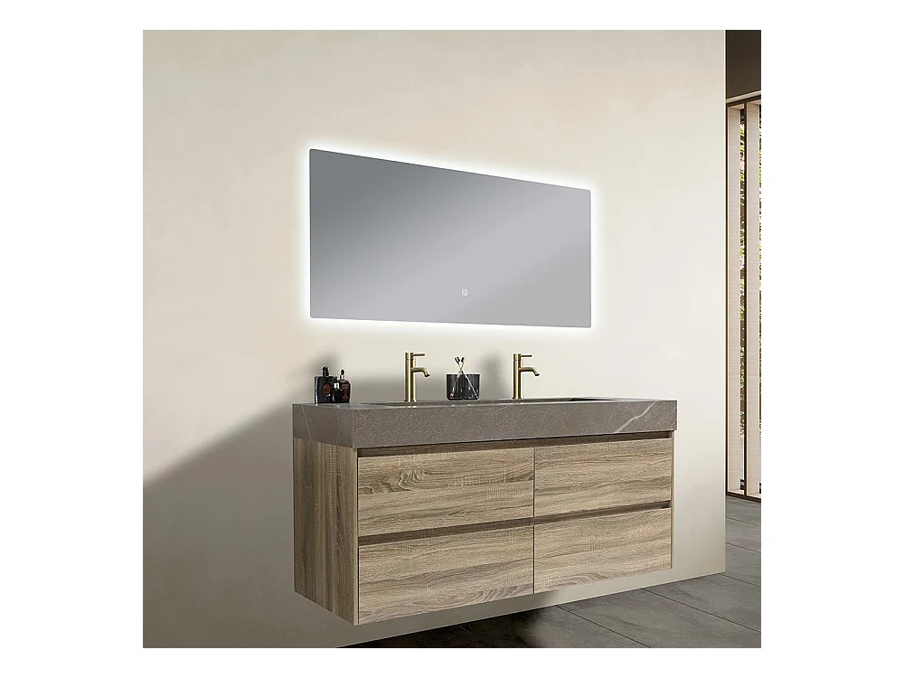 Meuble salle de bain double vasque 140cm bois et effet marbre marron avec miroir LED LB-8476M-140