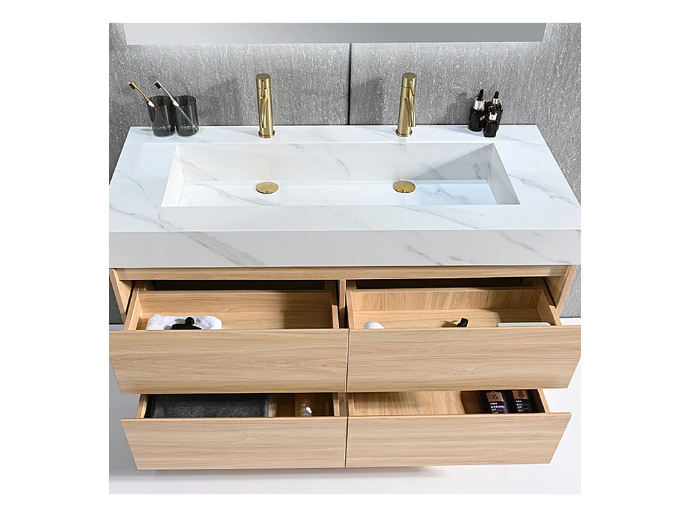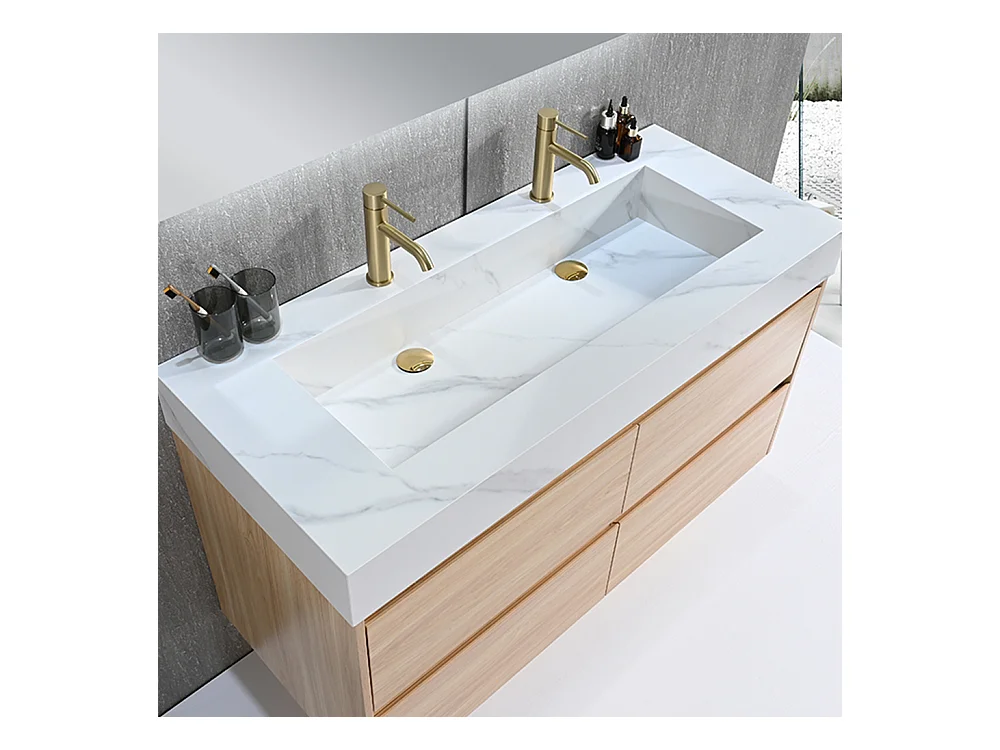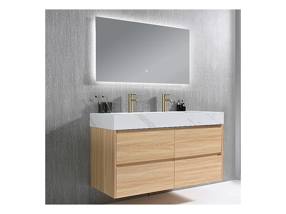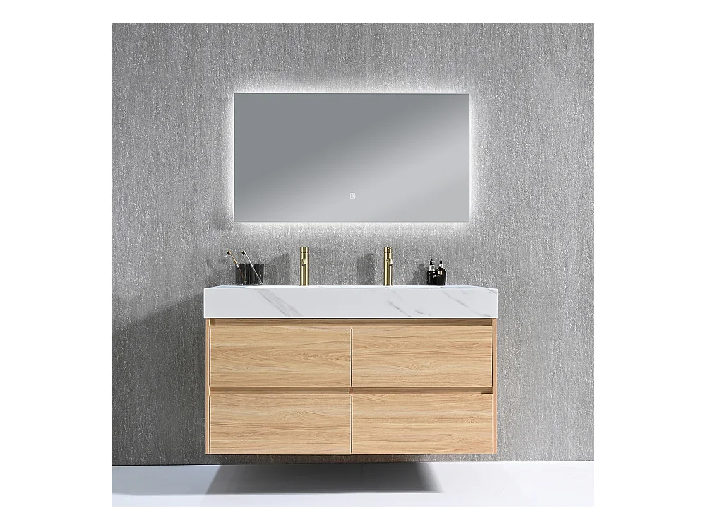 Meuble salle de bain double vasque 140cm bois naturel et effet marbre blanc avec miroir LED LB-8476C-140