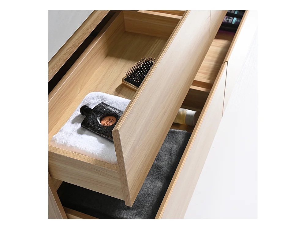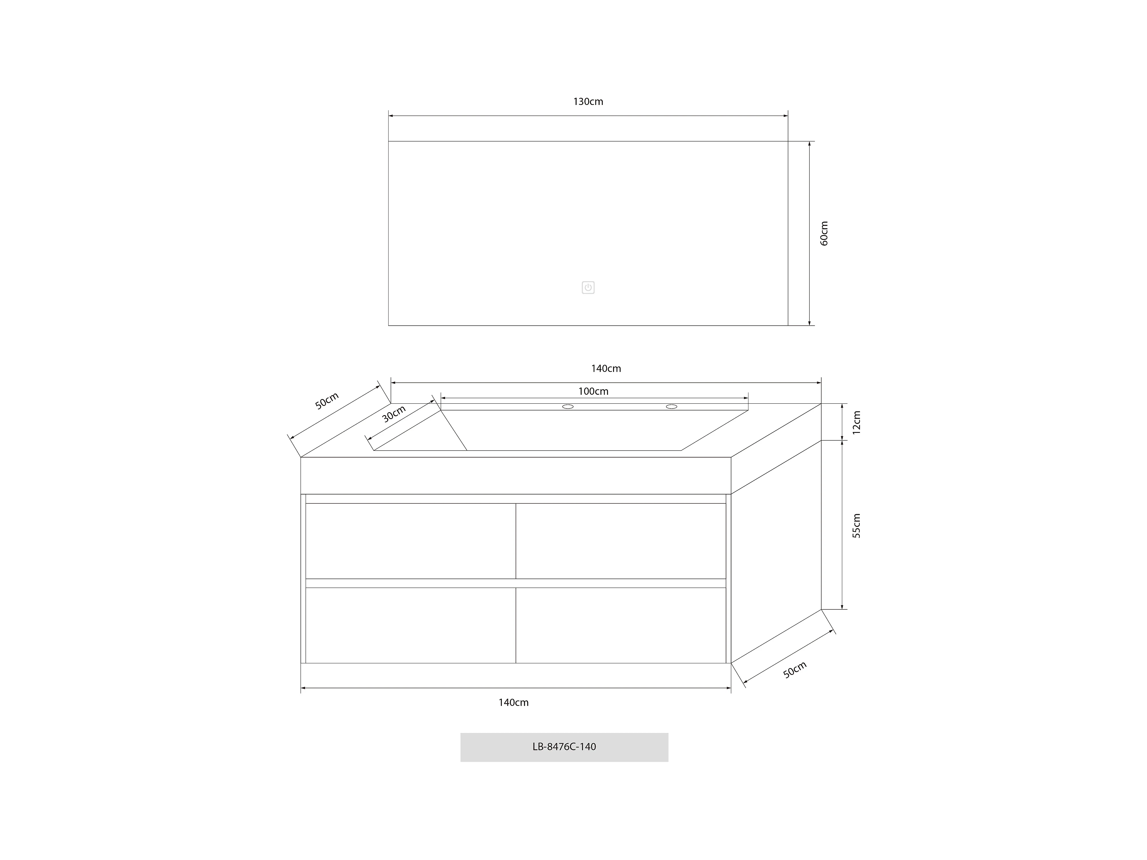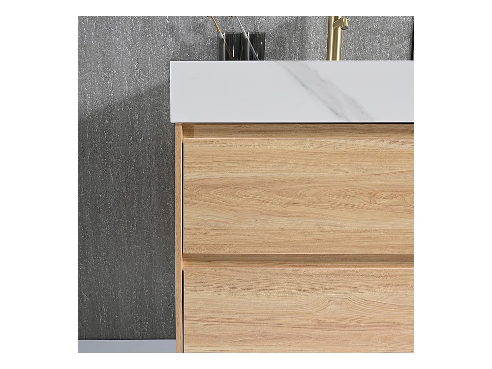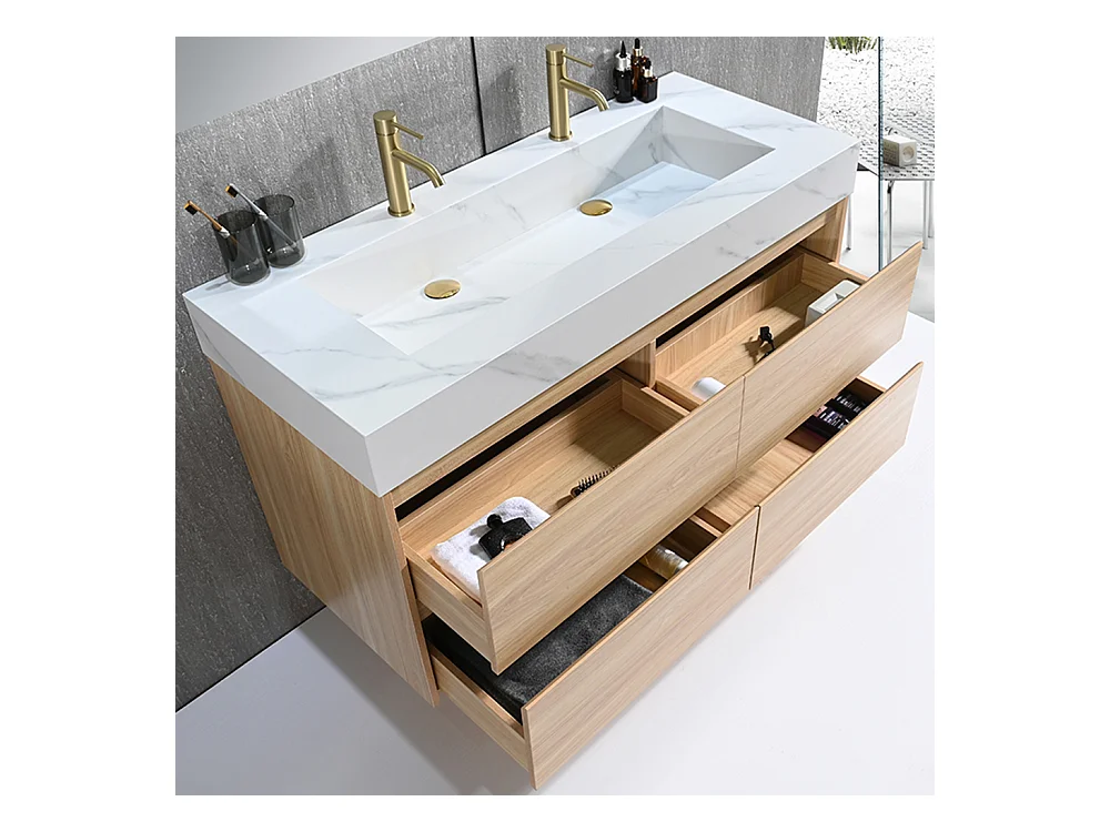 Meuble salle de bain double vasque 140cm bois naturel et effet marbre blanc avec miroir LED LB-8476C-140