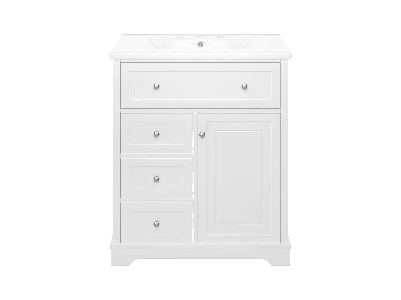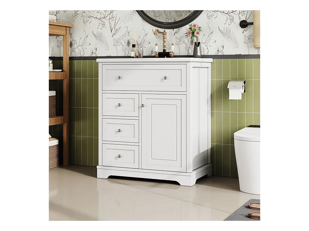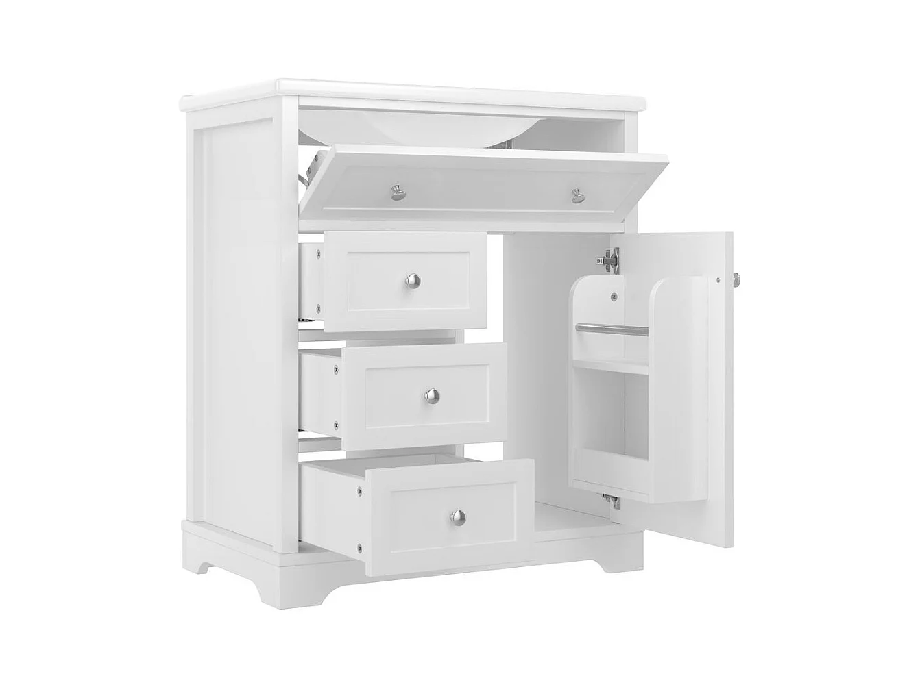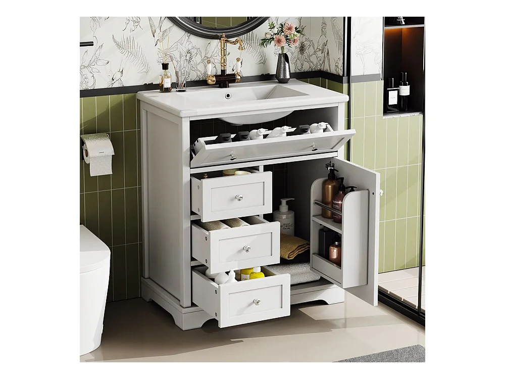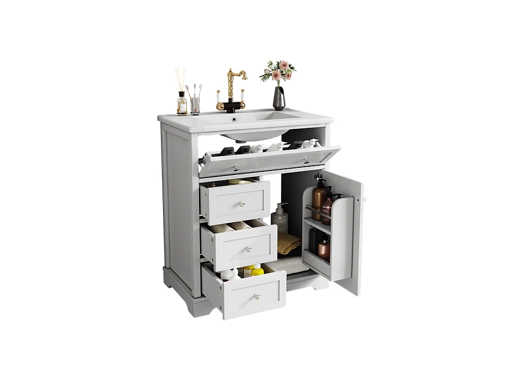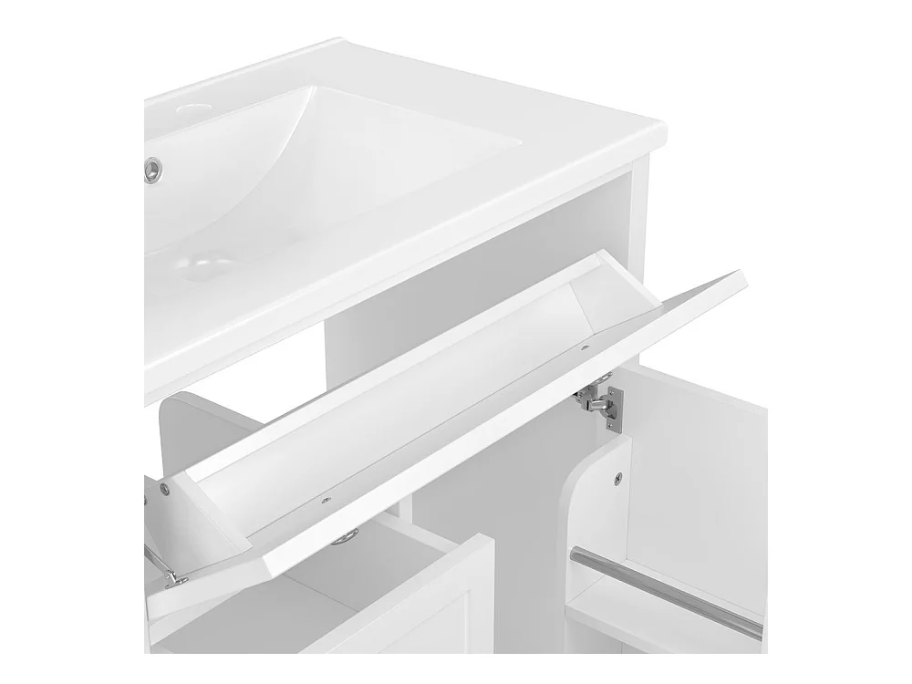 Meuble salle de bain lavabo vasque peinture pulverisee trois tiroirs fermeture douce etageres porte tiroir rabattable vasque ceramique integre blanc