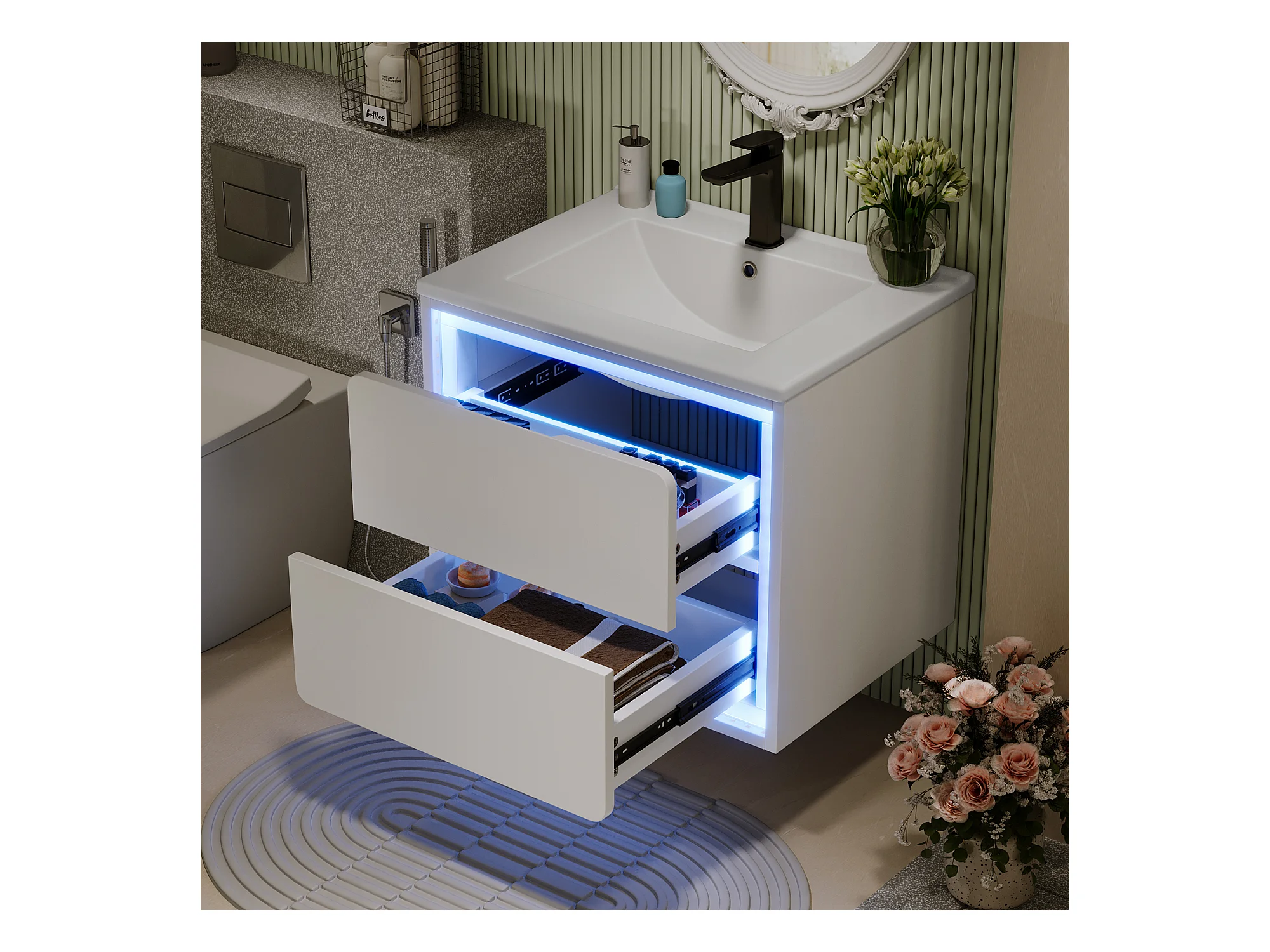 Meuble simple vasque suspendus - 60 x 46 x 50 cm - avec Leds + 2 tiroirs - vasque intégrée - Céramique + MDF - blanc (Robinet non inclus)