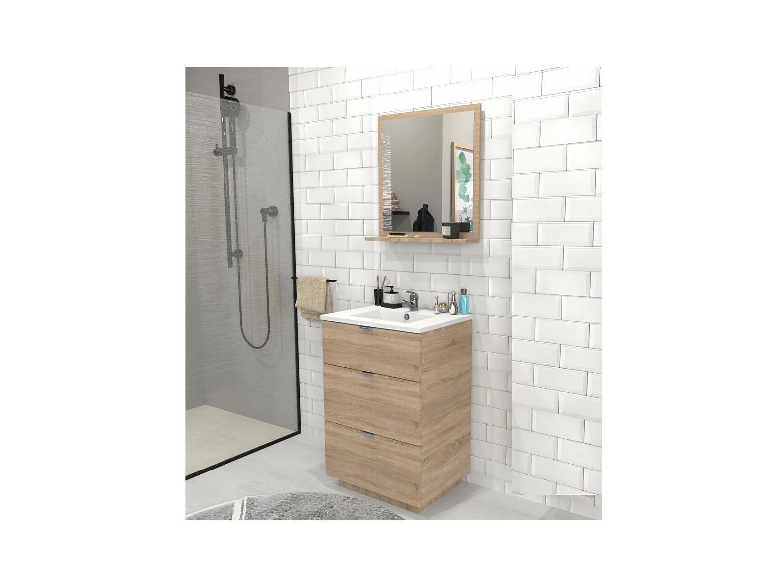 Meuble sous-vasque 3 tiroirs MARBELLA 60 cm + vasque / Décor Chêne blanchi