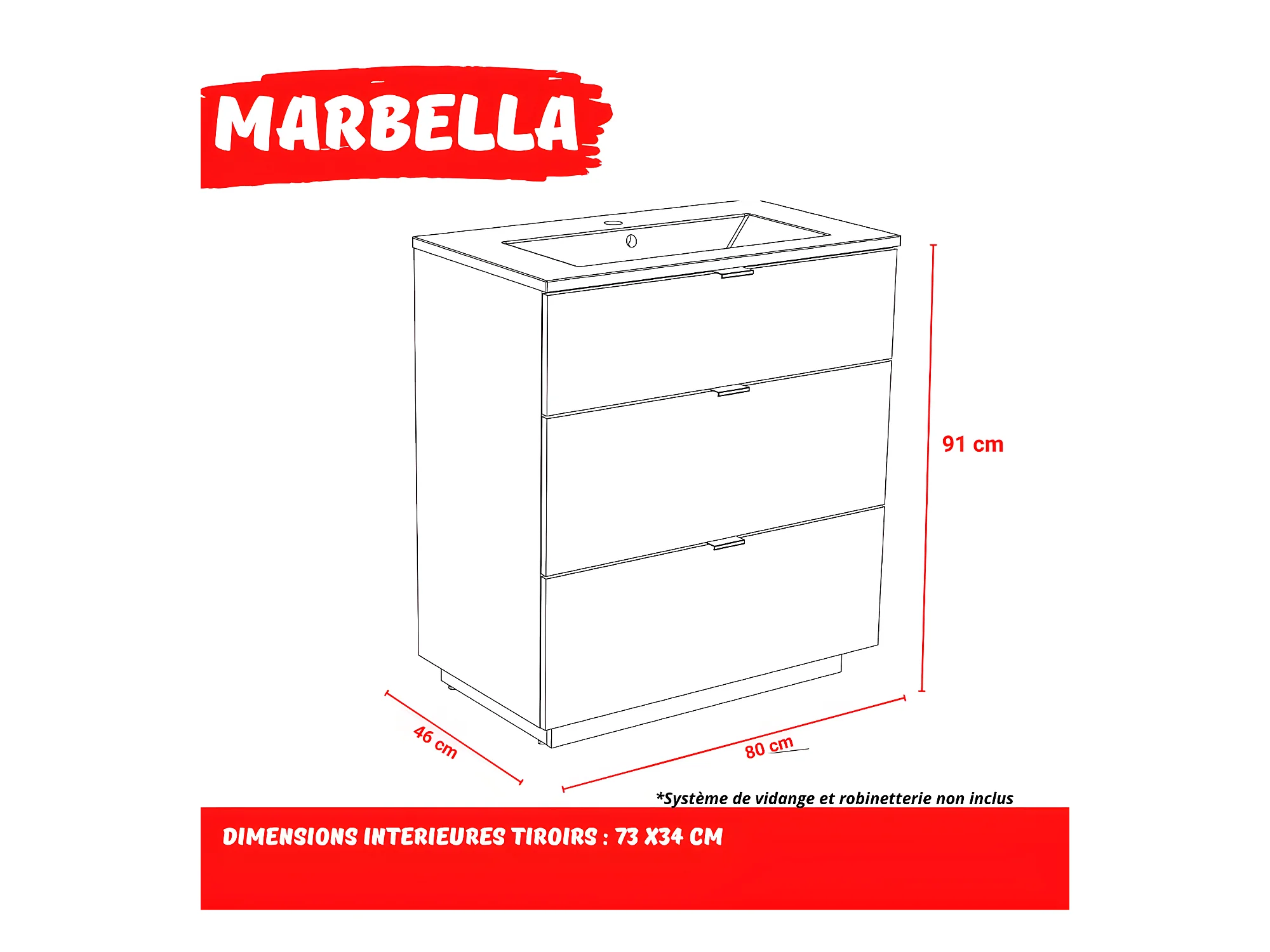 Meuble sous-vasque 3 tiroirs MARBELLA 80 cm + vasque / Blanc