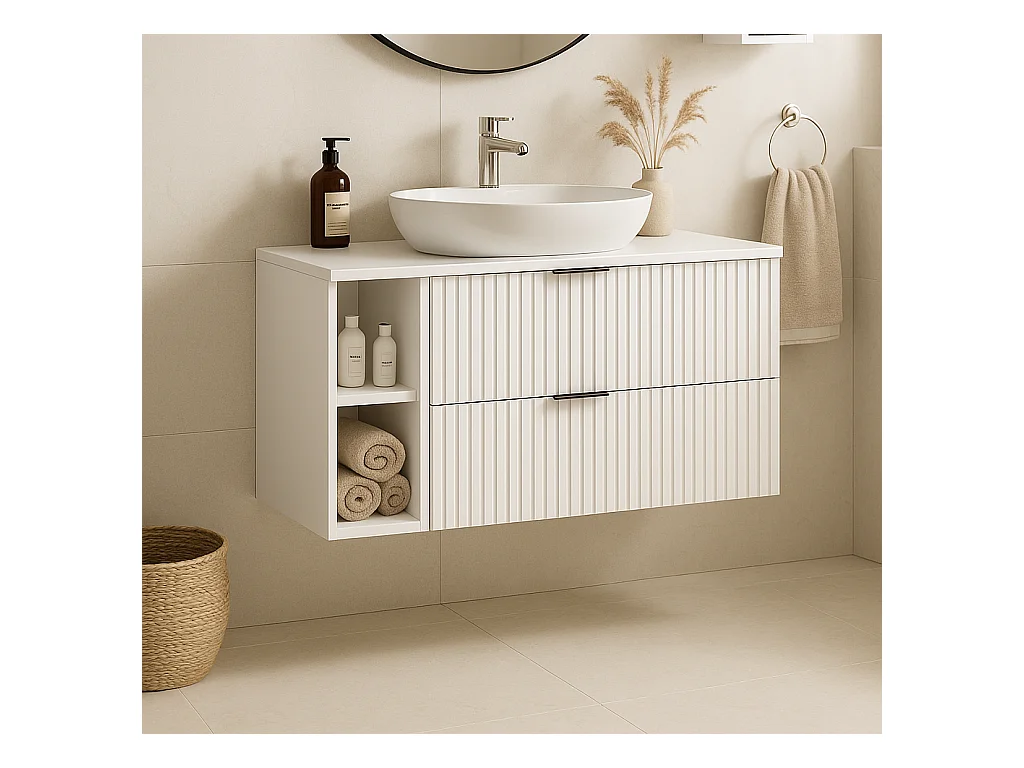 Meuble sous vasque FLOW 100 cm blanc avec étagère et plan chêne craft doré, surface cannelée
