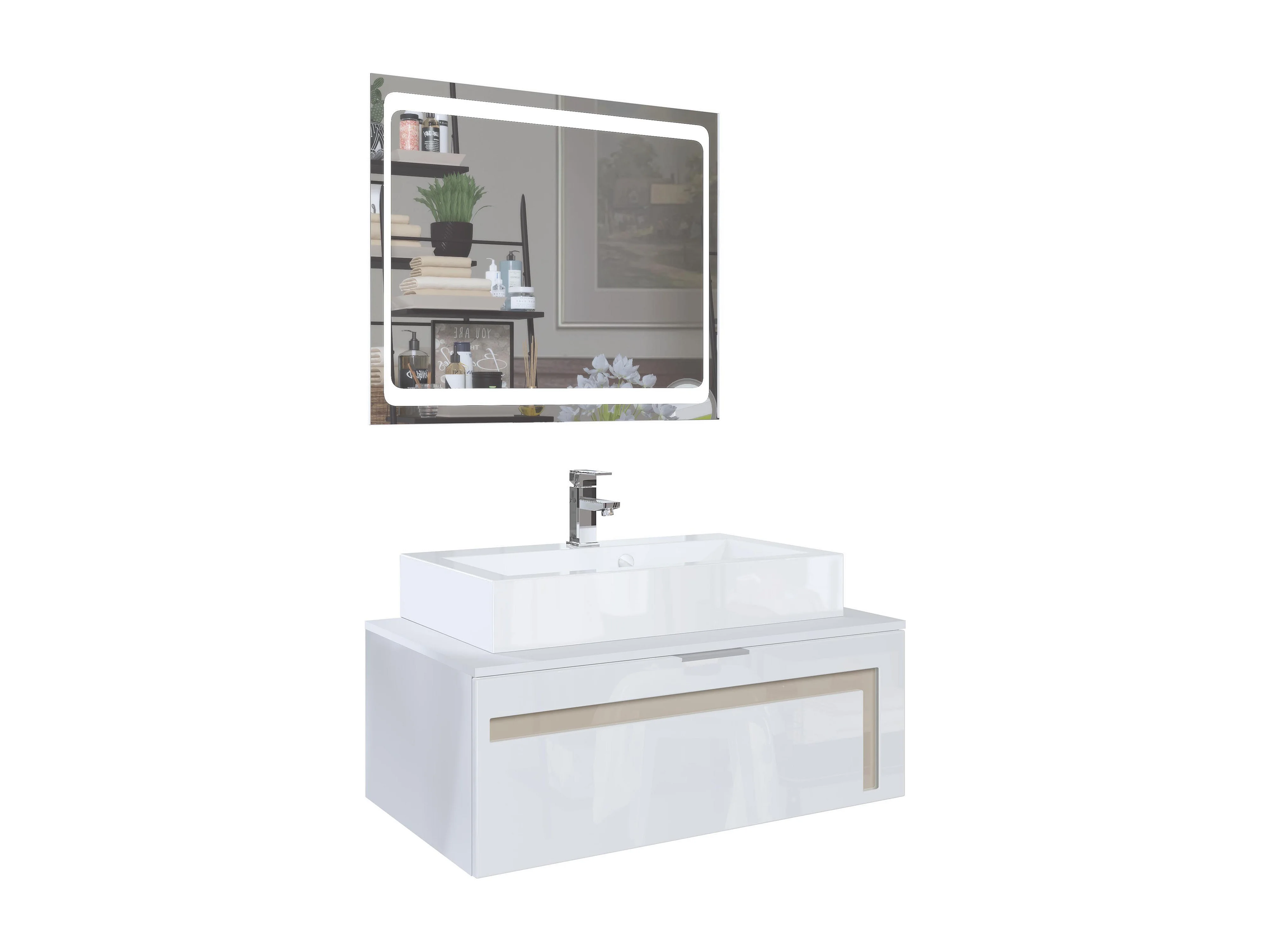 Meuble sous vasque Lavabo Aloha V2, Blanc mat / Façades en Blanc brillant avec un décor en Gris sable brillant, avec Vasque à poser, Robinet (M1) et Miroir LED