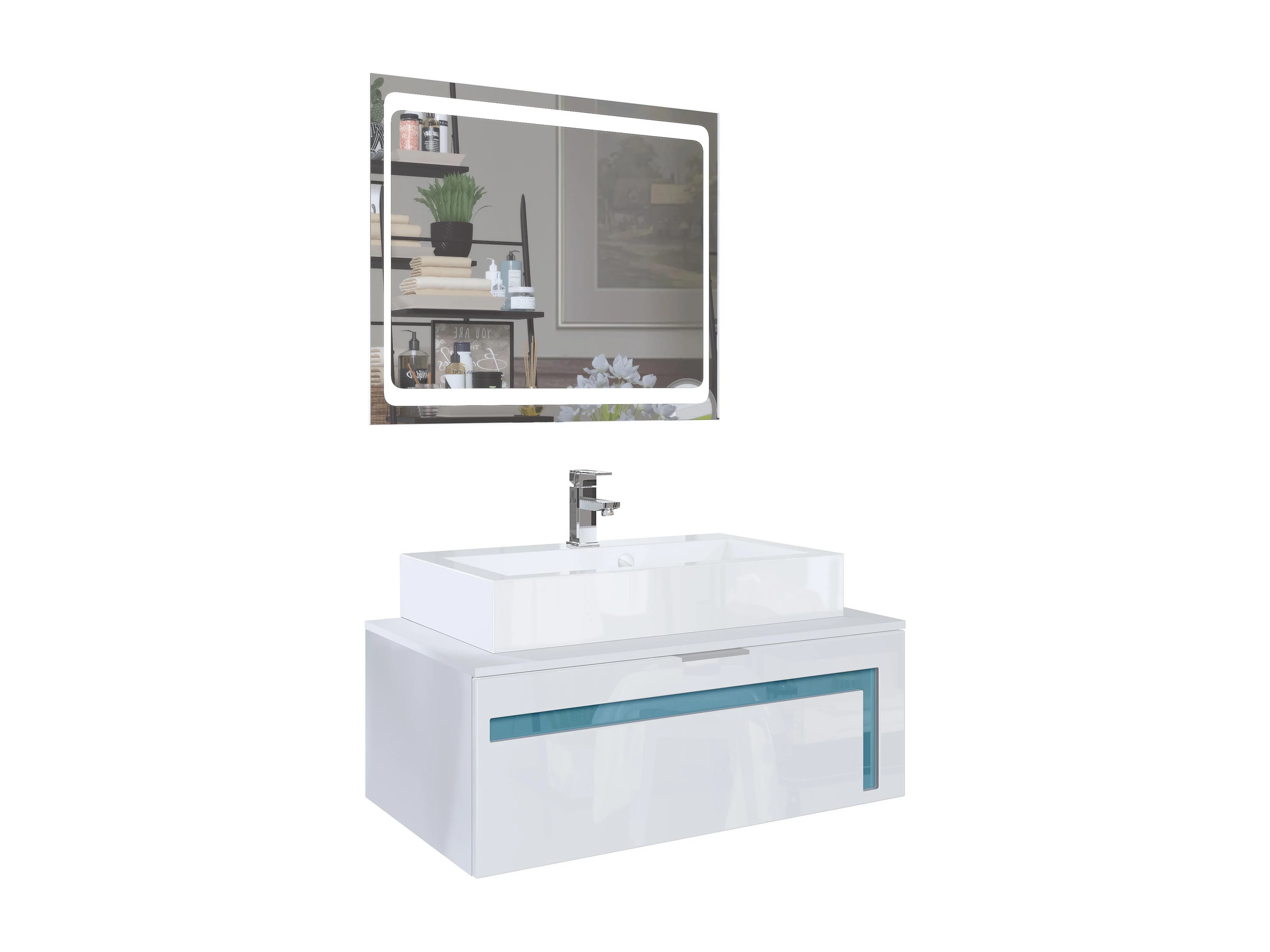 Meuble sous vasque Lavabo Aloha V2, Blanc mat / Façades en Blanc brillant avec un décor en Turquoise brillant, avec Vasque à poser, Robinet (M1) et Miroir LED