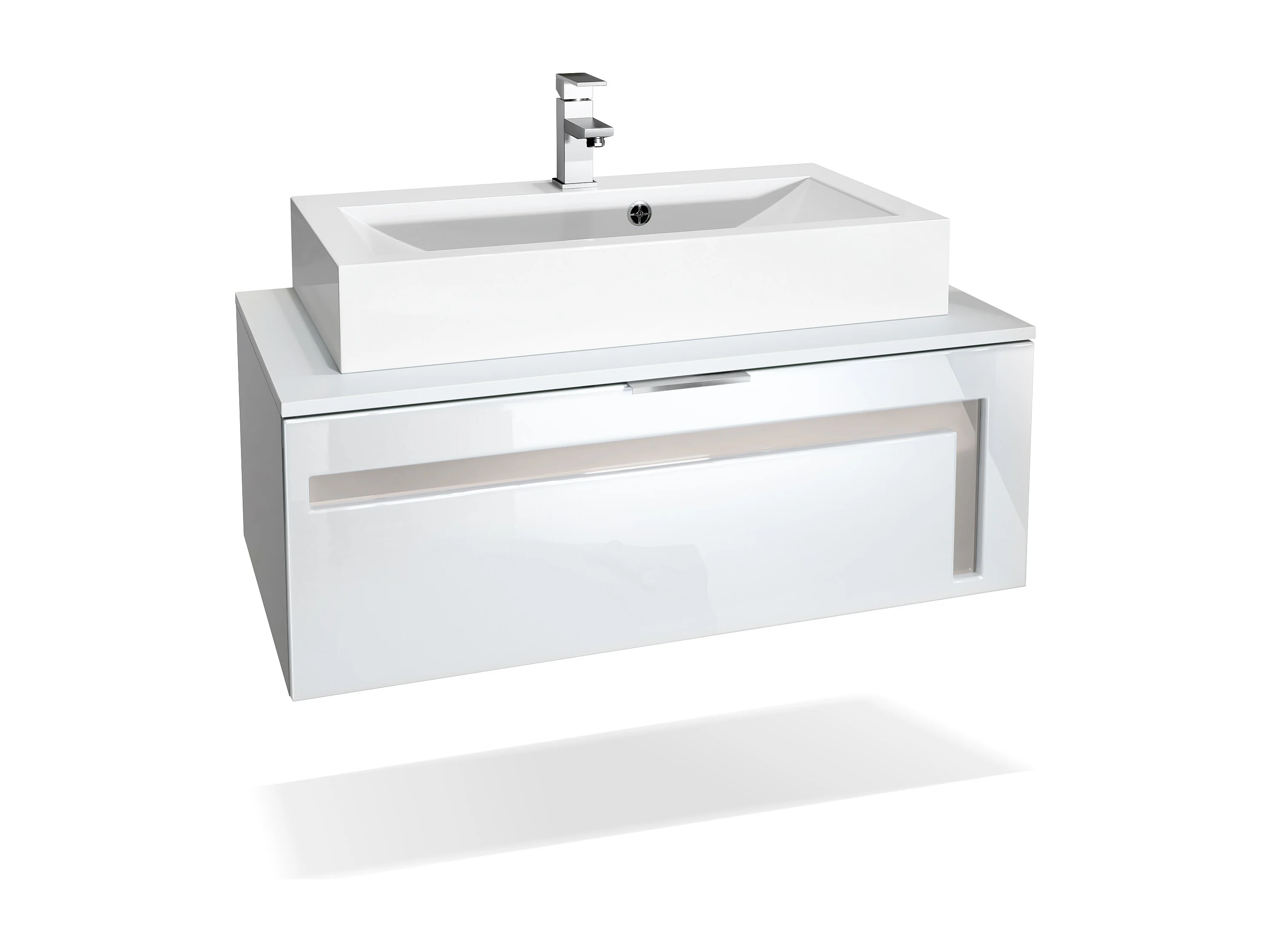 Meuble sous vasque Lavabo Aloha V2, Corps en Blanc mat / Façades en Blanc brillant avec un décor en Gris sable haute brillance, avec Vasque à poser et Robinet (M1)