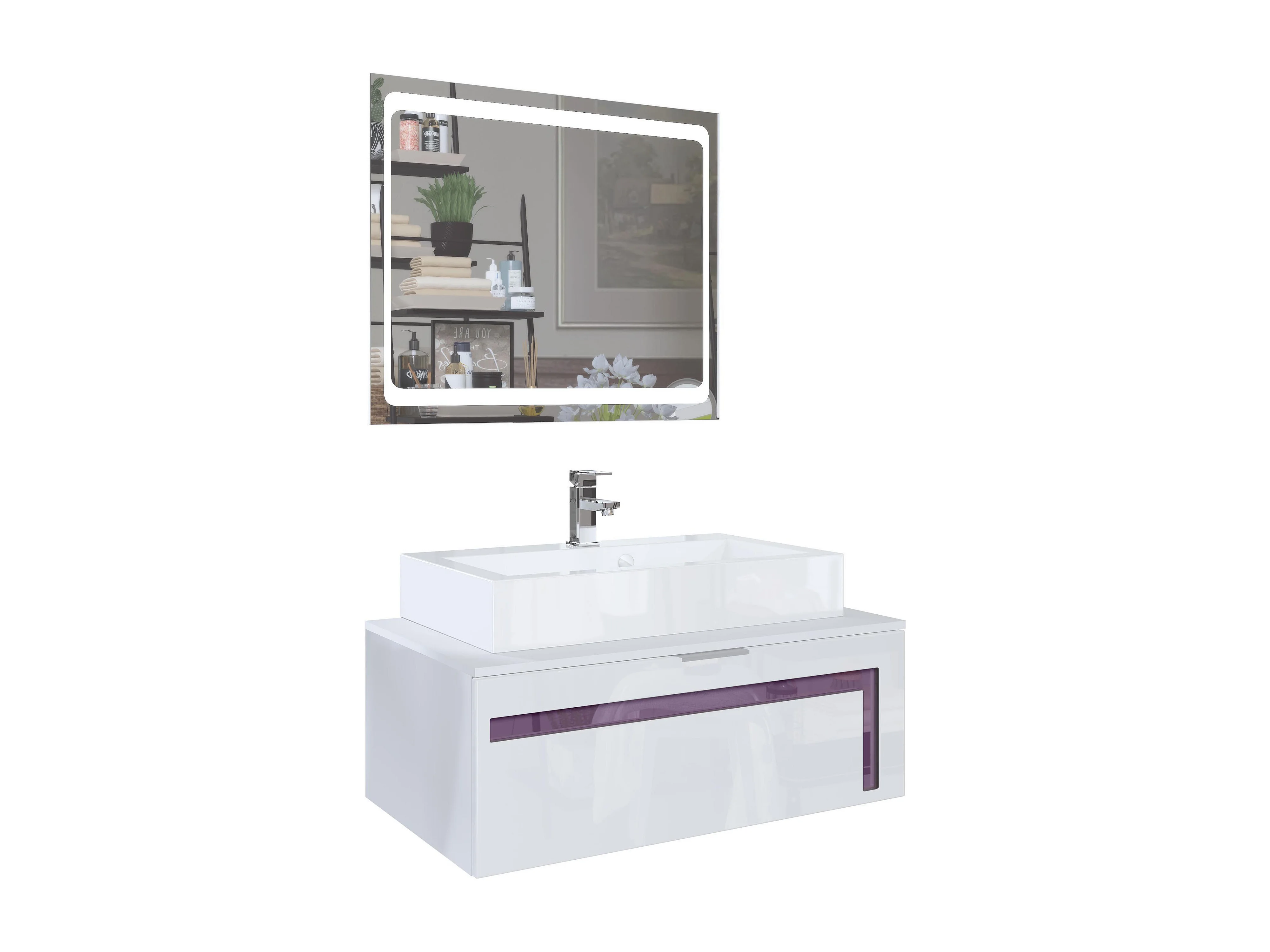 Meuble sous vasque Lavabo Aloha V2, Corps en Blanc mat / Façades en Blanc brillant avec un décor en Mûre brillant, avec Vasque à poser, Robinet (M1) et Miroir LED
