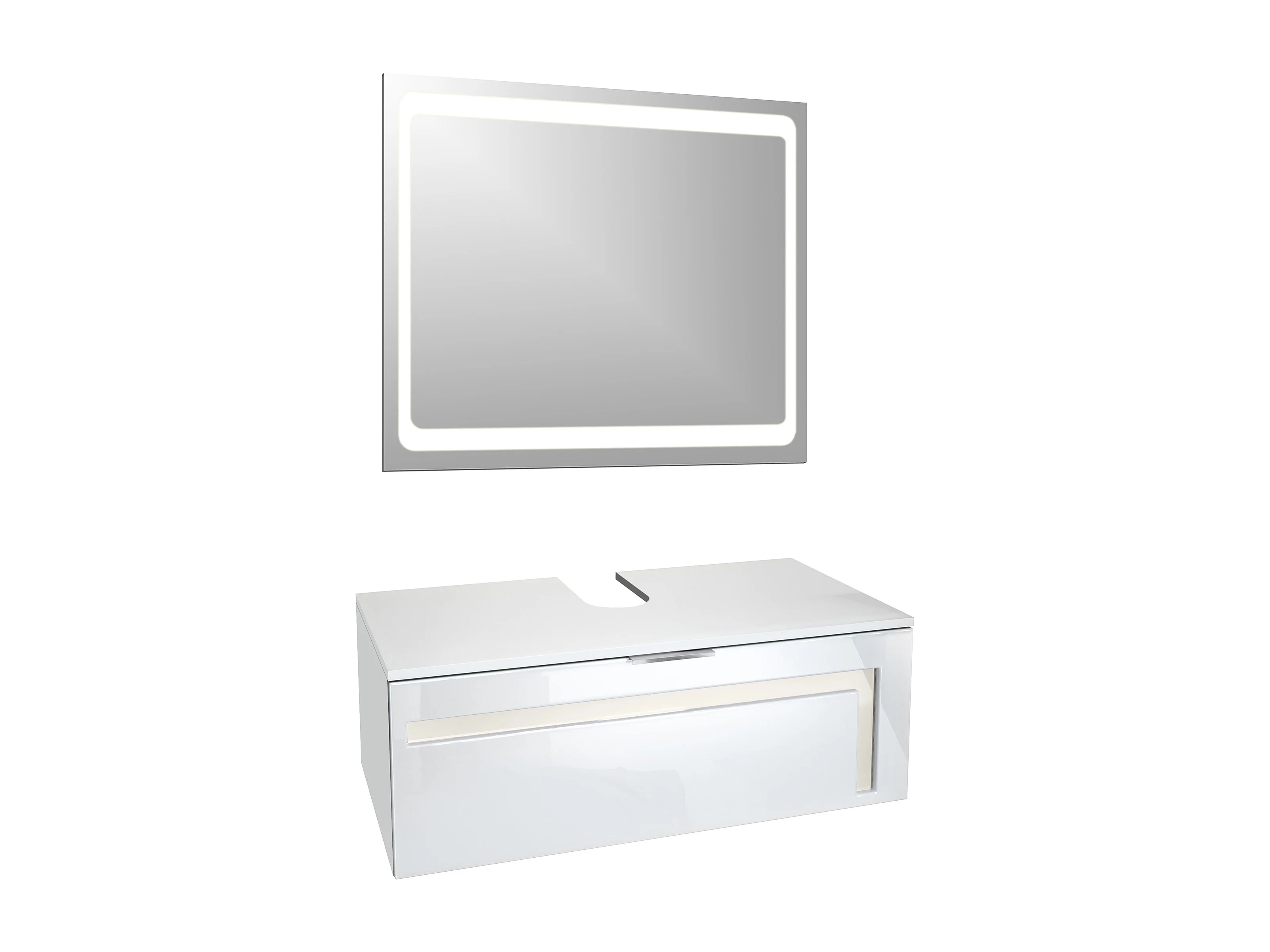 Meuble sous vasque Lavabo Aloha V2, Corps en Blanc mat / Façades en Blanc haute brillance avec un décor en Crème haute brillance, avec Vasque à poser et Miroir LED
