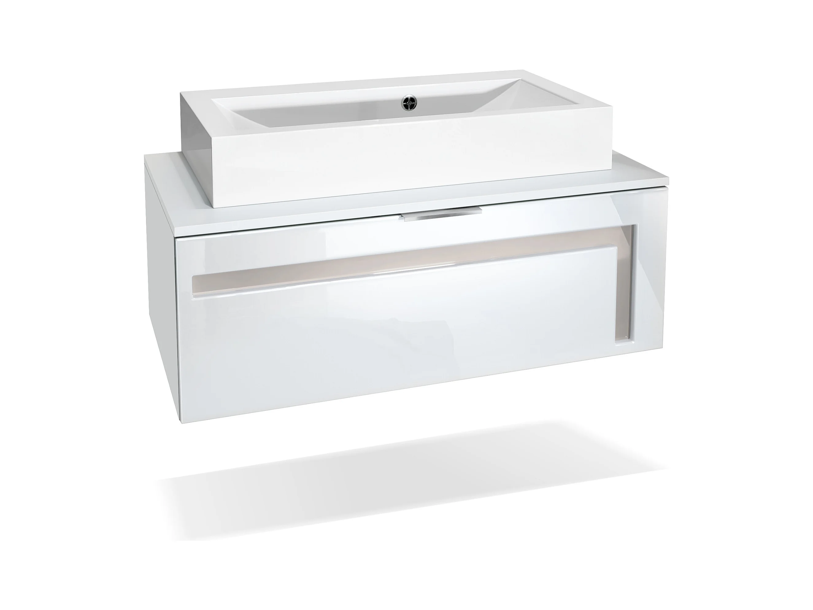 Meuble sous vasque Lavabo Aloha V2, Corps en Blanc mat / Façades en Blanc haute brillance avec un décor en Gris sable haute brillance, avec Vasque à poser