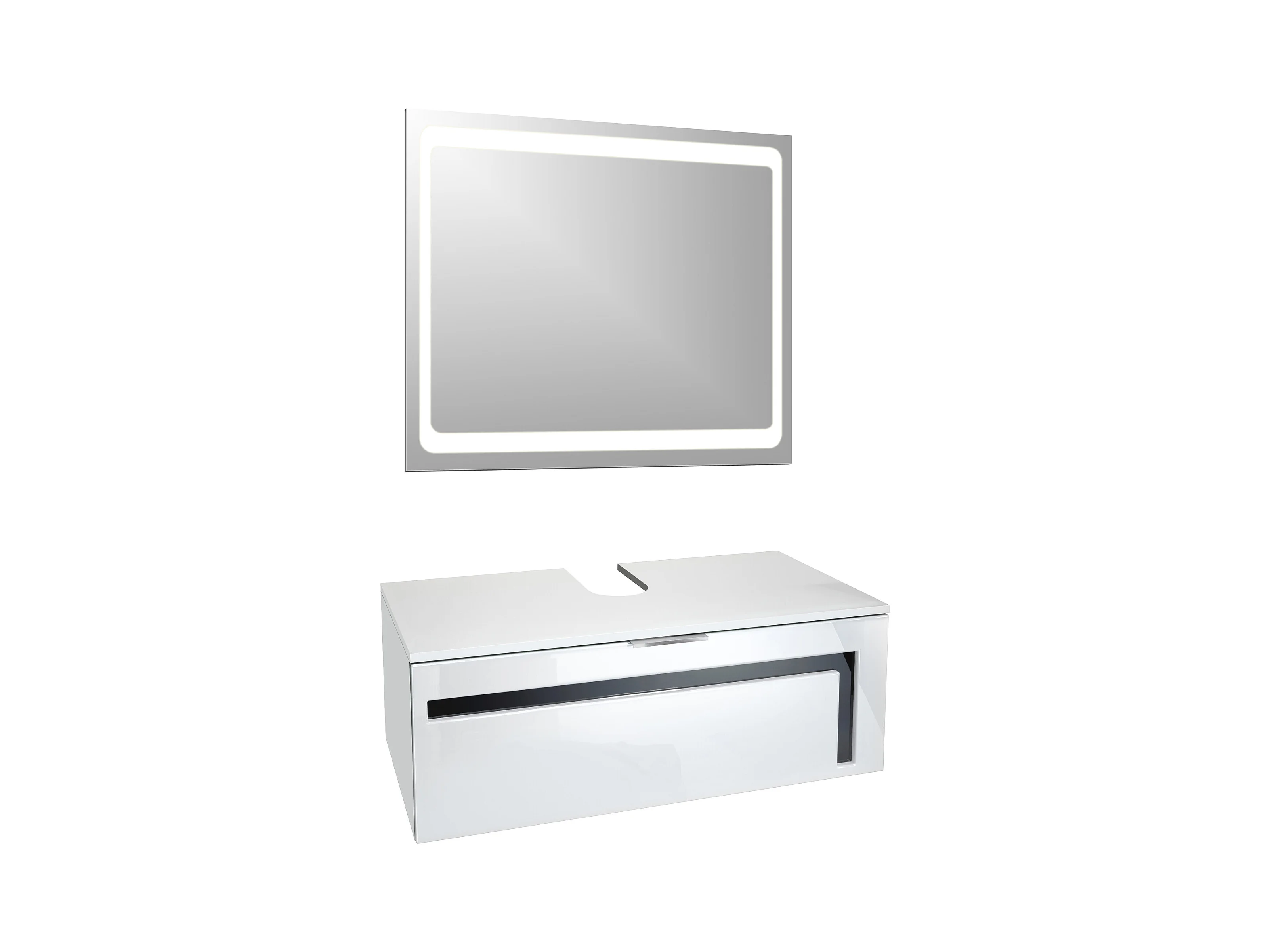 Meuble sous vasque Lavabo Aloha V2, Corps en Blanc mat / Façades en Blanc haute brillance avec un décor en Noir haute brillance, avec Vasque à poser et Miroir LED