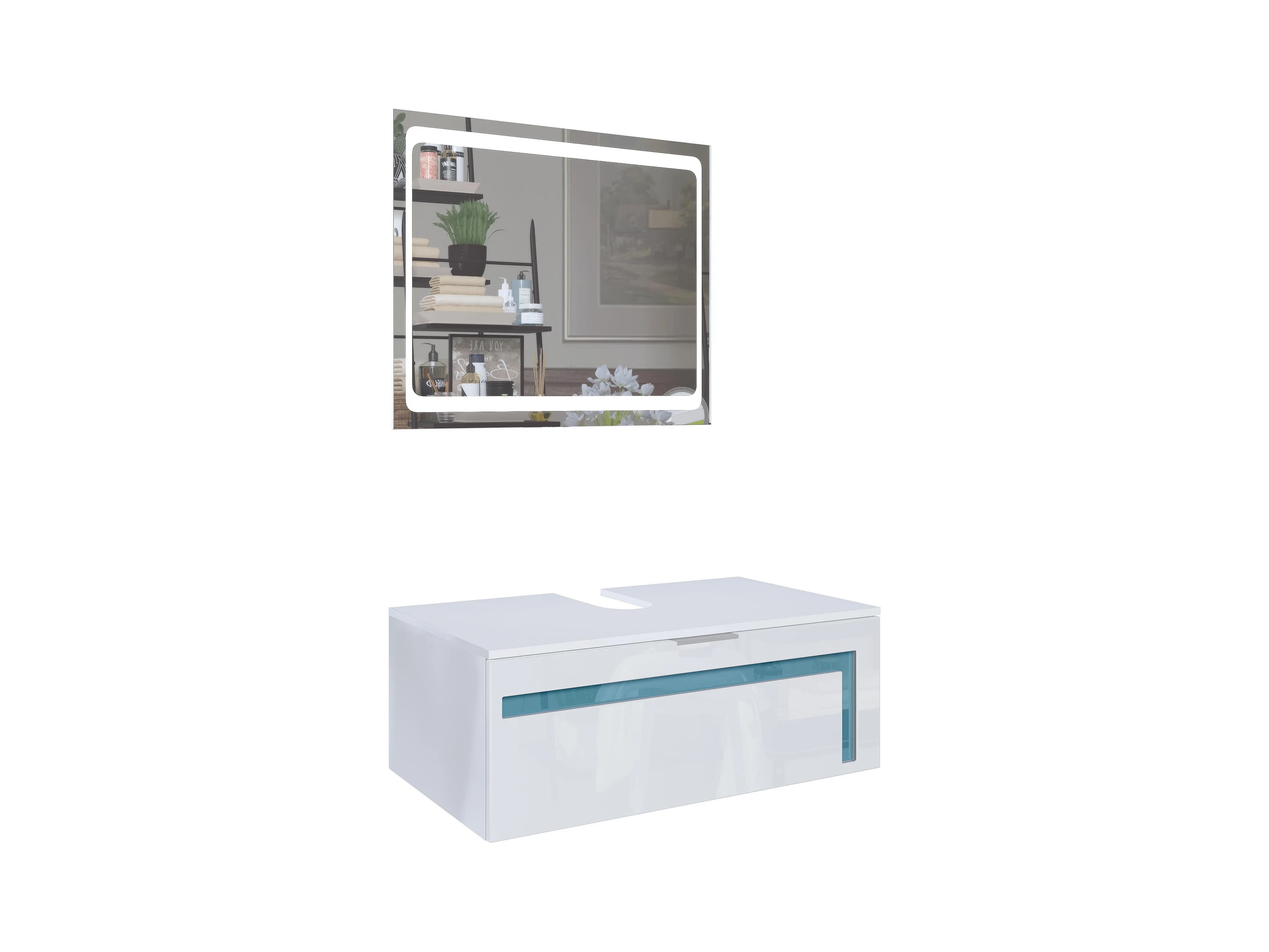 Meuble sous vasque Lavabo Aloha V2, Corps en Blanc mat / Façades en Blanc haute brillance avec un décor en Turquoise haute brillance, avec Miroir LED