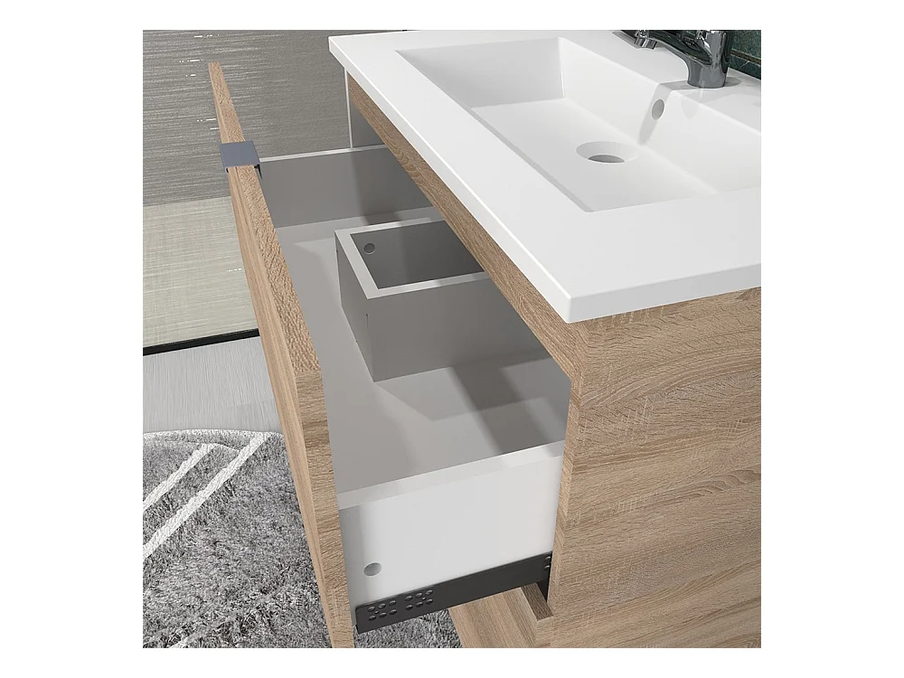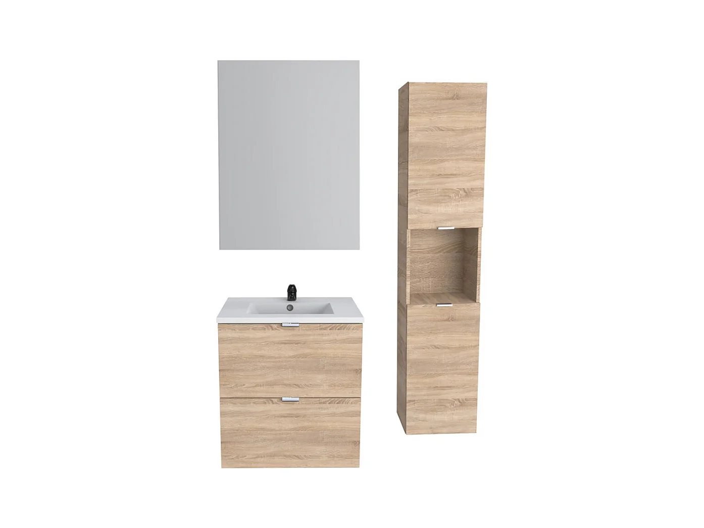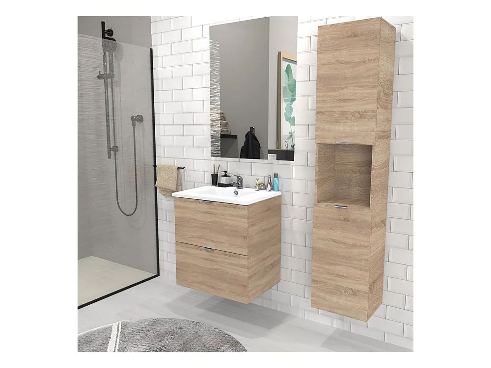 Meuble sous vasque MALAGA 60 cm + vasque + miroir + colonne / Décor Chêne blanchi