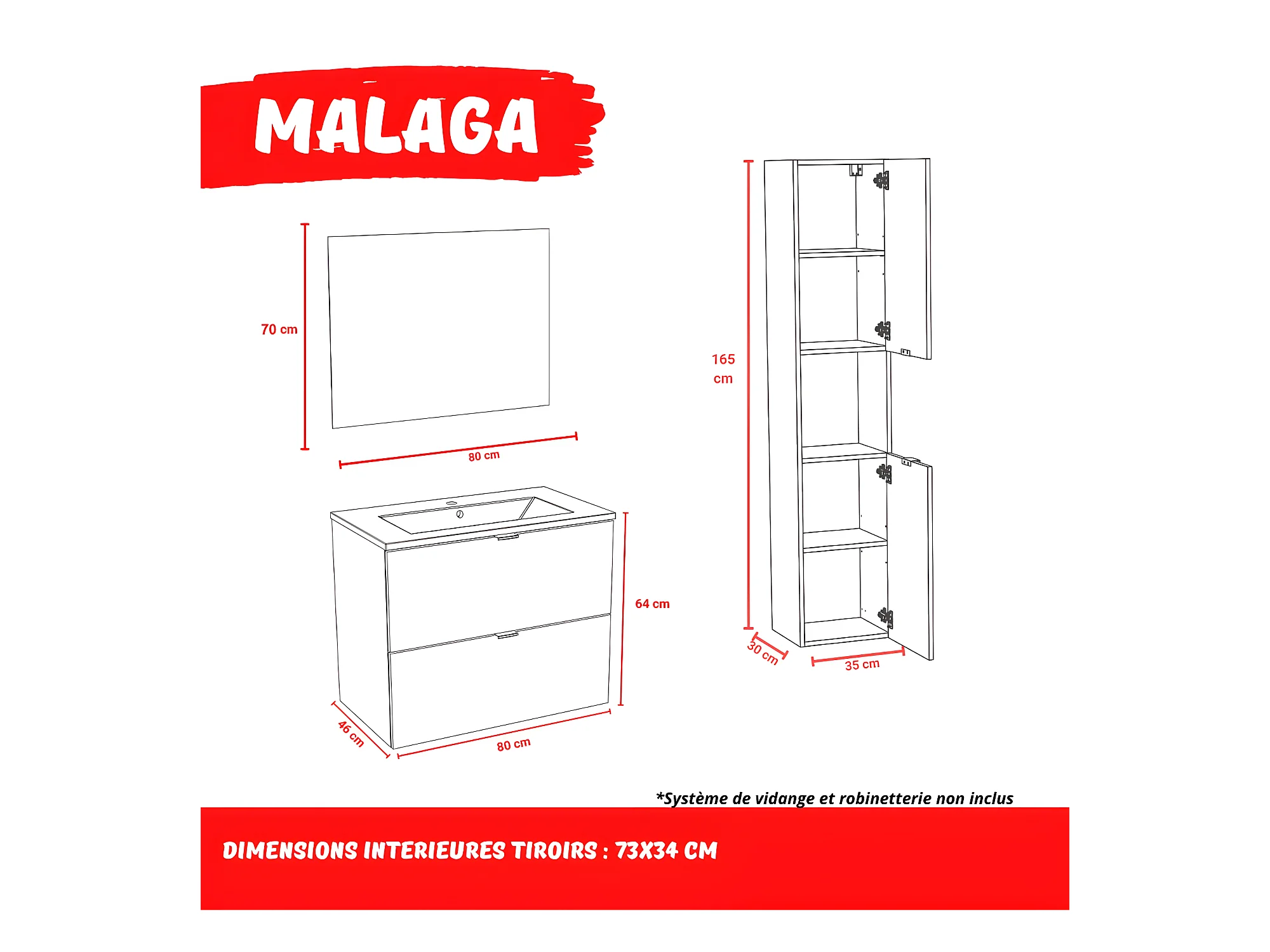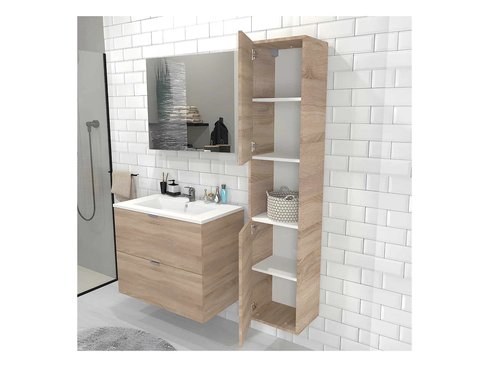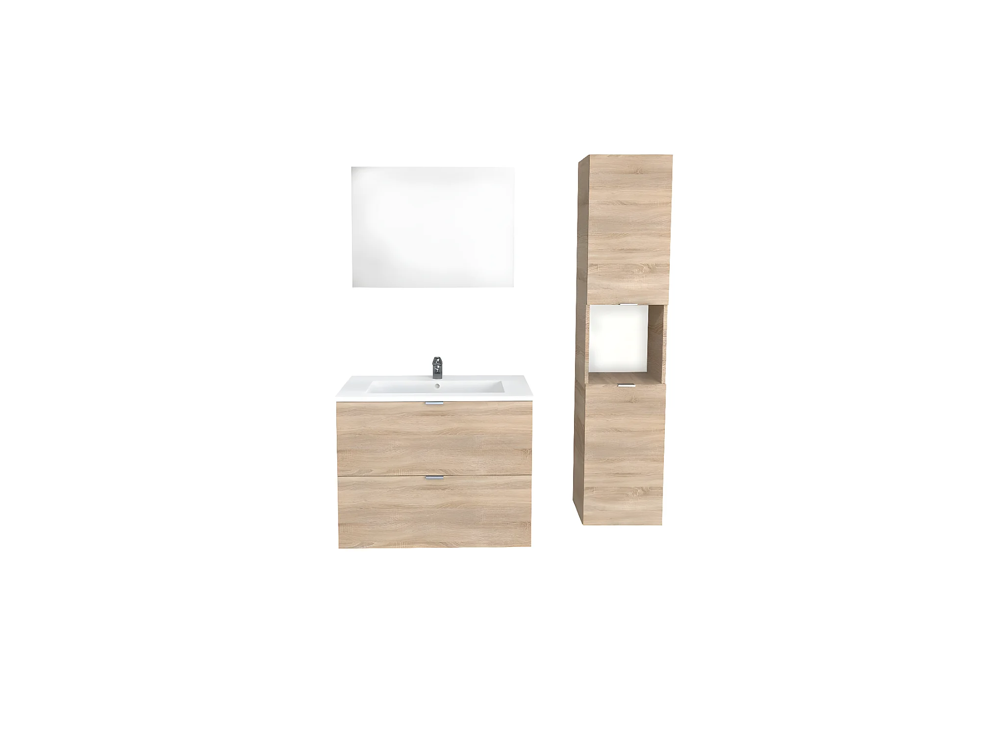 Meuble sous vasque MALAGA 80 cm + vasque + miroir + colonne / Décor Chêne blanchi