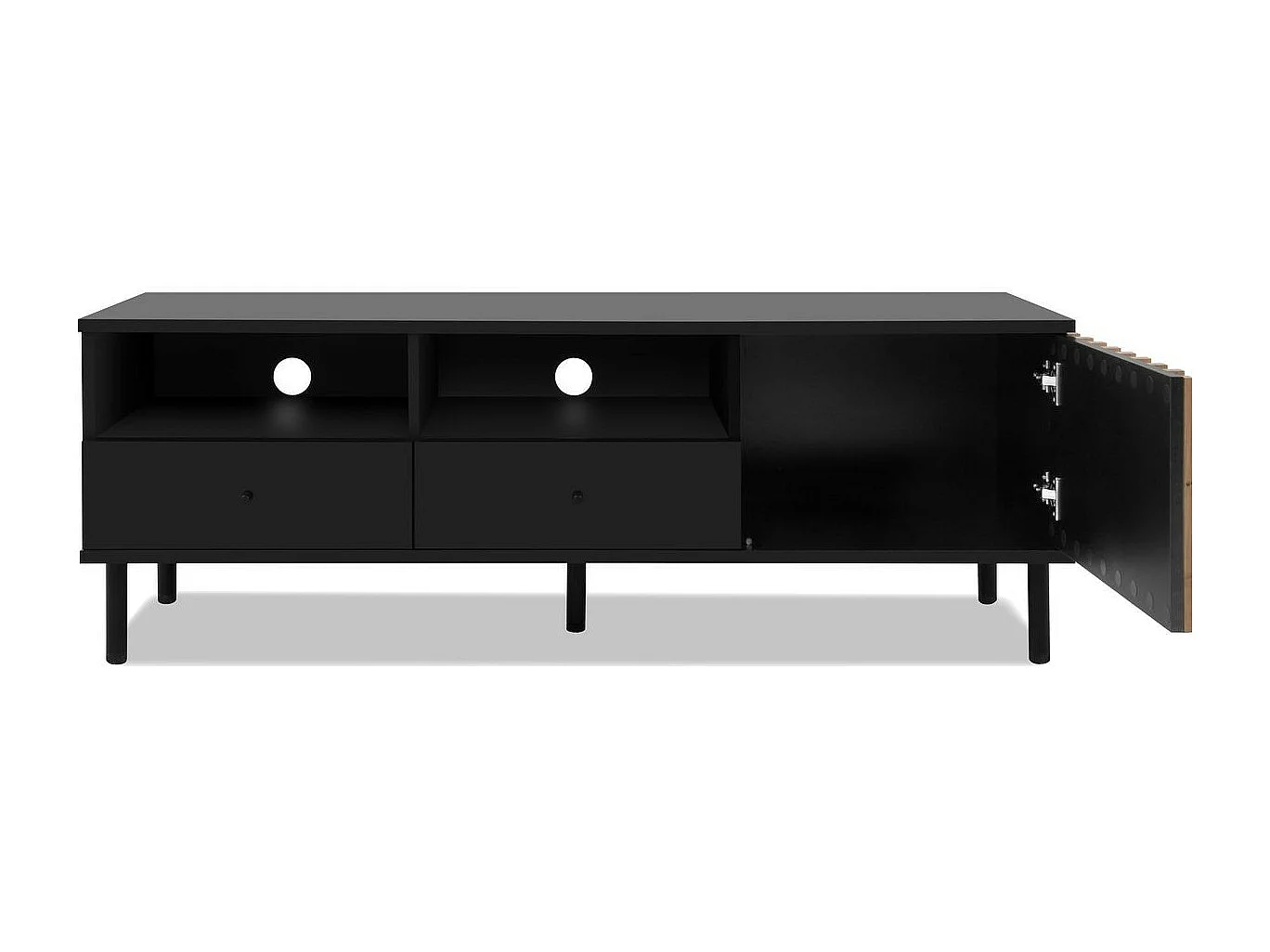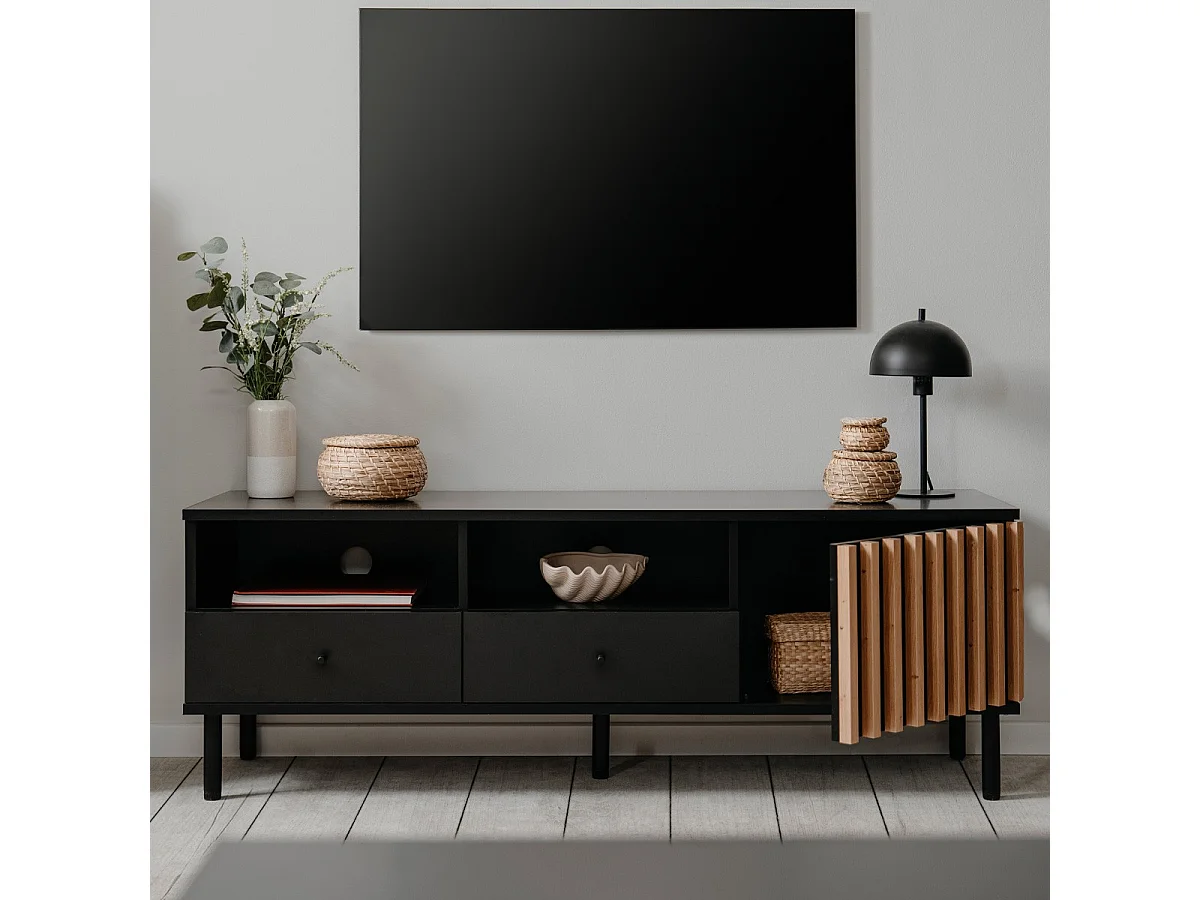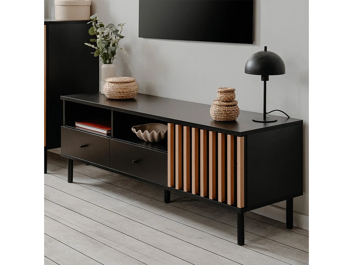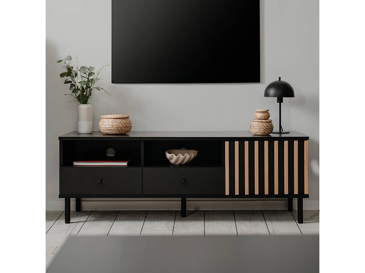Meuble TV 1 porte, 2 tiroirs, 2 niches noir et effet chêne - Morgan