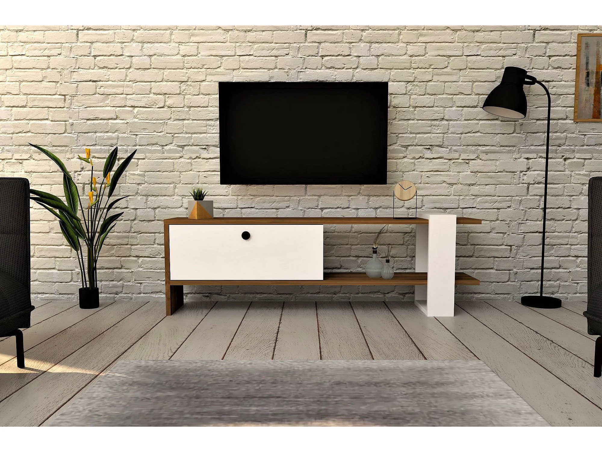 Meuble TV 1 porte kaine 120cm Bois Naturel et Blanc