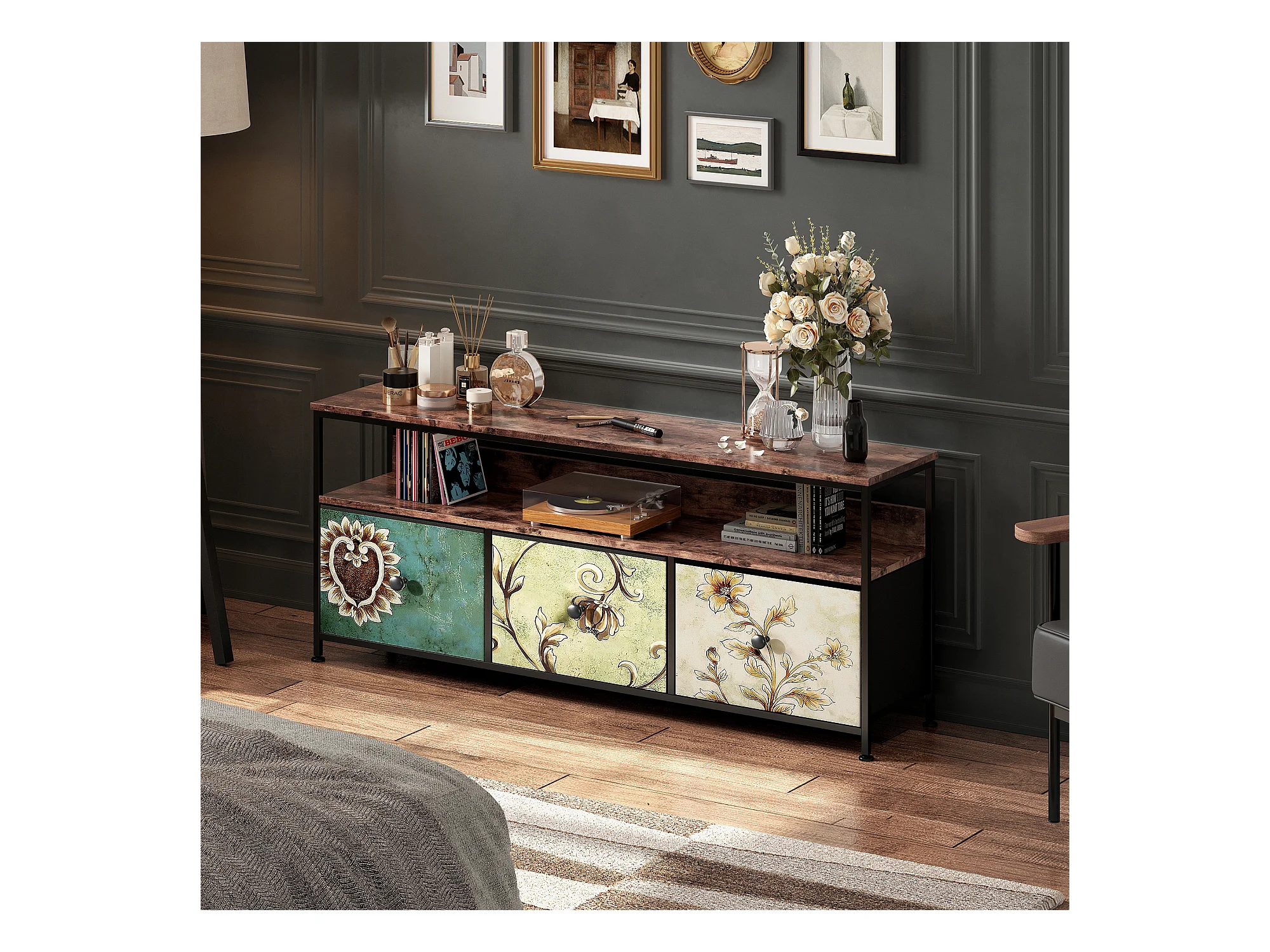 Meuble TV LED RGB – 3 Tiroirs Vintage, Structure Métal, Étagère Réglable, 137x30x57 cm