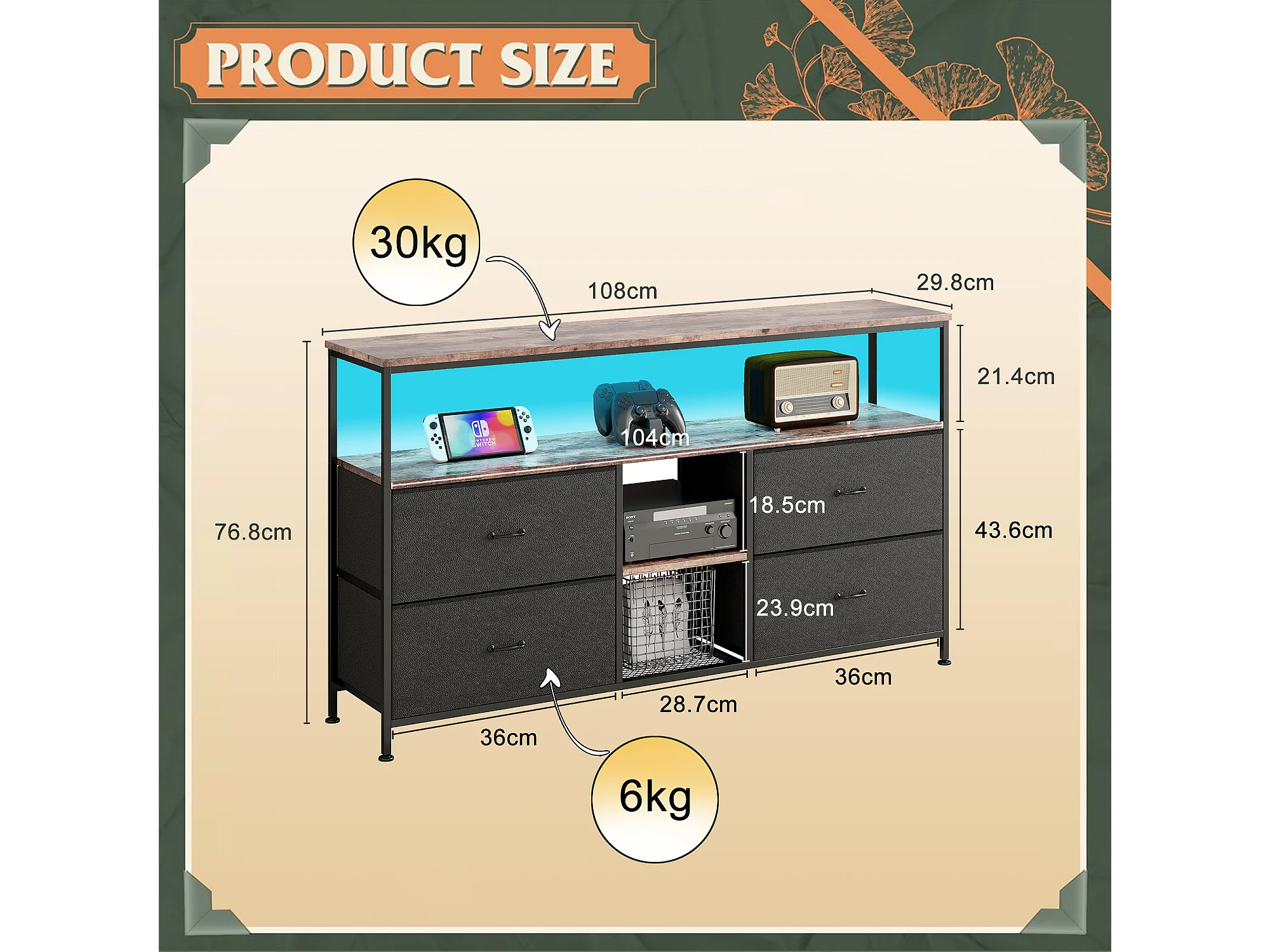 Meuble TV 108 cm avec LED, plateau effet bois tigre, 4 tiroirs en tissu PU noir, cadre métal robuste, pieds réglables, style rétro-moderne