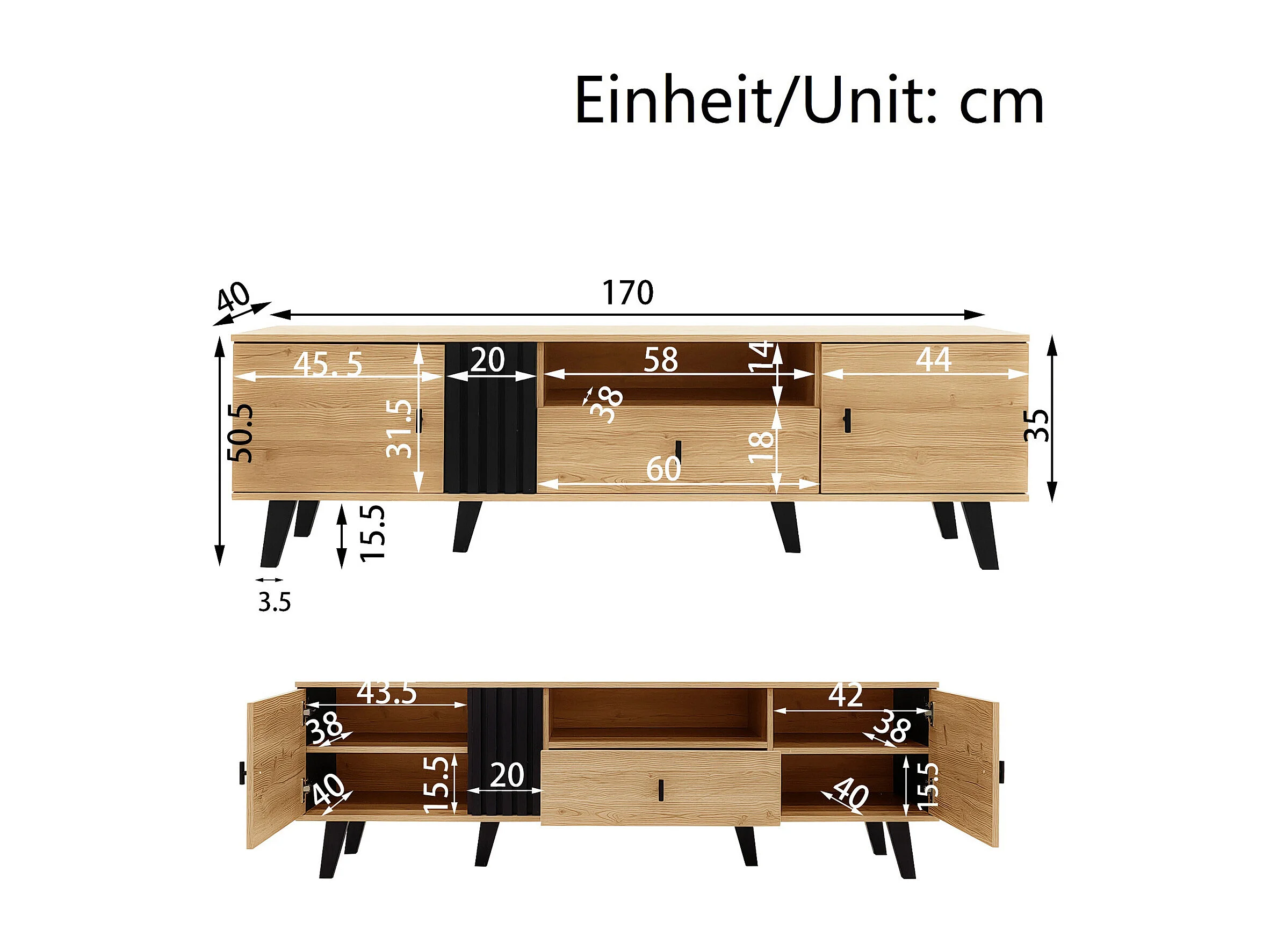 Meuble TV 170cm, design bois et noir, avec tiroirs, espace de rangement polyvalent