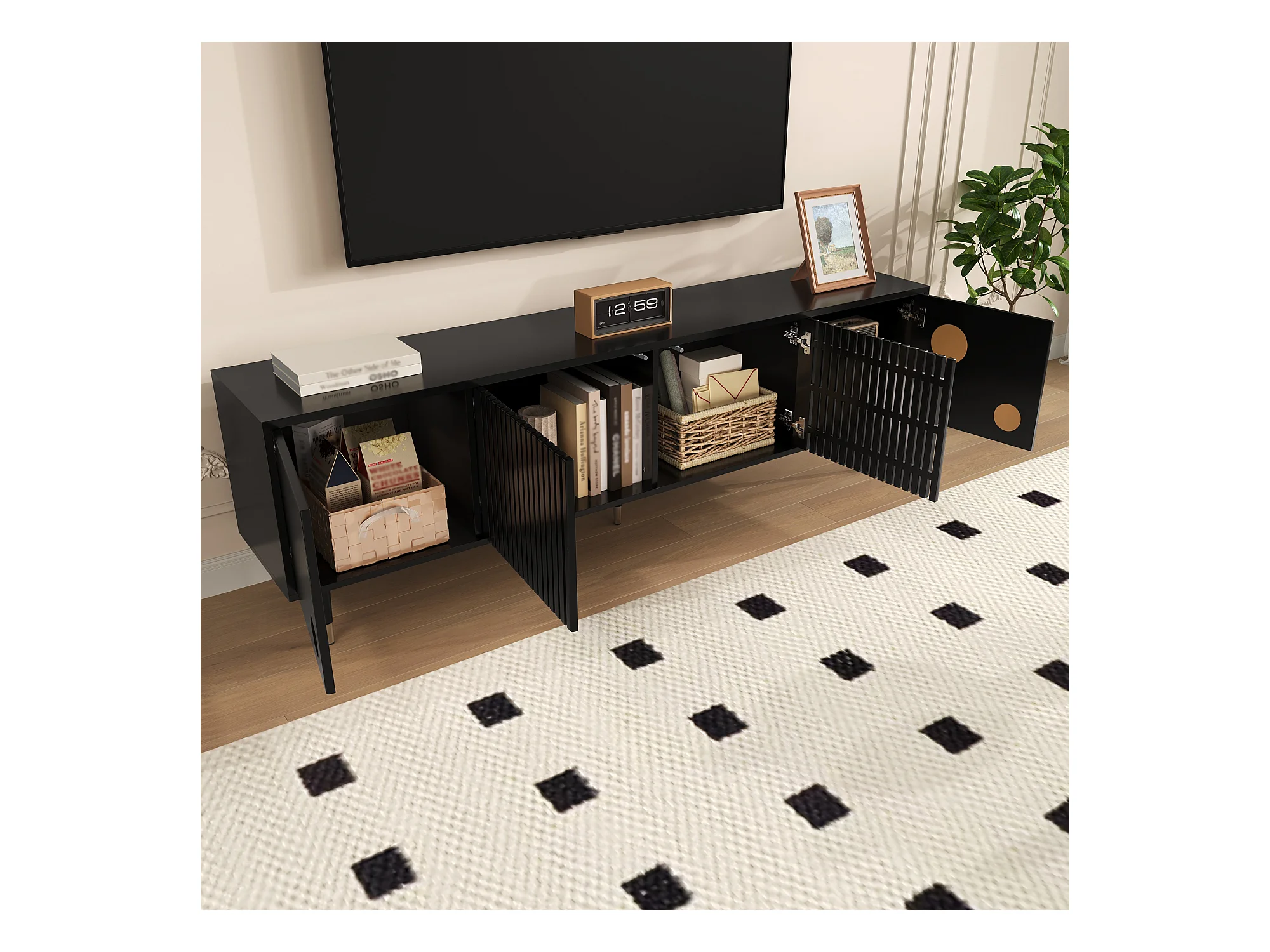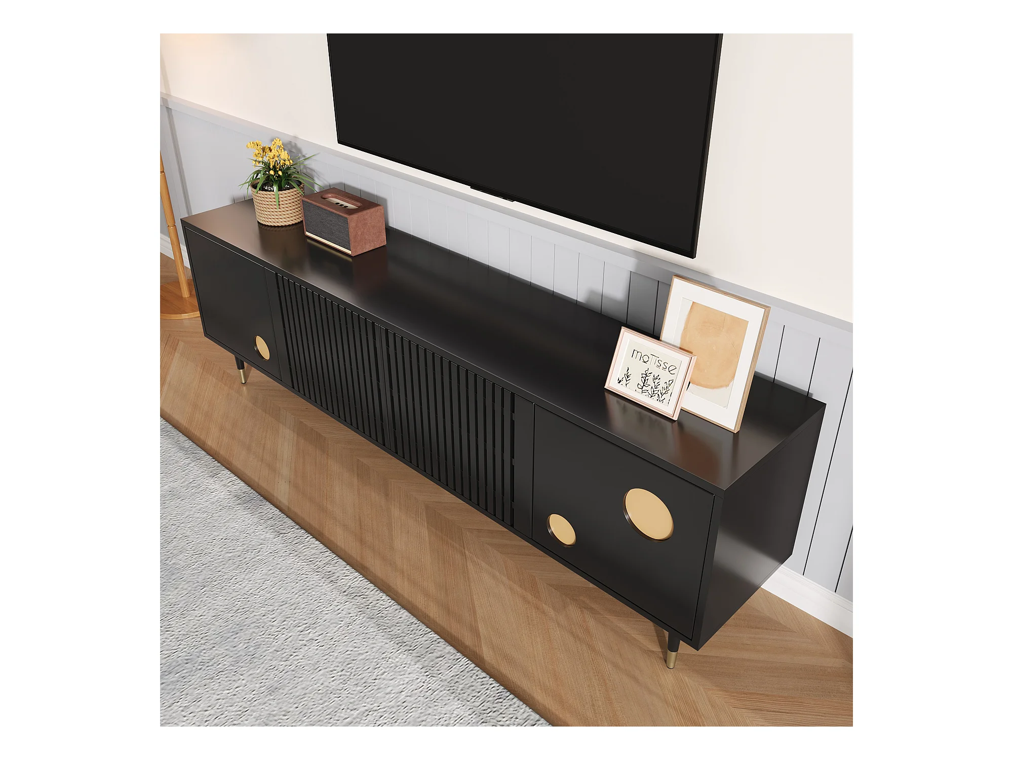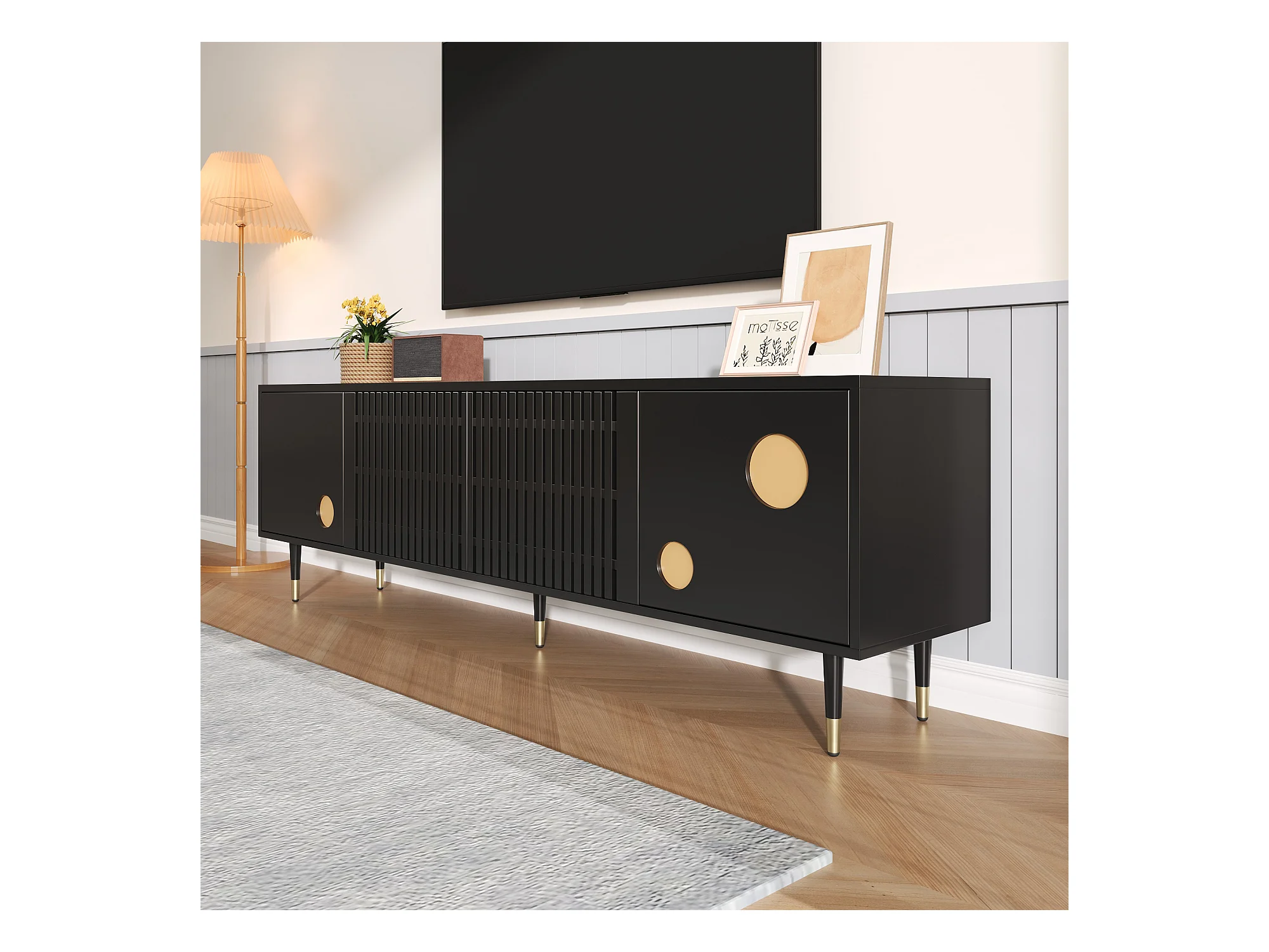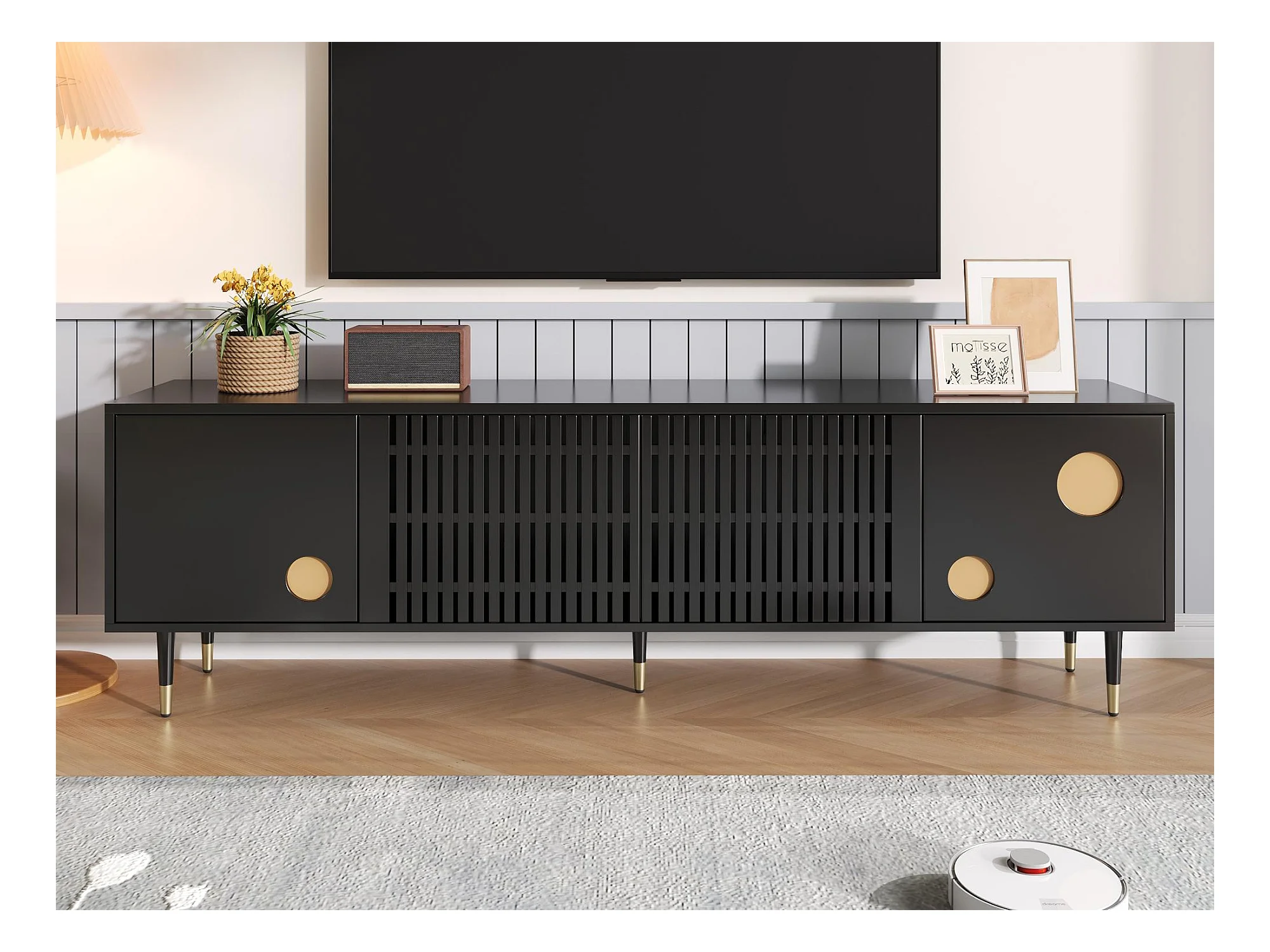 Meuble TV moderne 170x38x44cm - avec 4 portes texturées - bordure dorée - pieds ronds dorés - noir