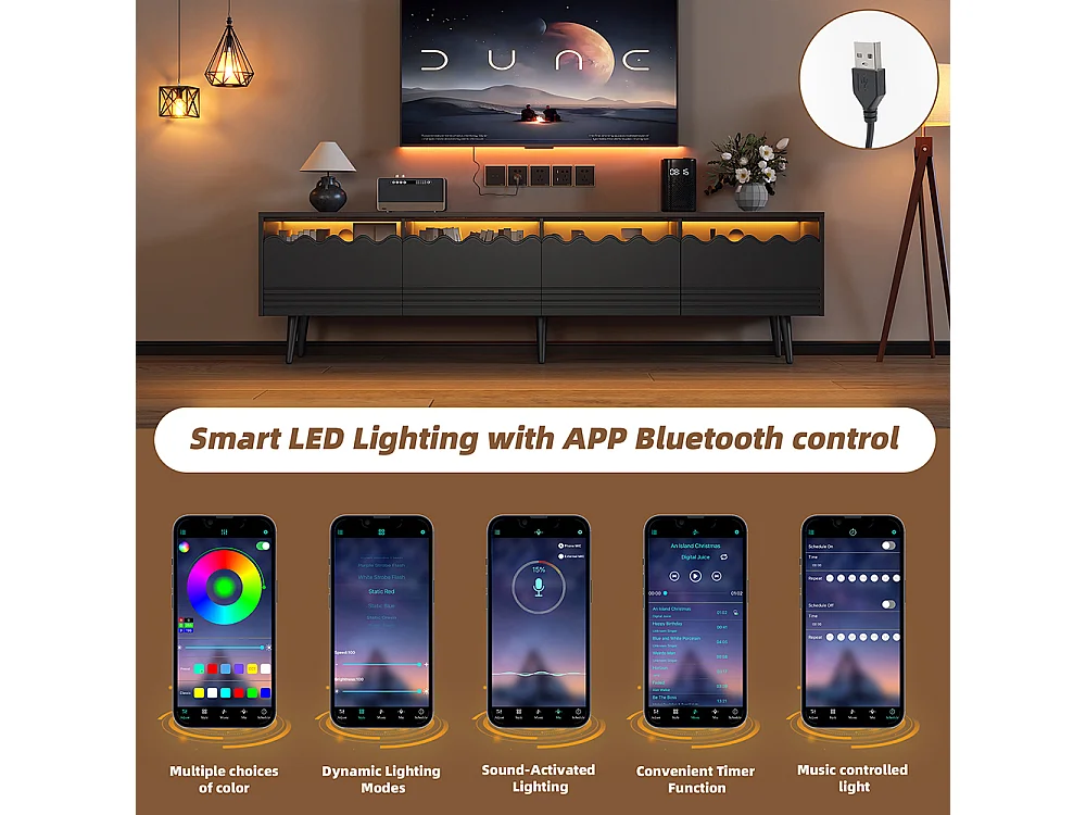 Meuble TV avec 2 portes moderne pour téléviseurs jusqu'à 70 pouces espace de rangement ouvert avec affichage LED couleur d'origine du bois et cadre noir