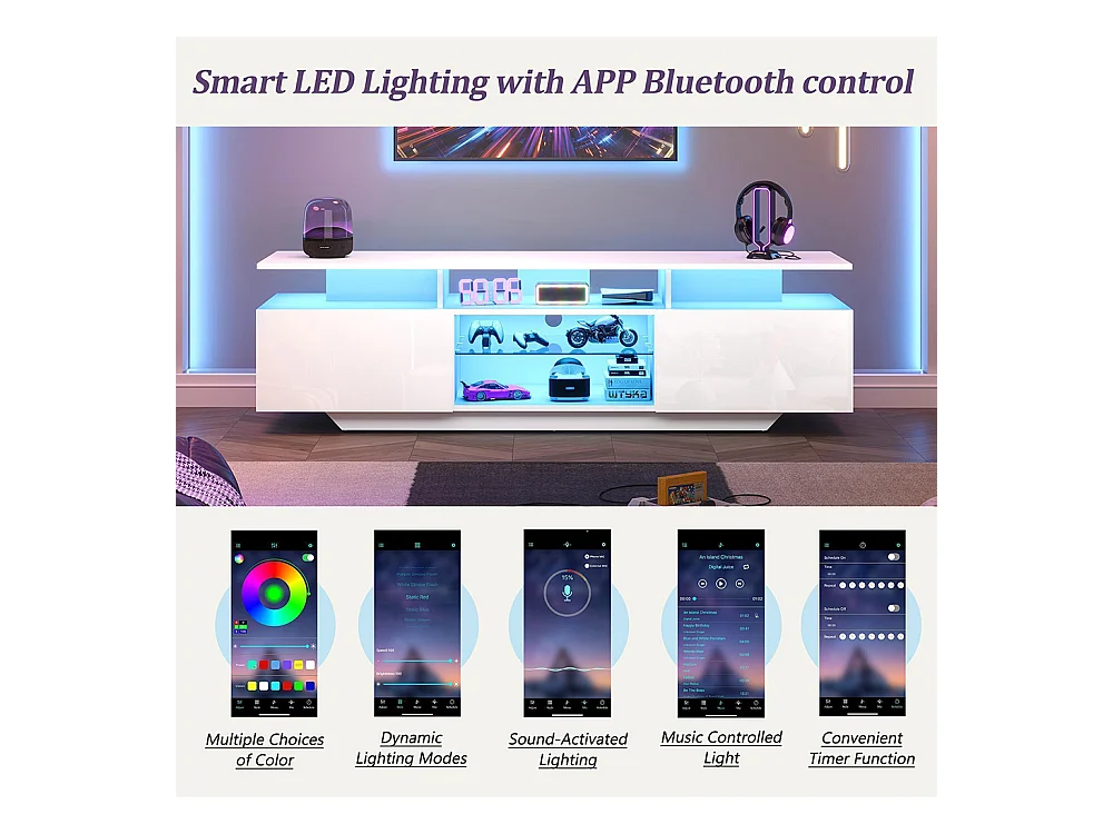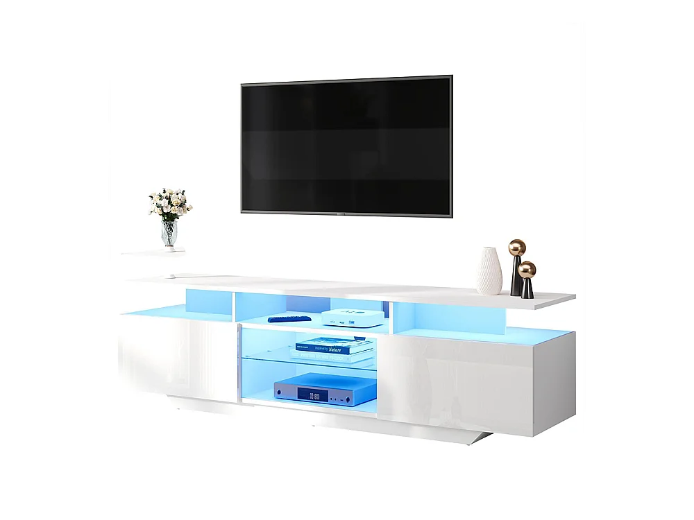 Meuble TV 2 armoires LED bande lumineuse brillant 8 étagères MDF TV 70 pouces moderne