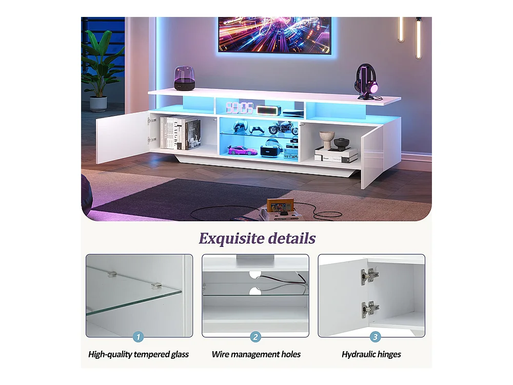 Meuble TV bas salon 2 armoires L 1 tiroir LED brillant rangement semi-ouvert TV 75 pouces