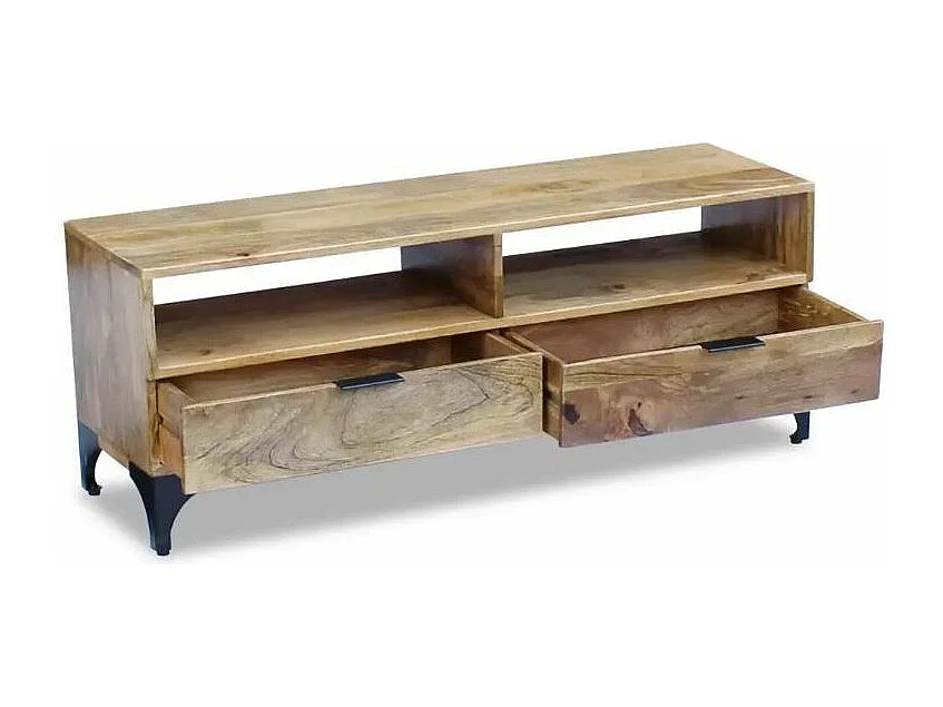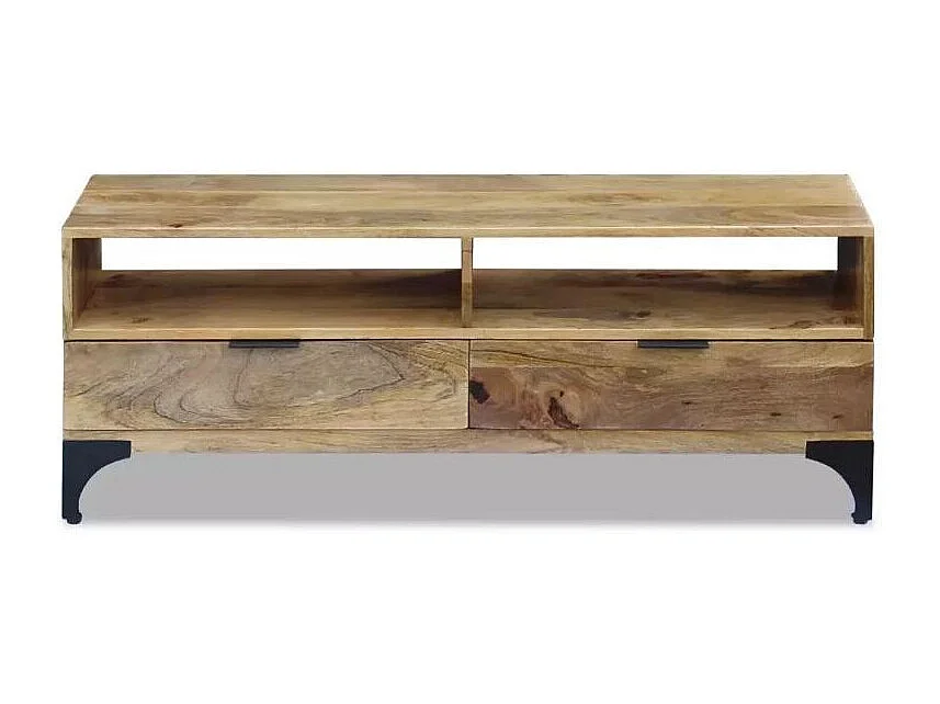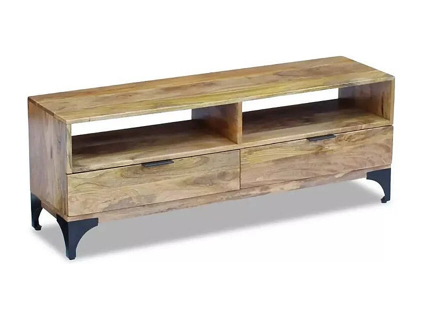 Meuble TV 2 niches 2 tiroirs manguier massif pieds métal Induka
