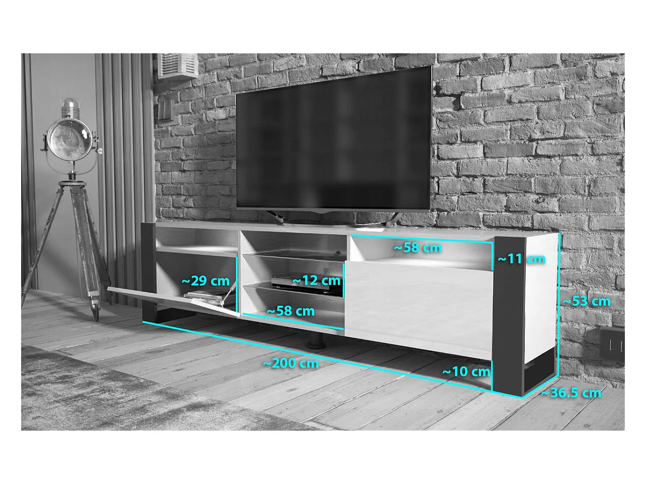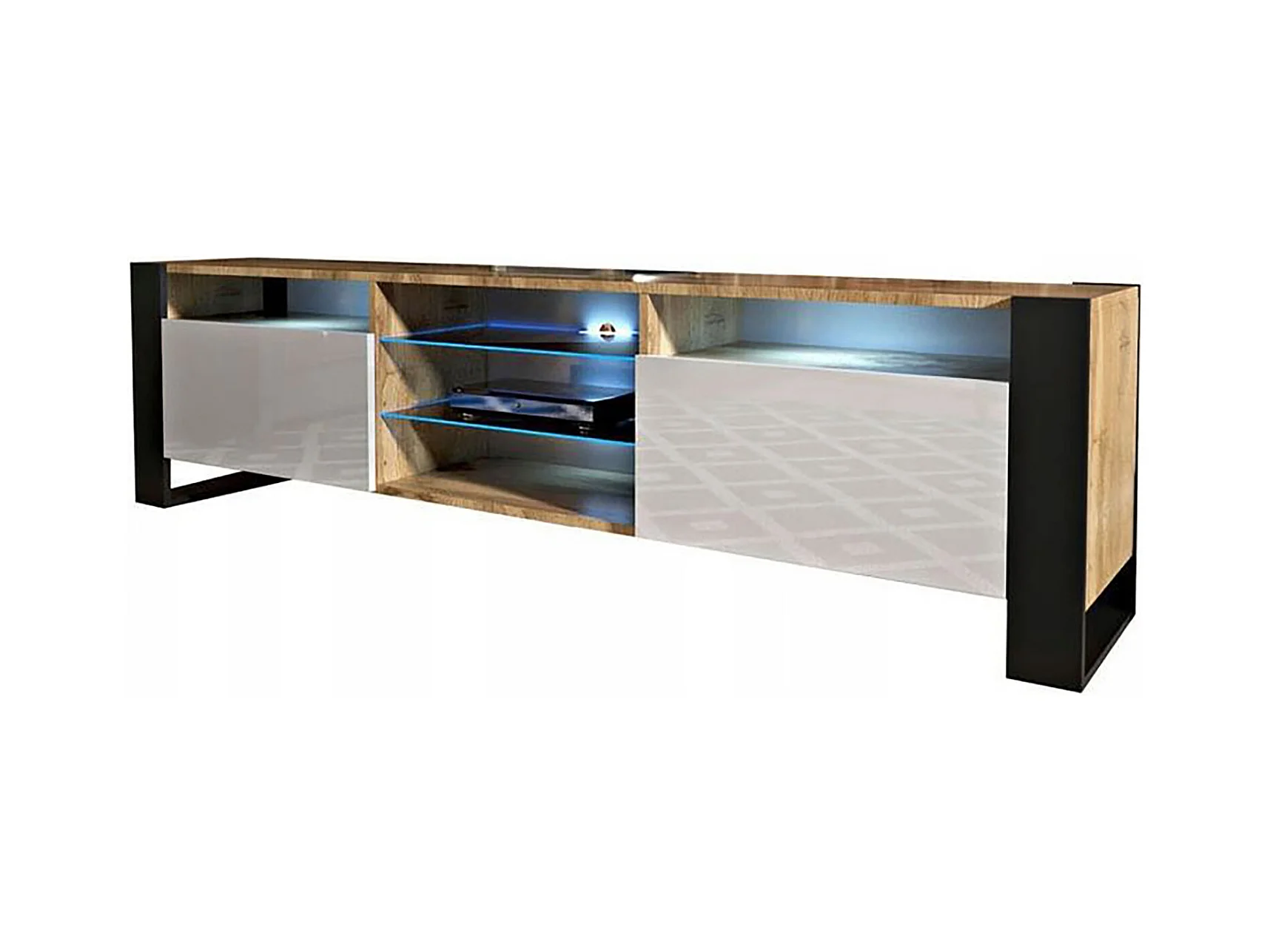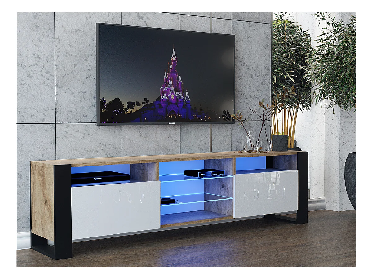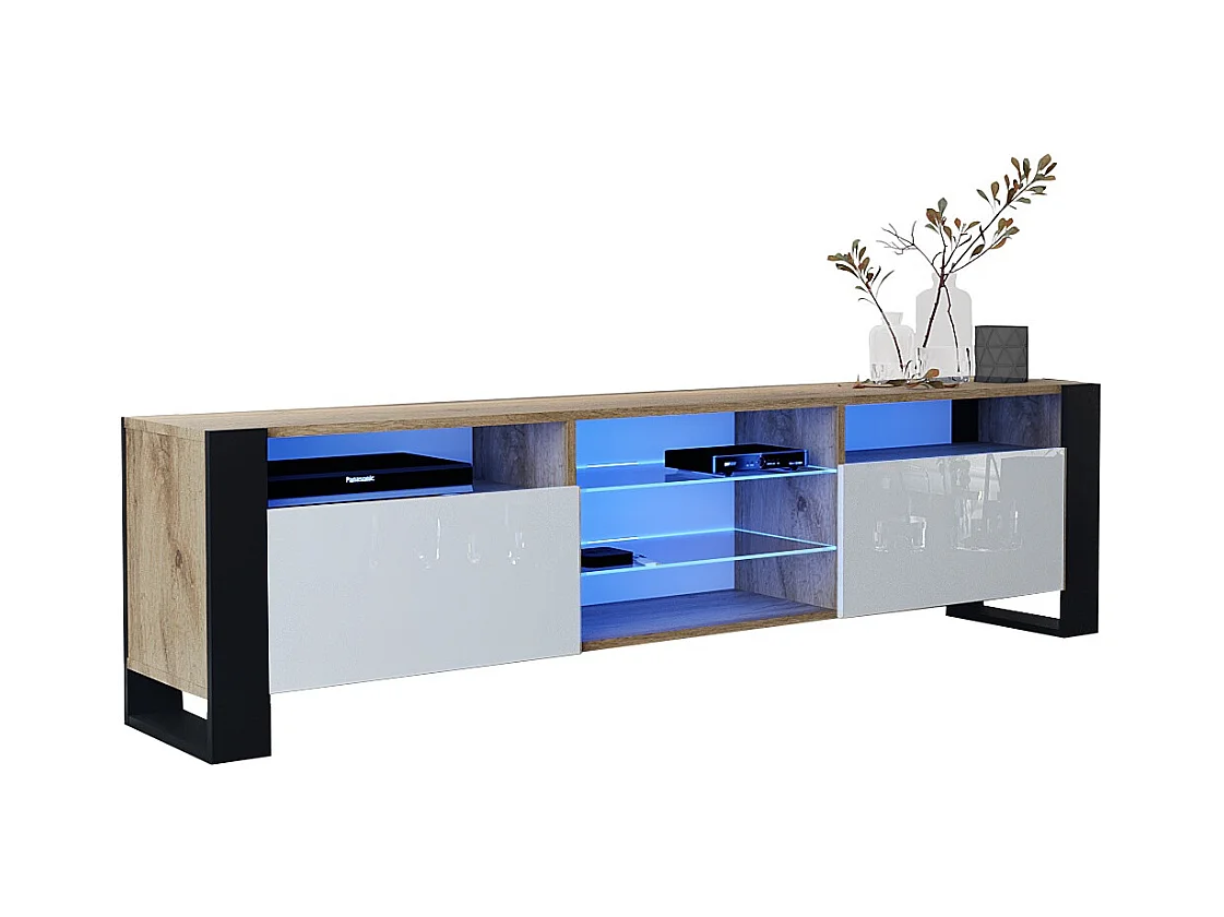 MEUBLE TV 200 CM LOVY LED CHENE MAT ET BLANC LAQUE - STYLE INDUSTRIEL