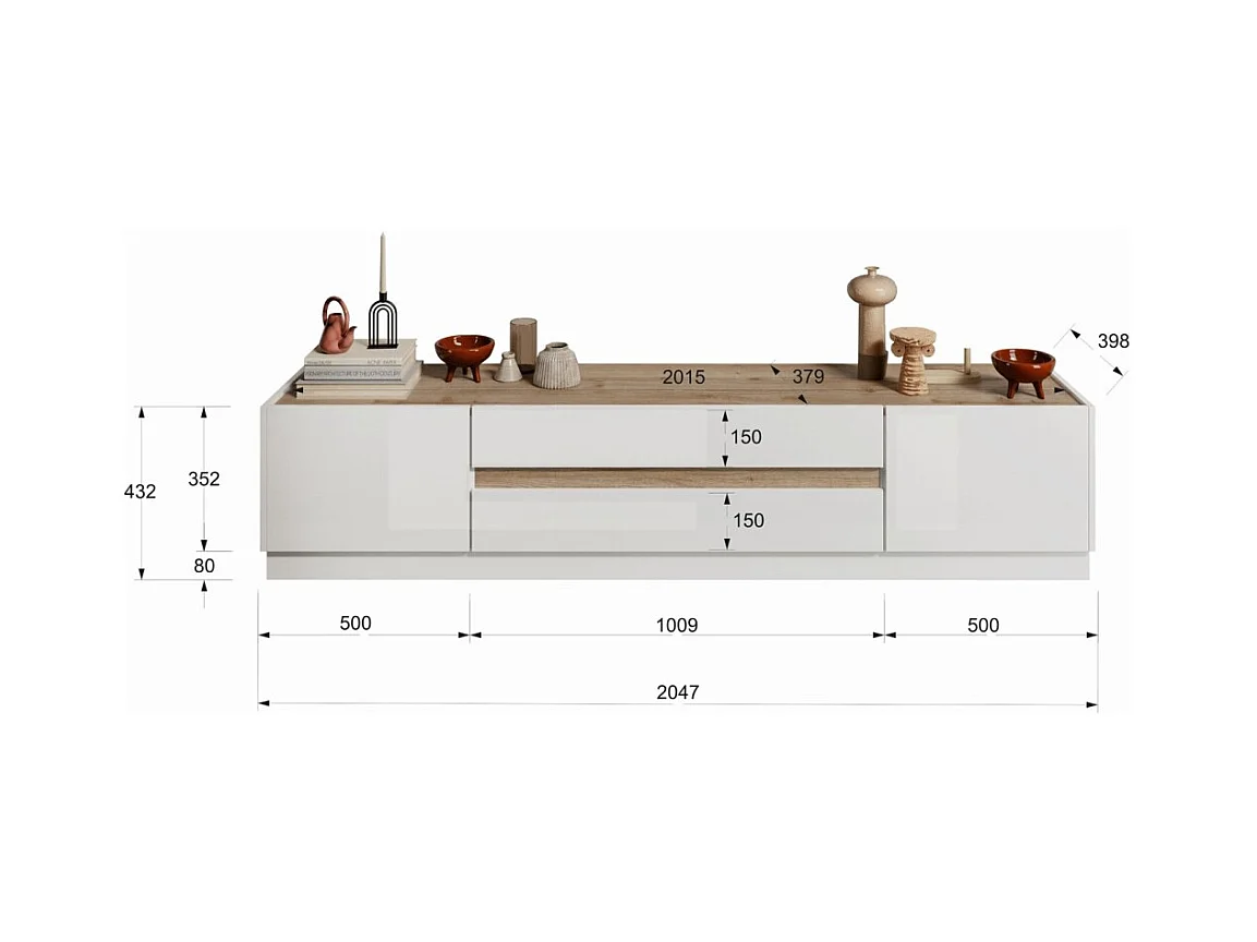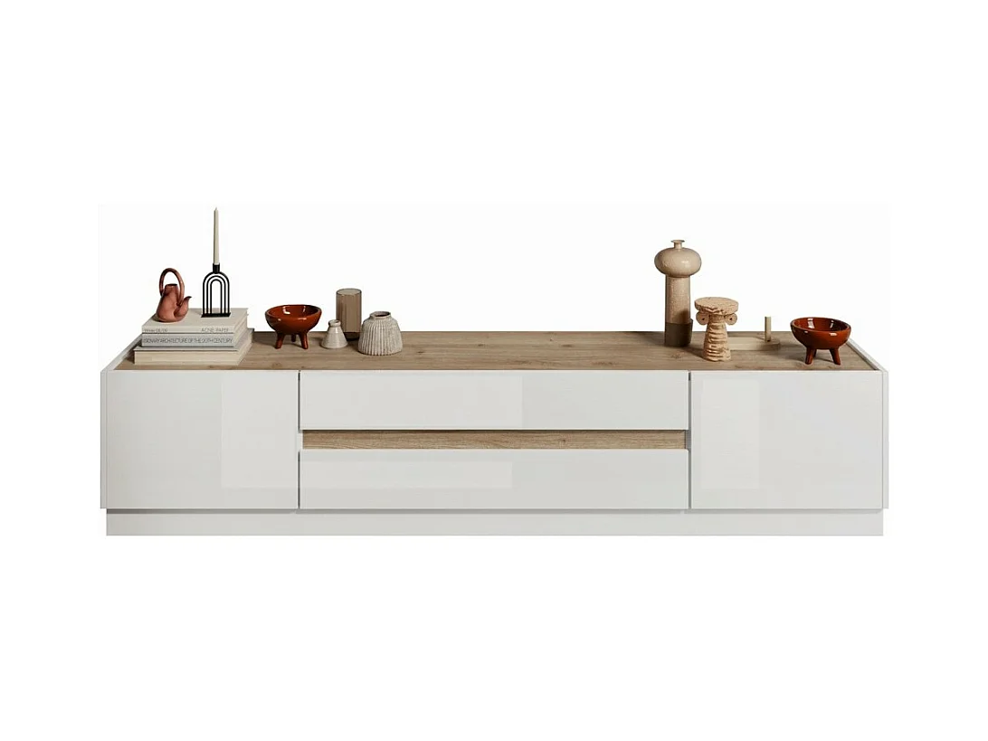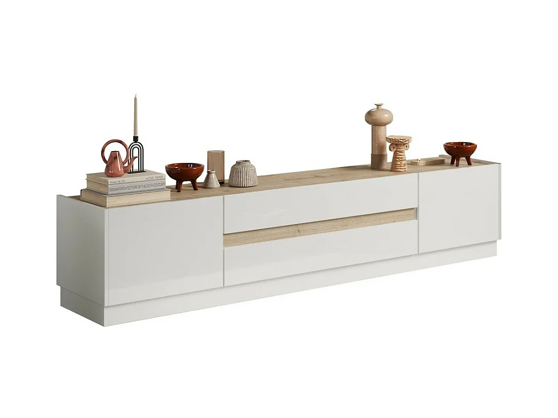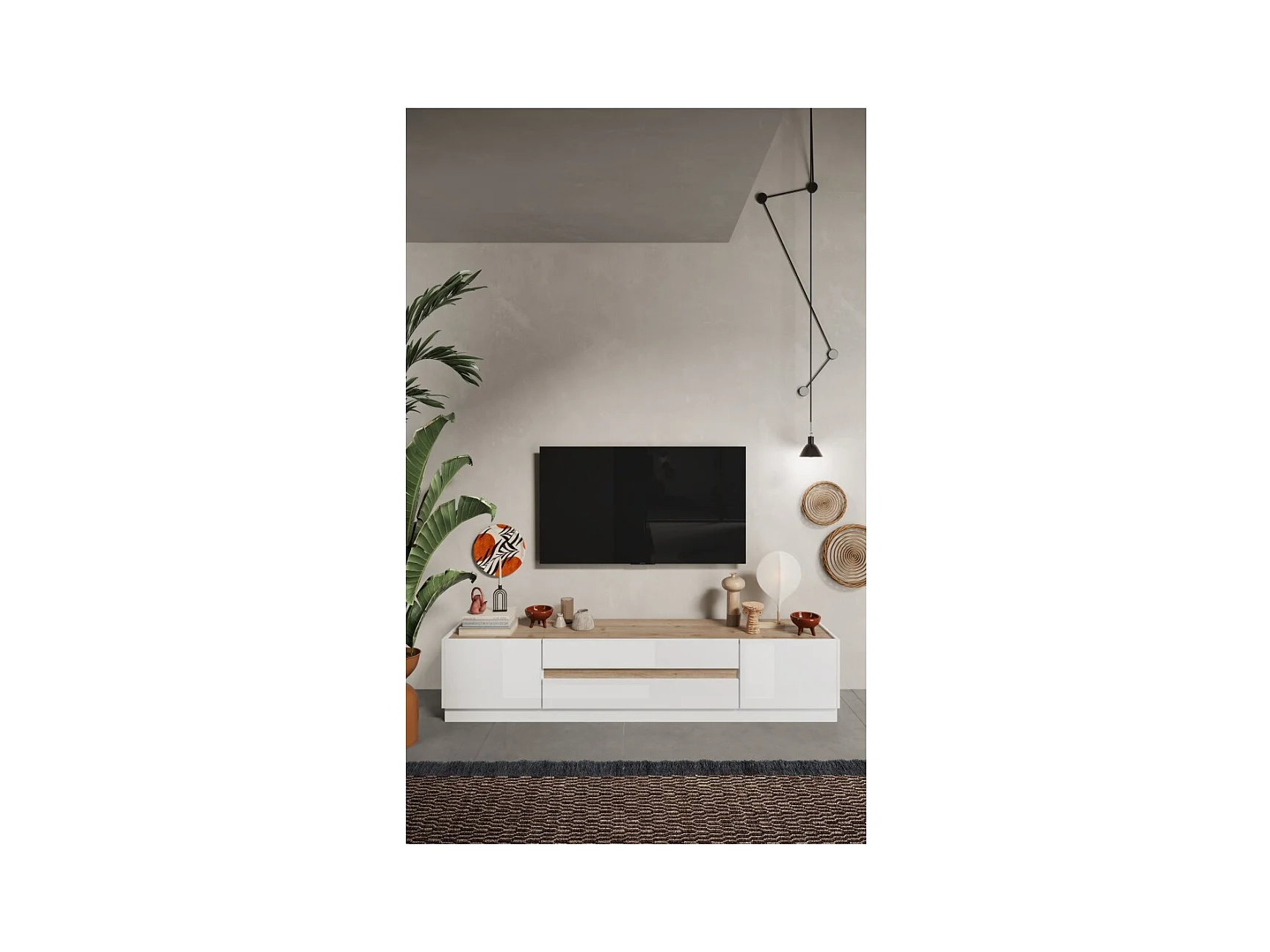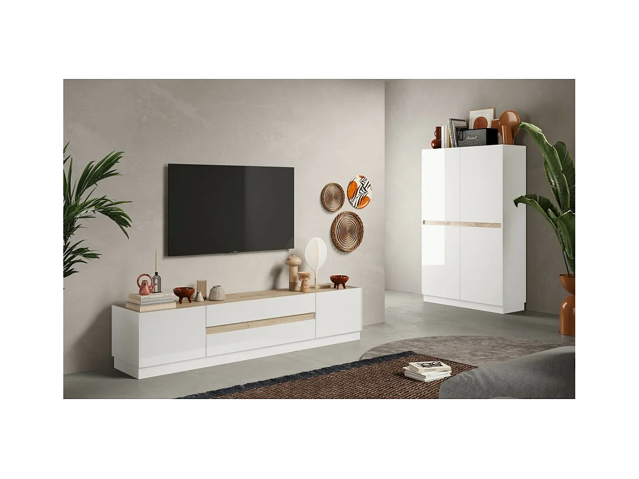 Meuble TV 205cm collection FANZY. Coloris blanc laqué et chêne clair, idéal dans un salon design